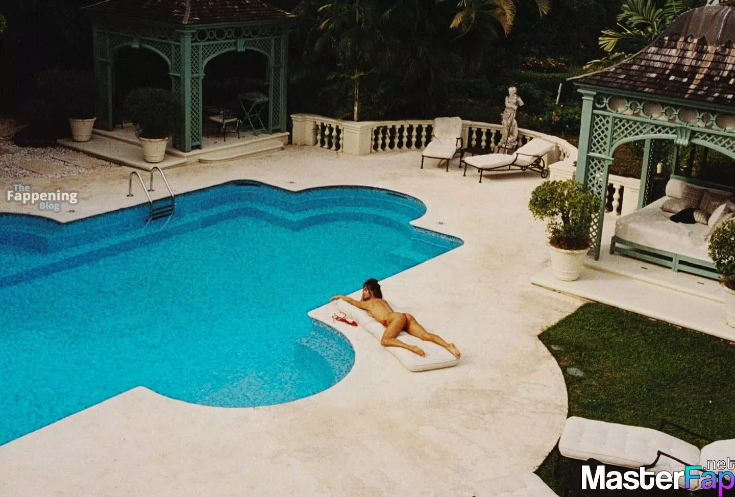 Supermodel Alessandra Ambrosio poses topless and looks hot in a tiny red bikini in the new poolside photos.