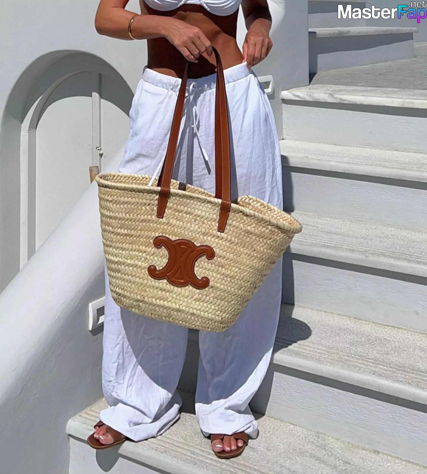 Australian influencer Allie Auton poses in white bikinis on the island of Santorini.