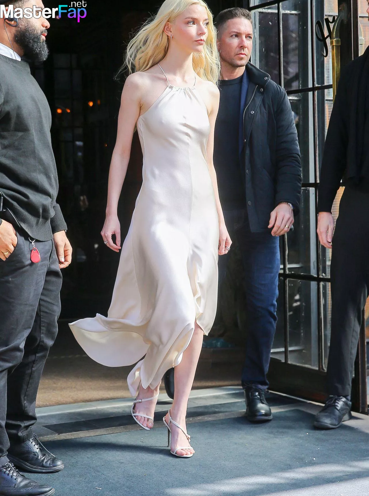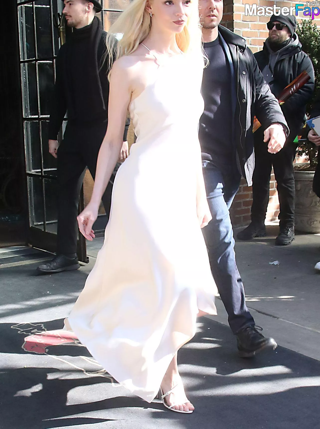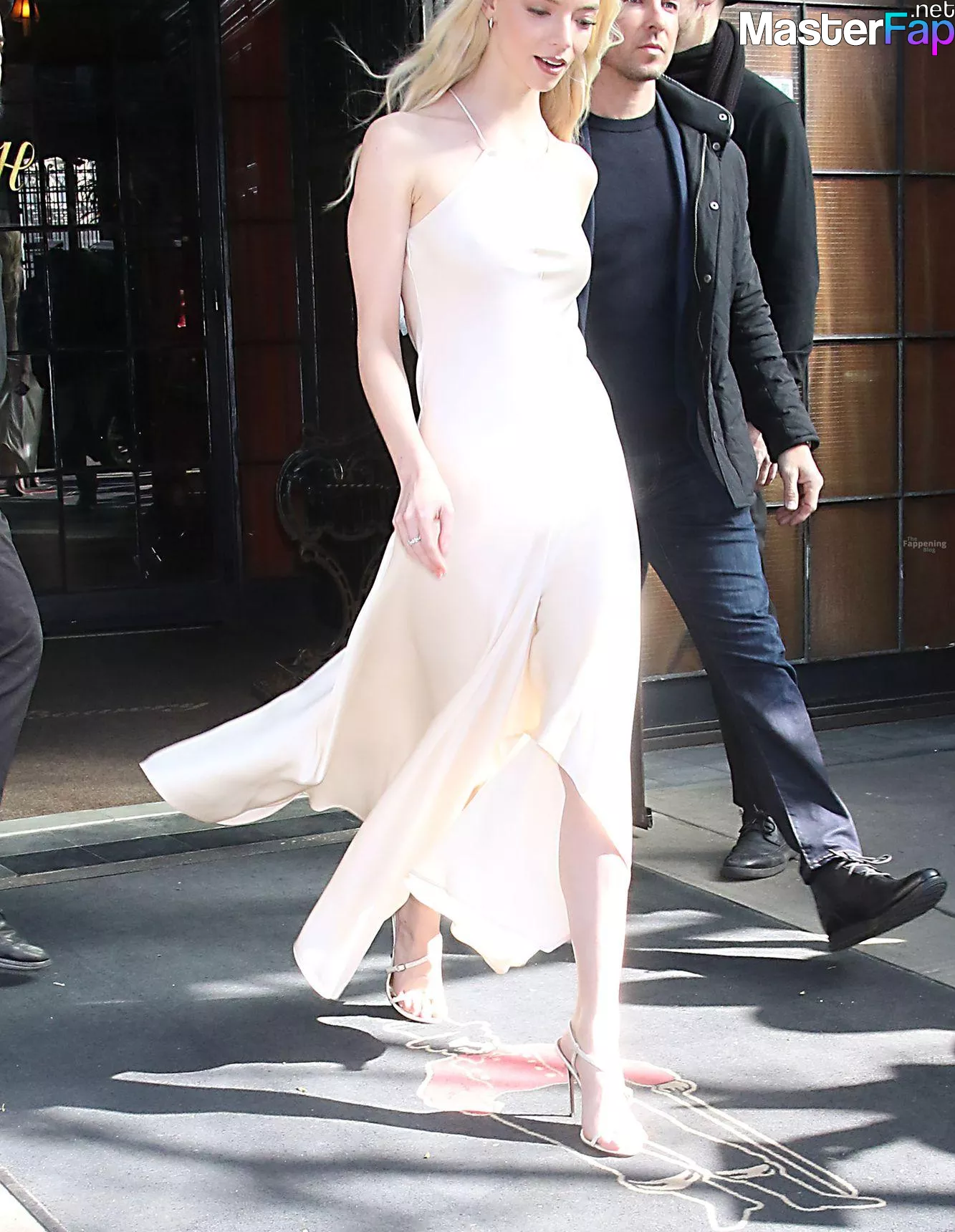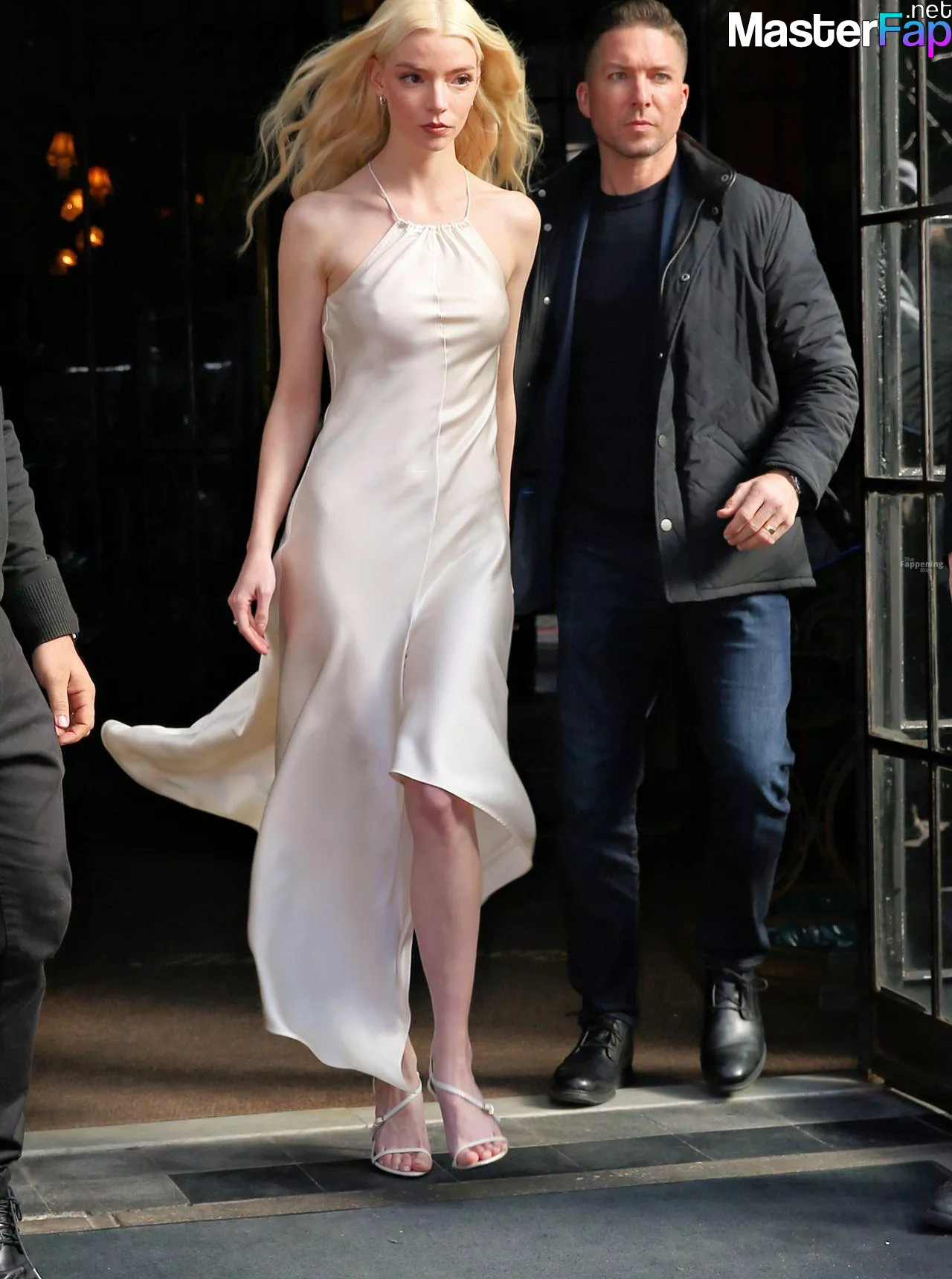 Braless Anya Taylor Joy looked gorgeous as she left The Bowery Hotel wearing a satin white Ralph Lauren dress paired with strappy heels.