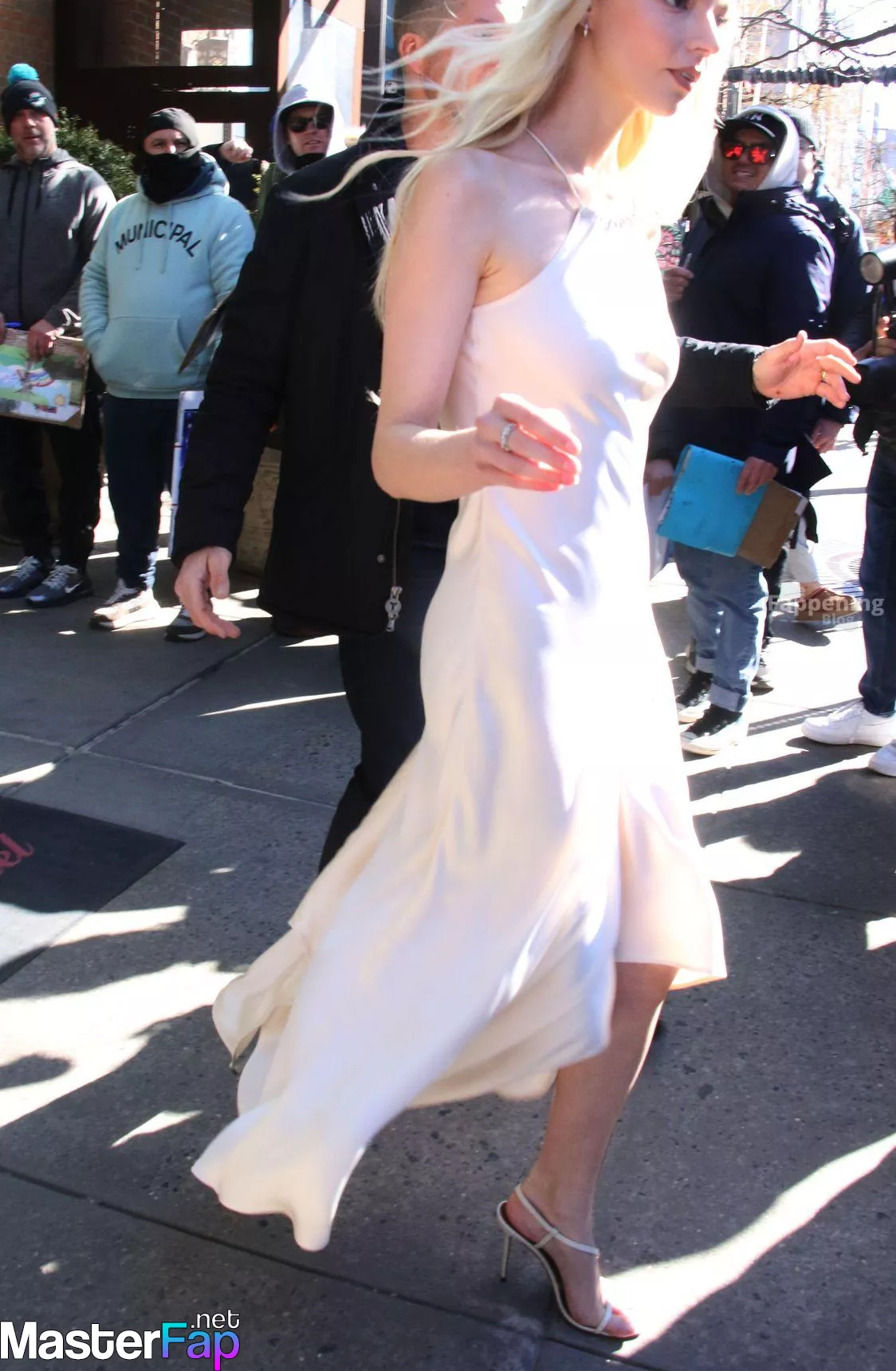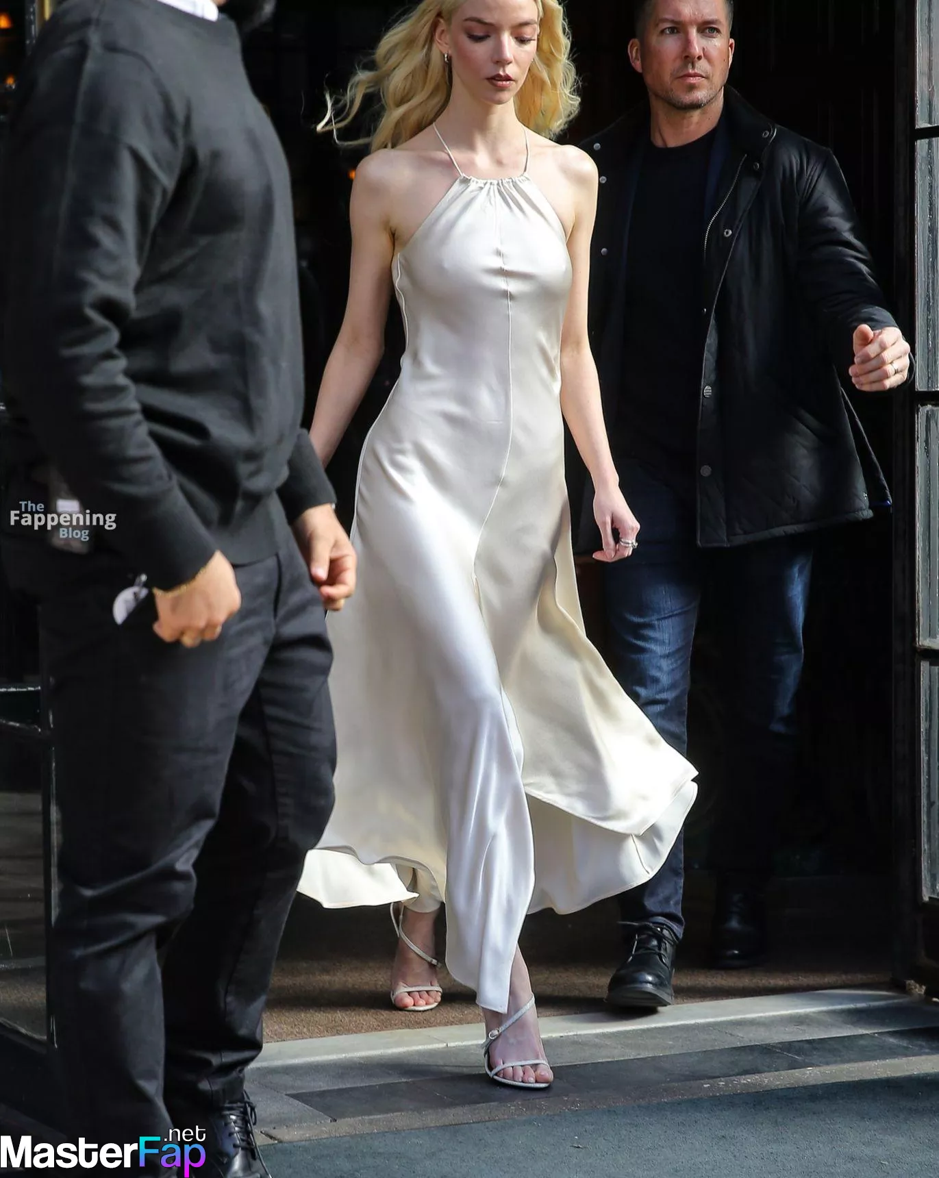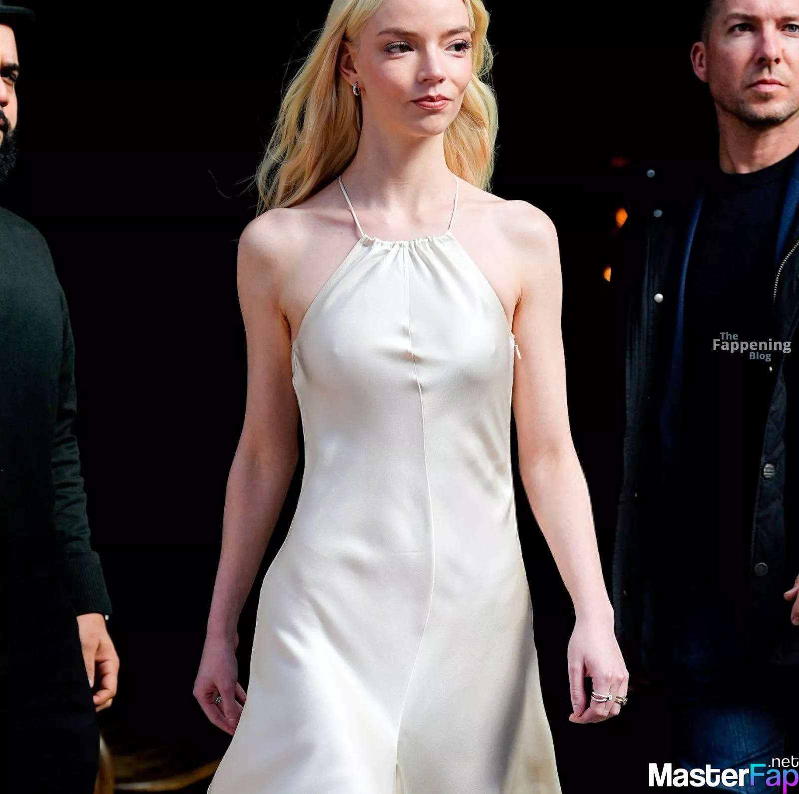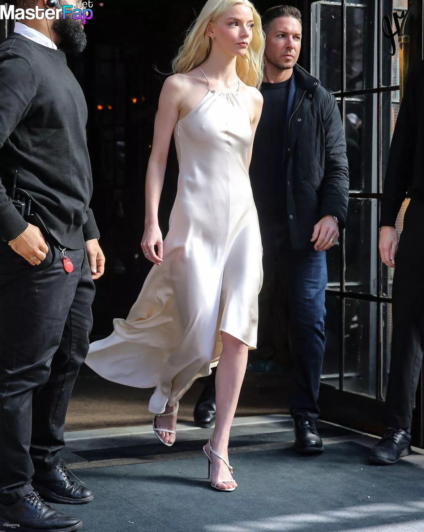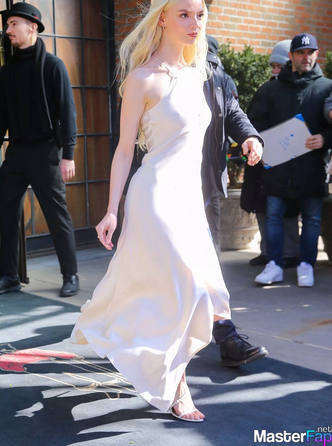 Braless Anya Taylor Joy looked gorgeous as she left The Bowery Hotel wearing a satin white Ralph Lauren dress paired with strappy heels.