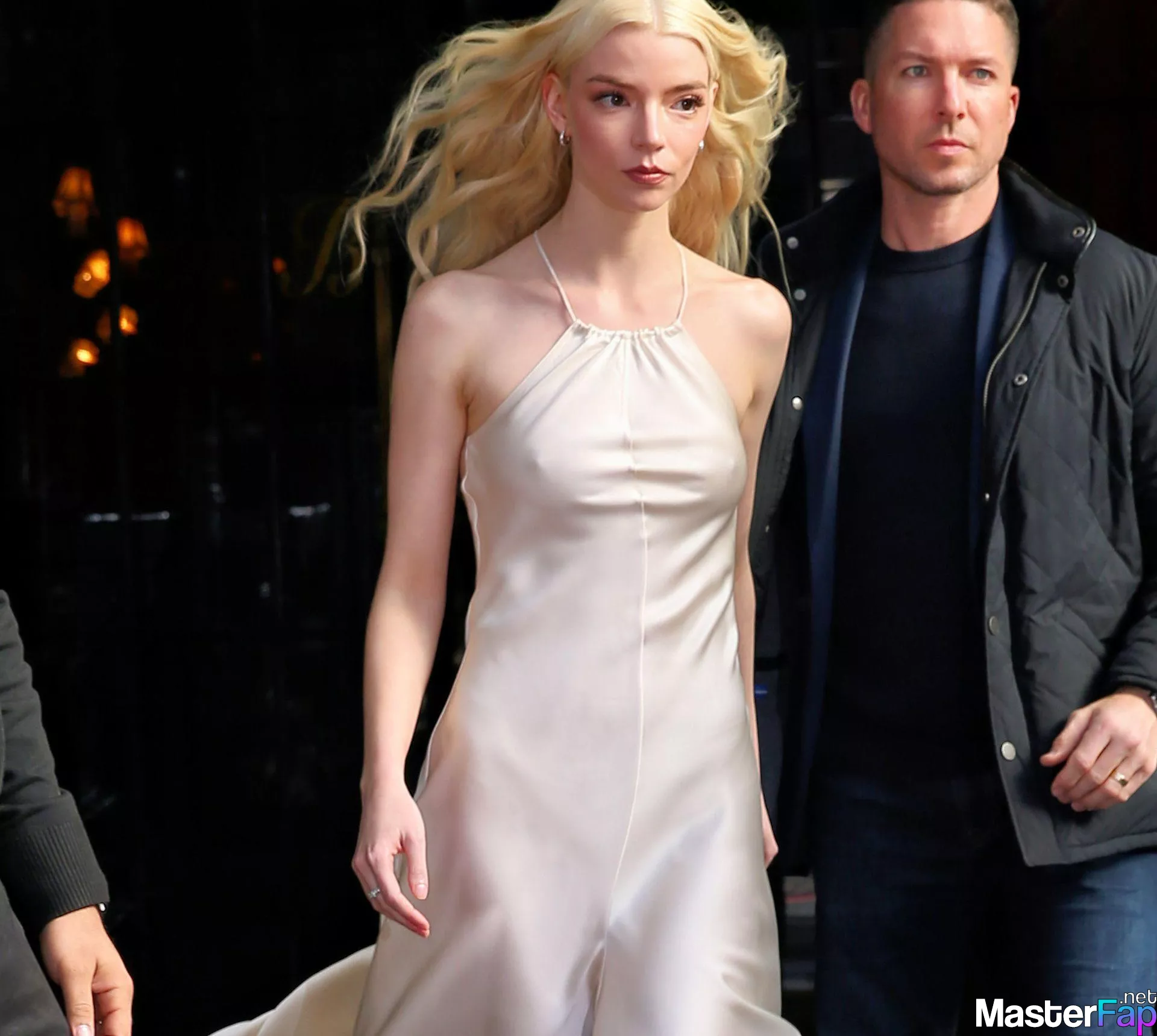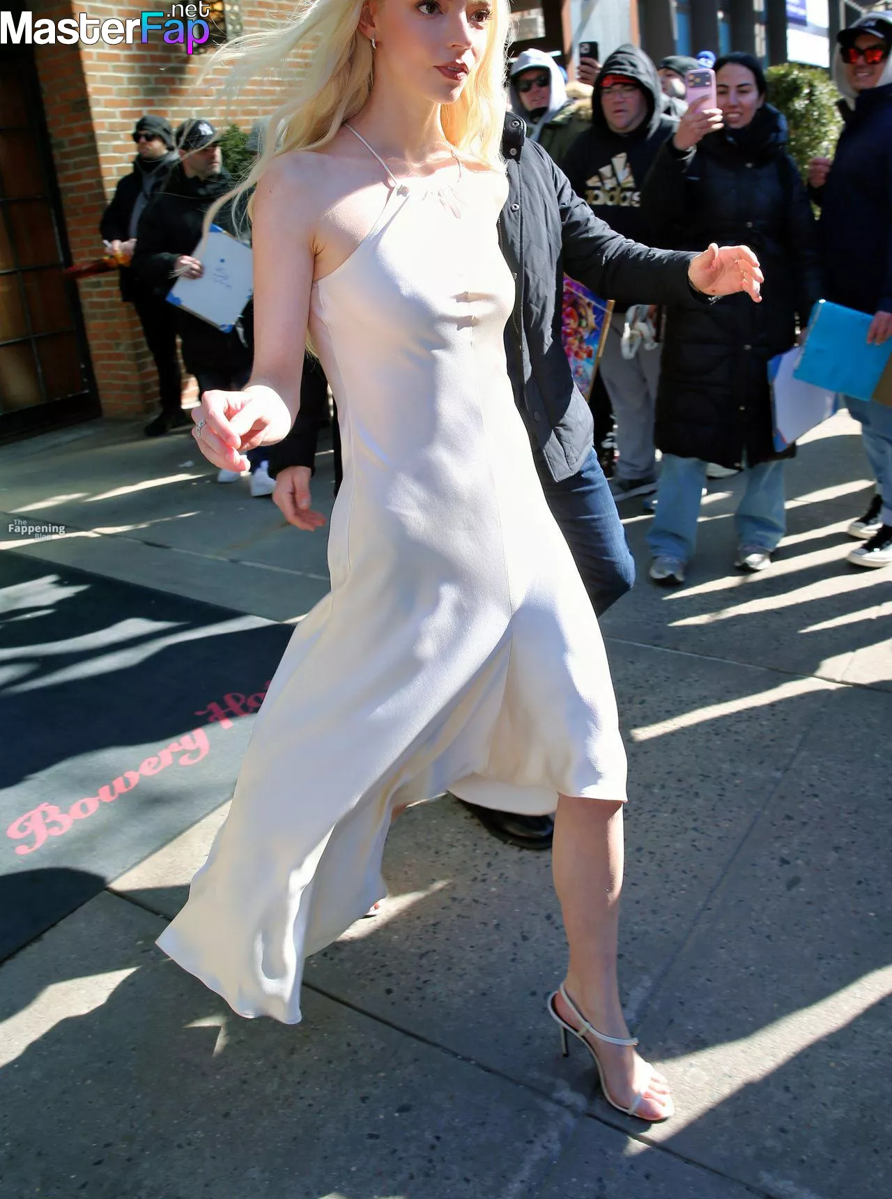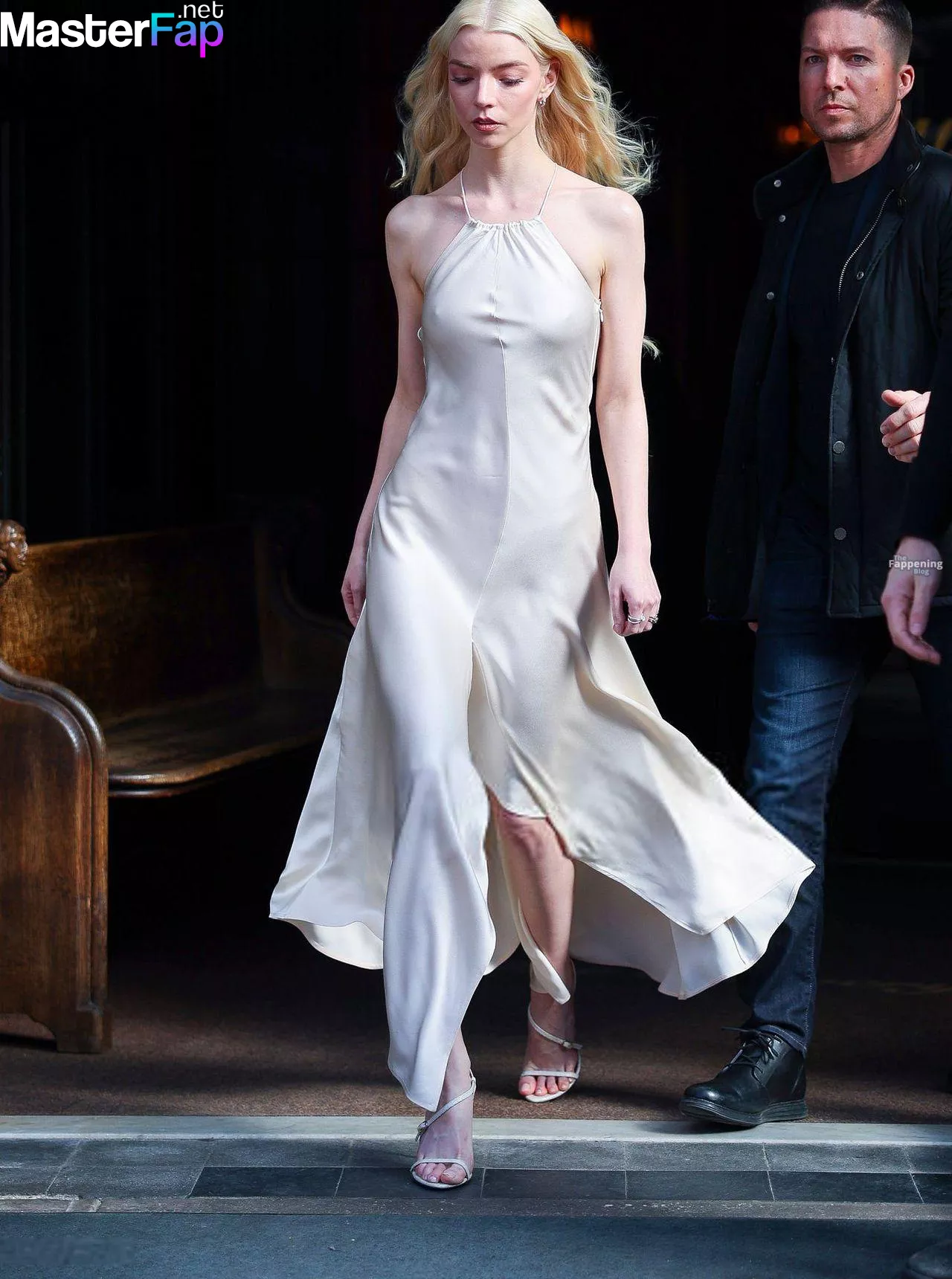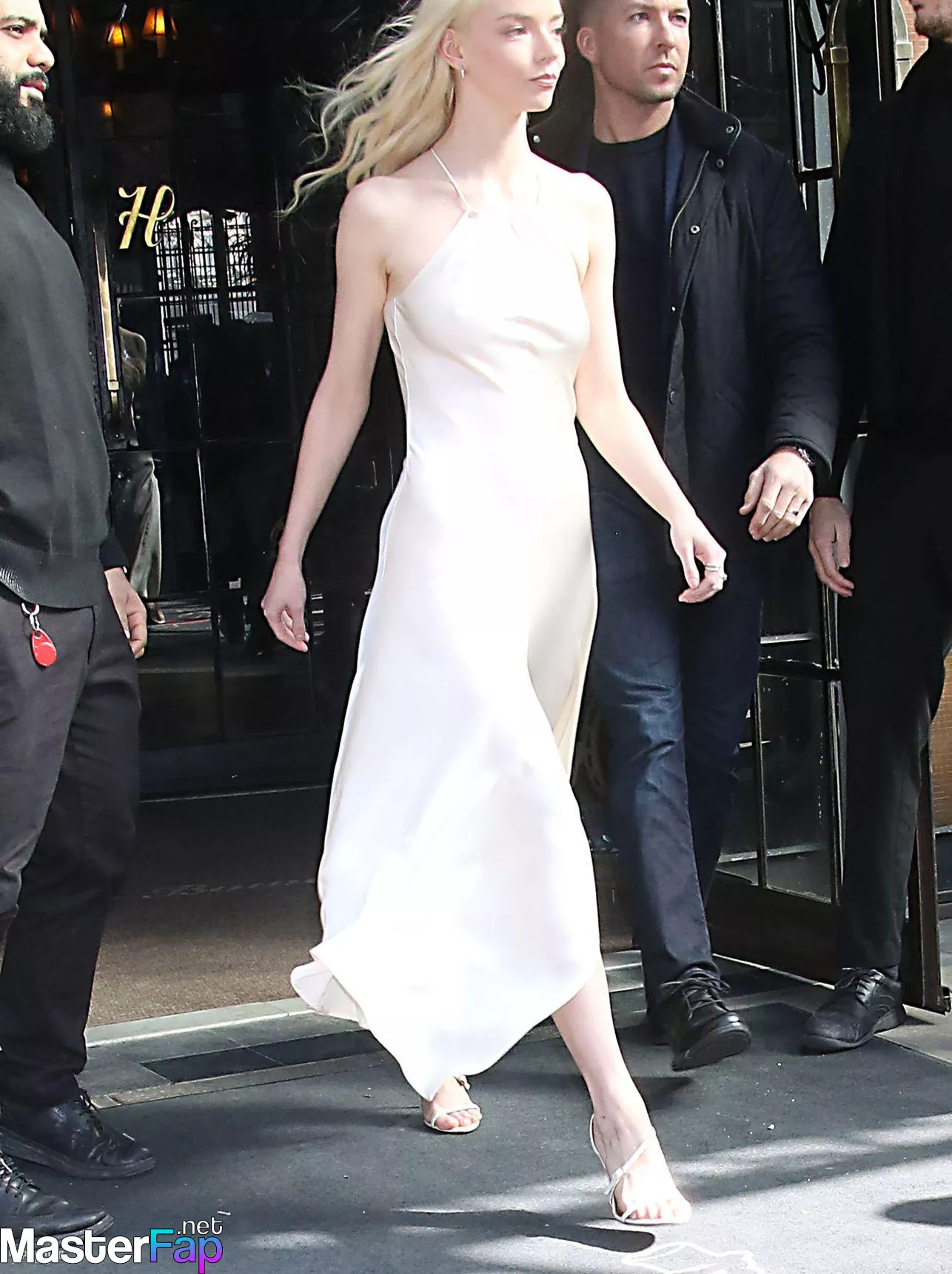 Braless Anya Taylor Joy looked gorgeous as she left The Bowery Hotel wearing a satin white Ralph Lauren dress paired with strappy heels.