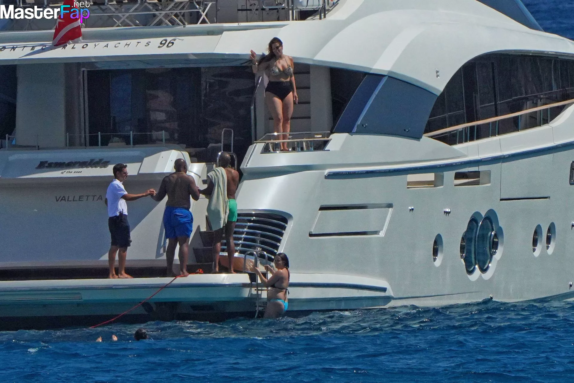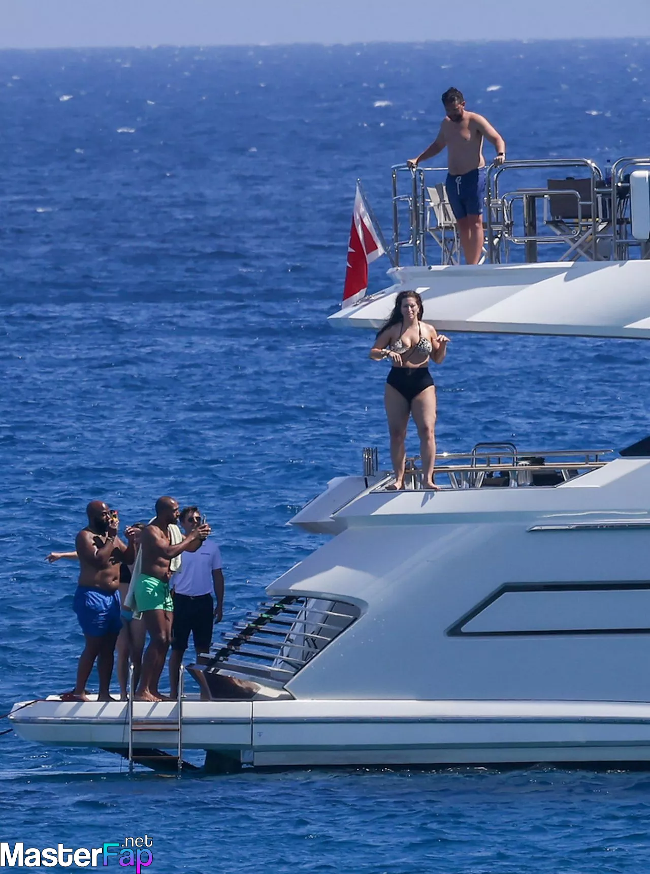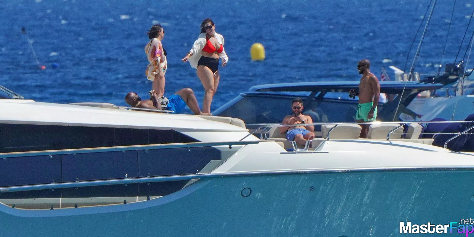 aboard June 10, 2023, a photo was taken of Ashley Graham, Justin Ervin, and the two of their pals enjoying a good time aboard a yacht in Saint Tropez.