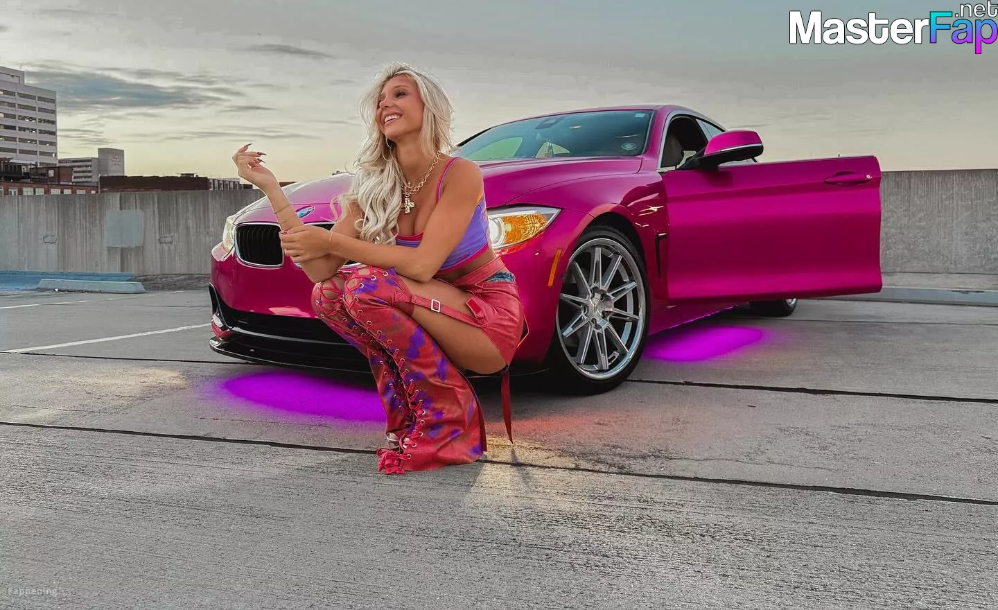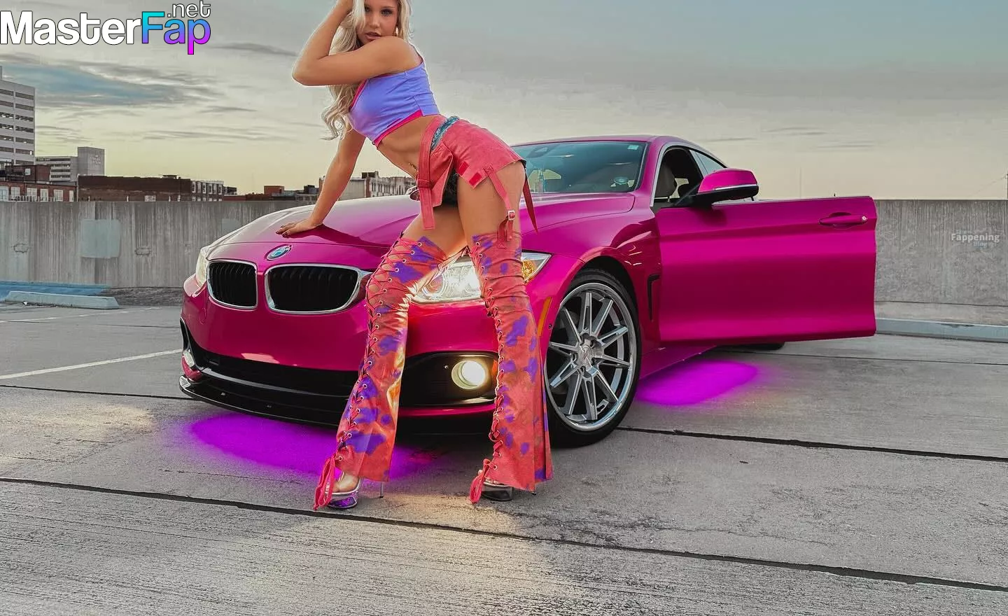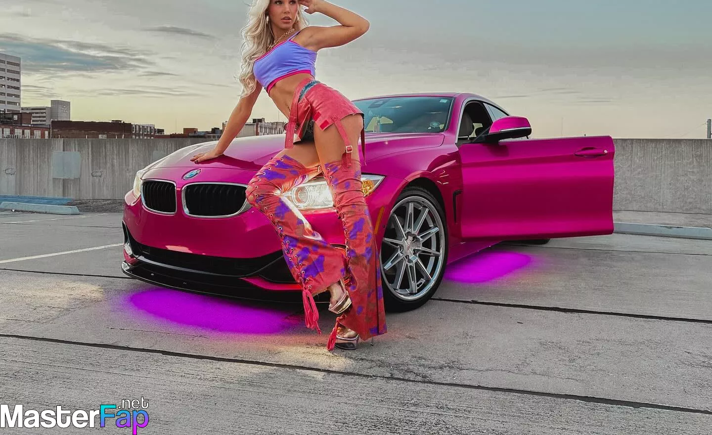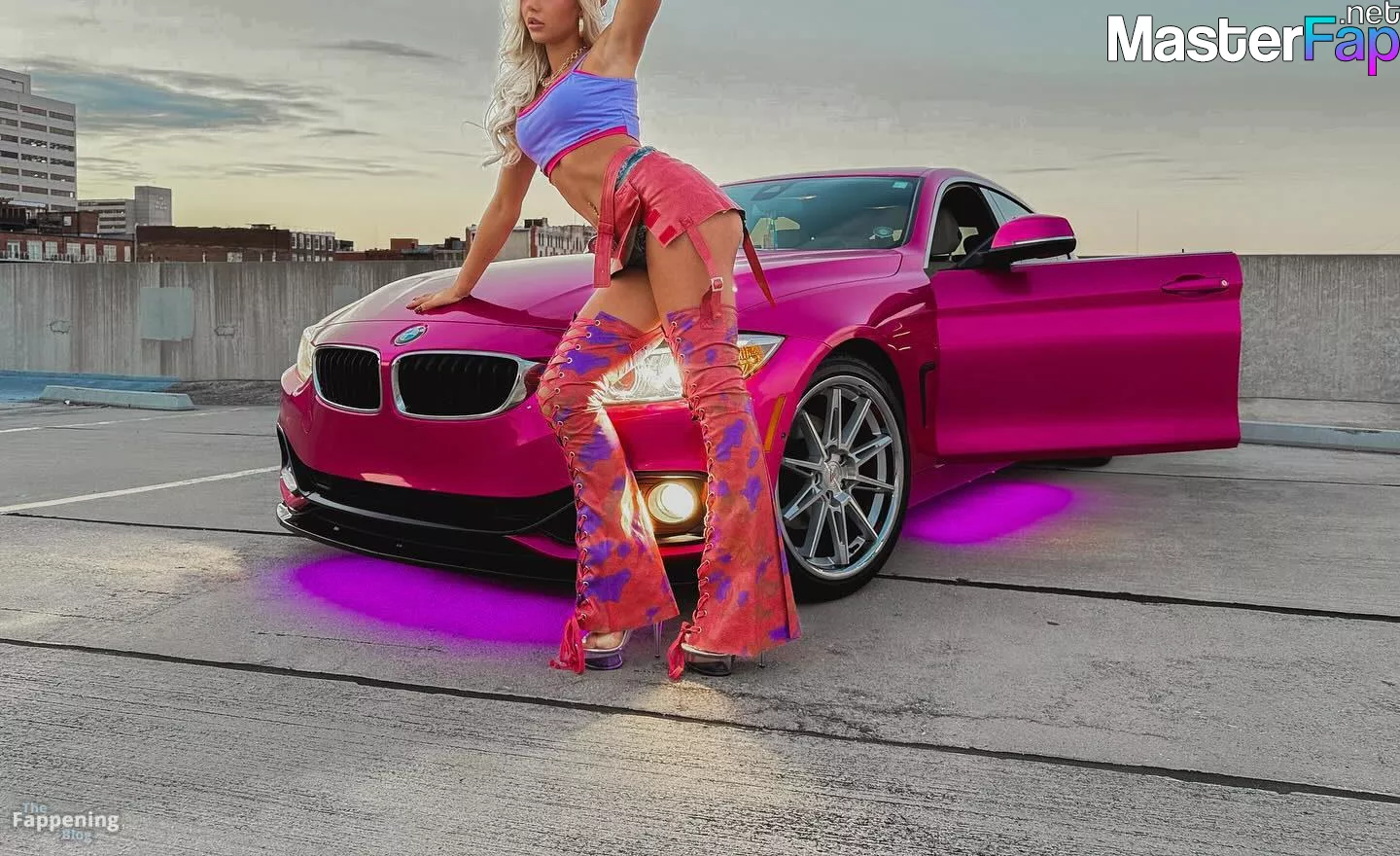 Brooklyn Riley killed it in a rooftop shoot, sportin’ a bright crop top, mini skirt, and boots beside a hot pink BMW.