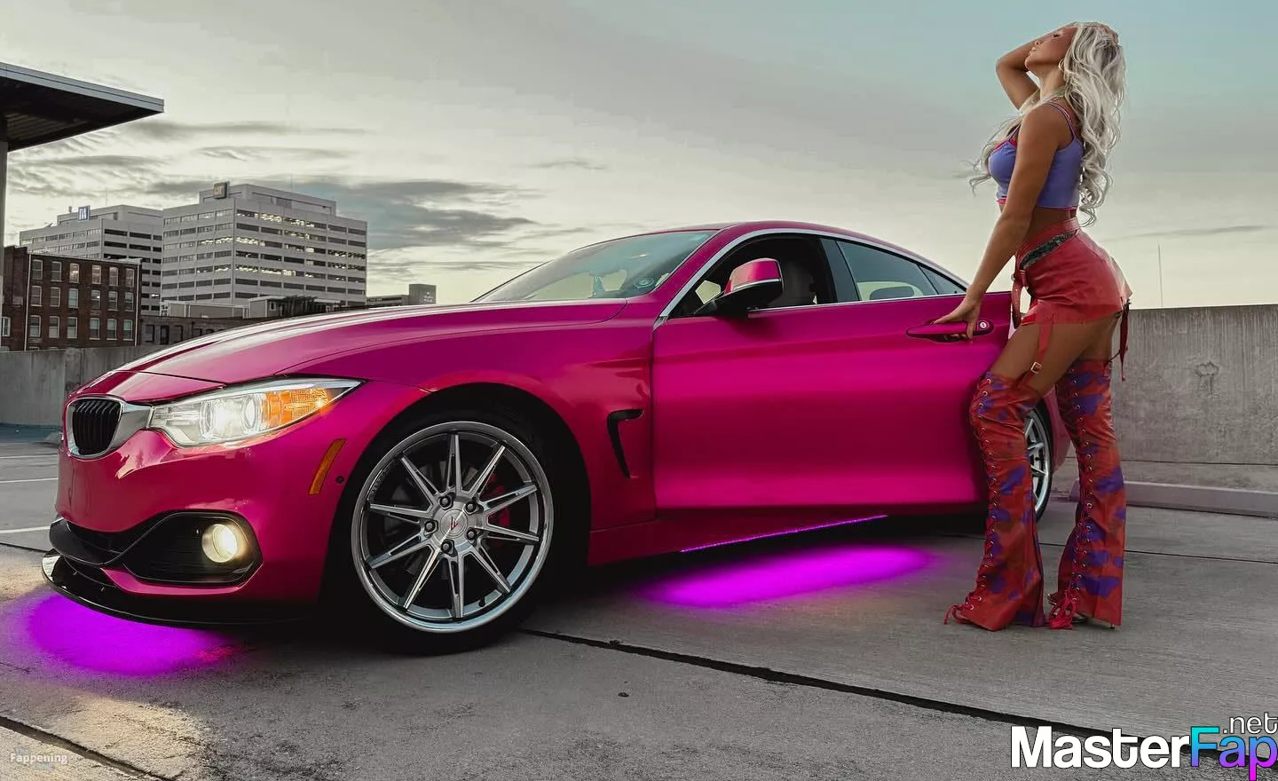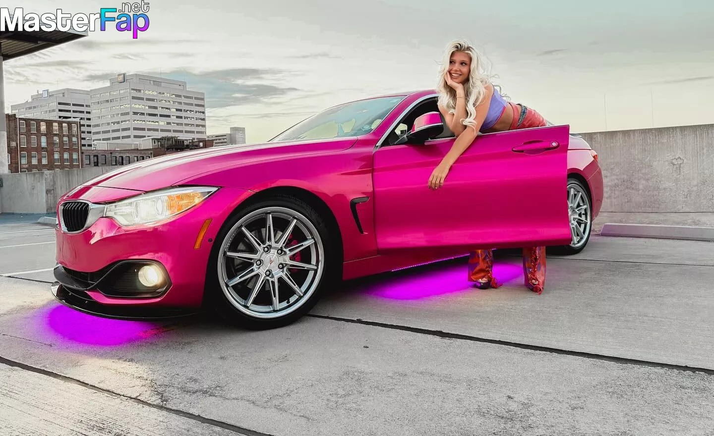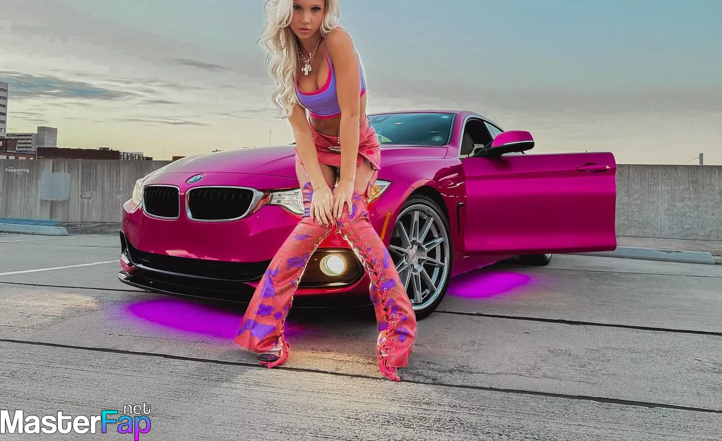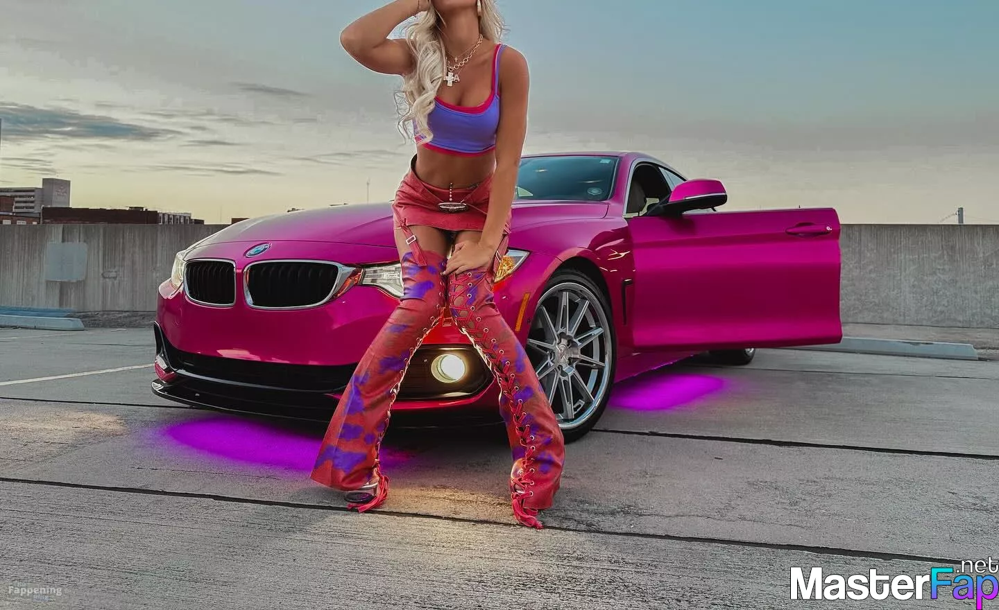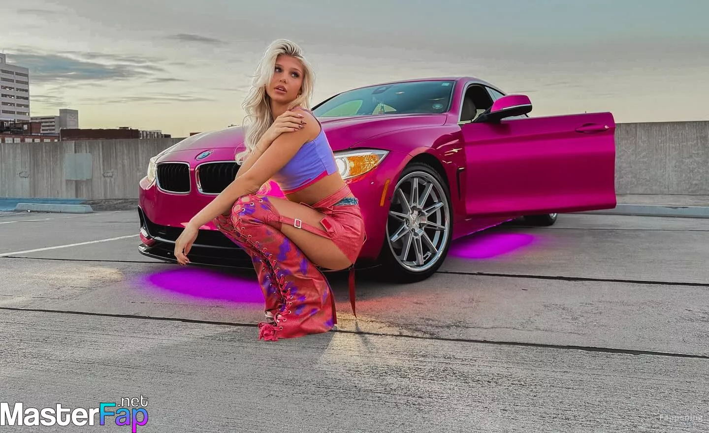 Brooklyn Riley killed it in a rooftop shoot, sportin’ a bright crop top, mini skirt, and boots beside a hot pink BMW.