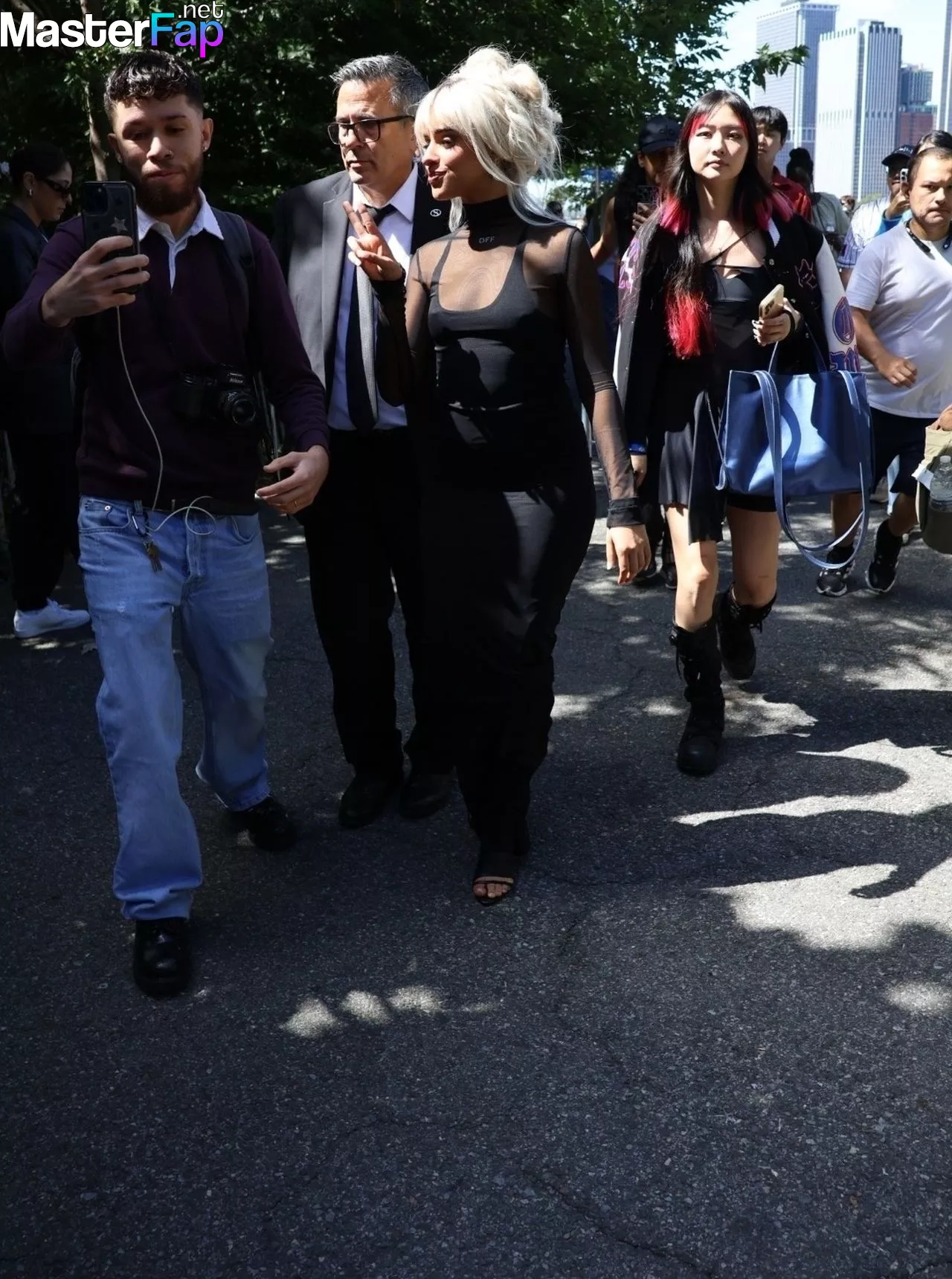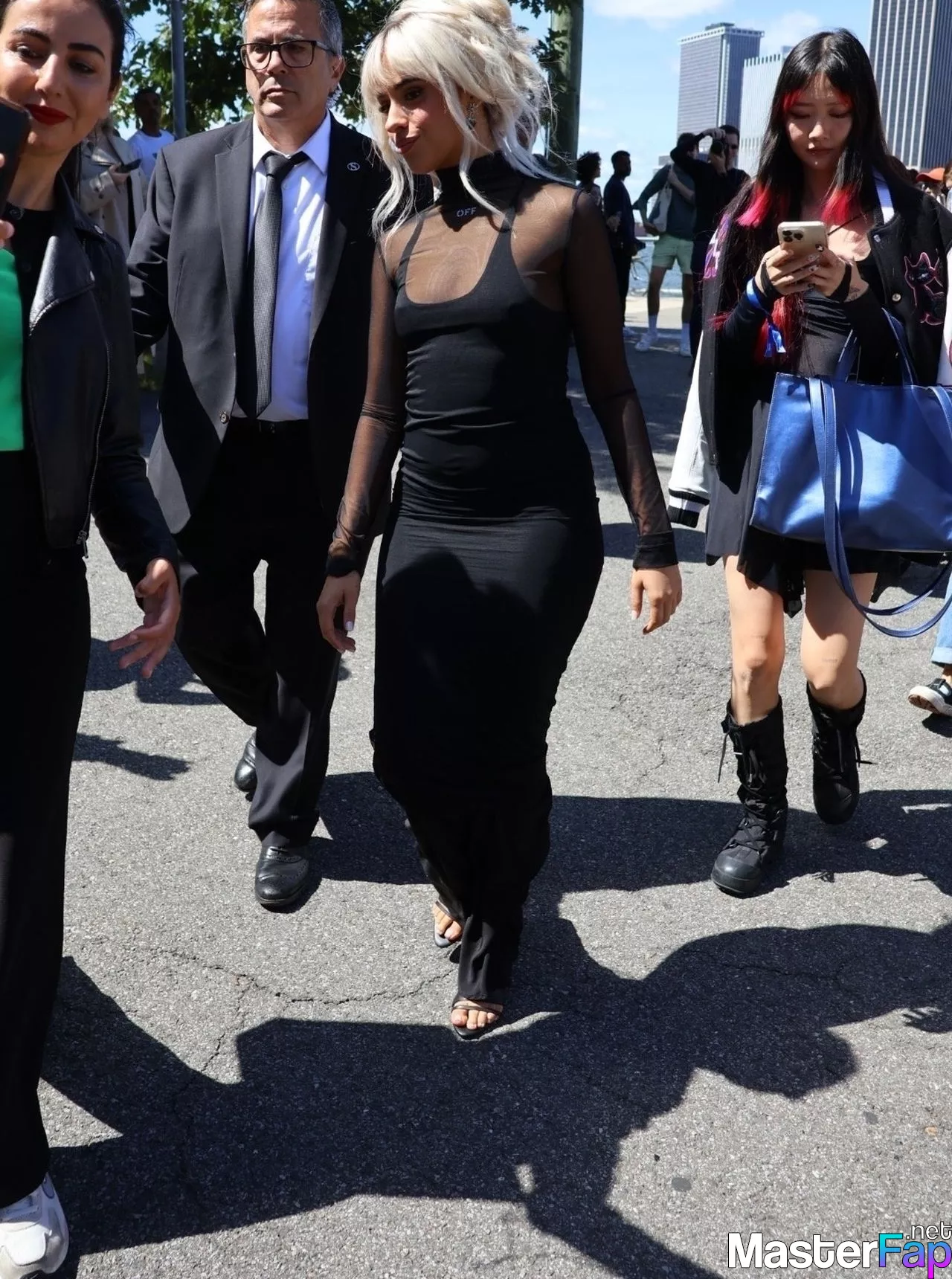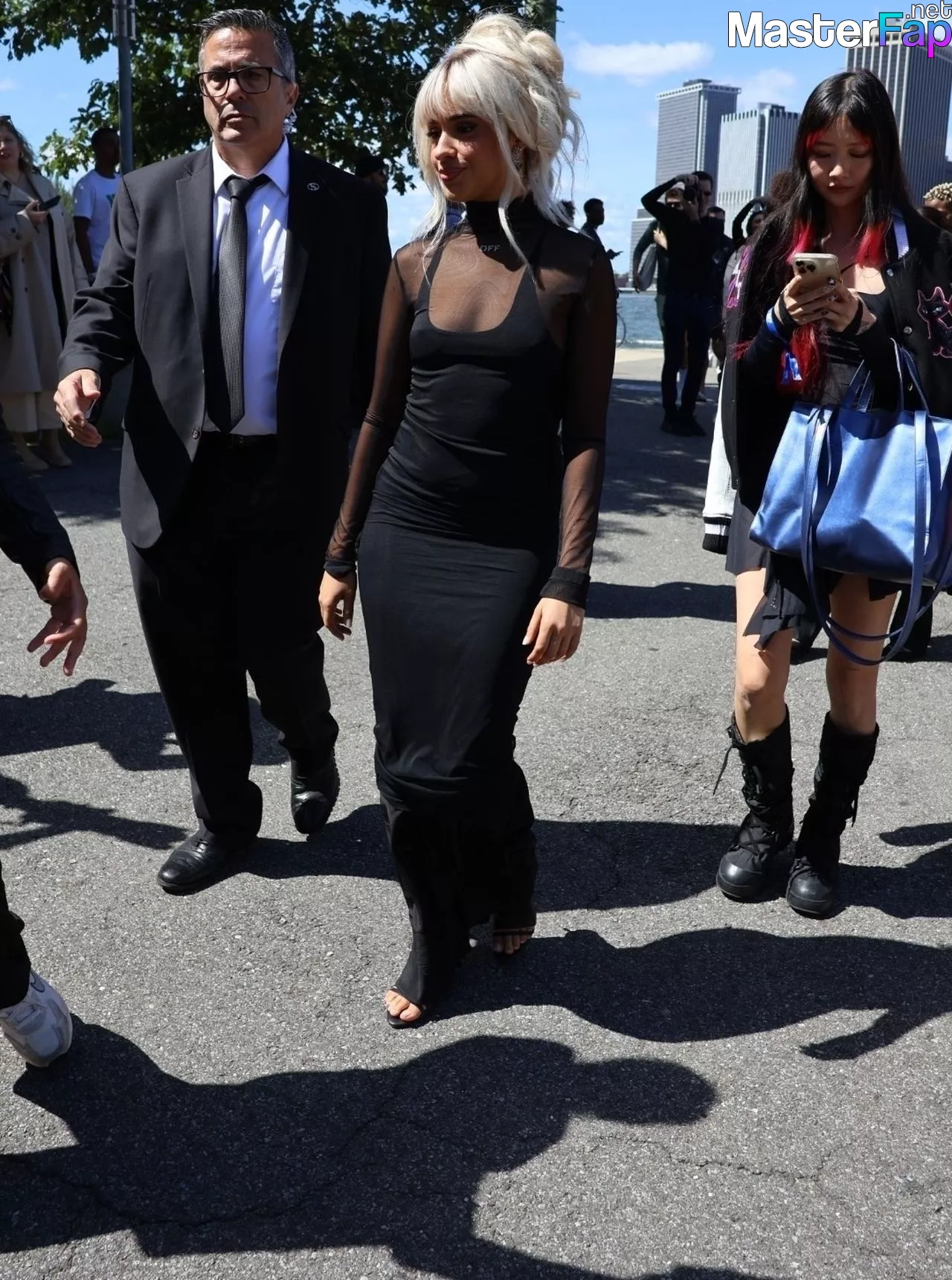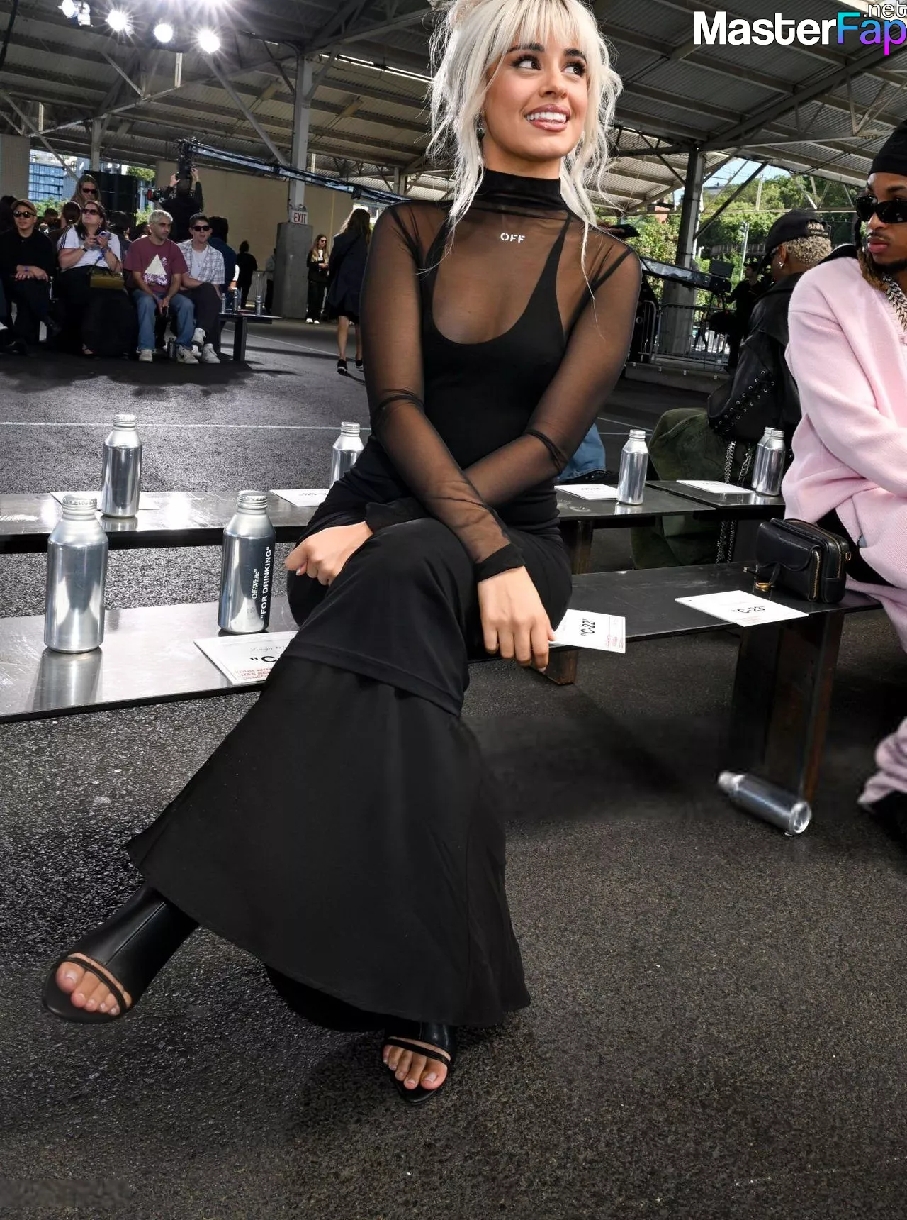 Camila Cabello is seen in a bold black dress at the Off-White fashion show in NYC, going braless and flaunting some serious pokies. She hit up the event during New York Fashion Week.