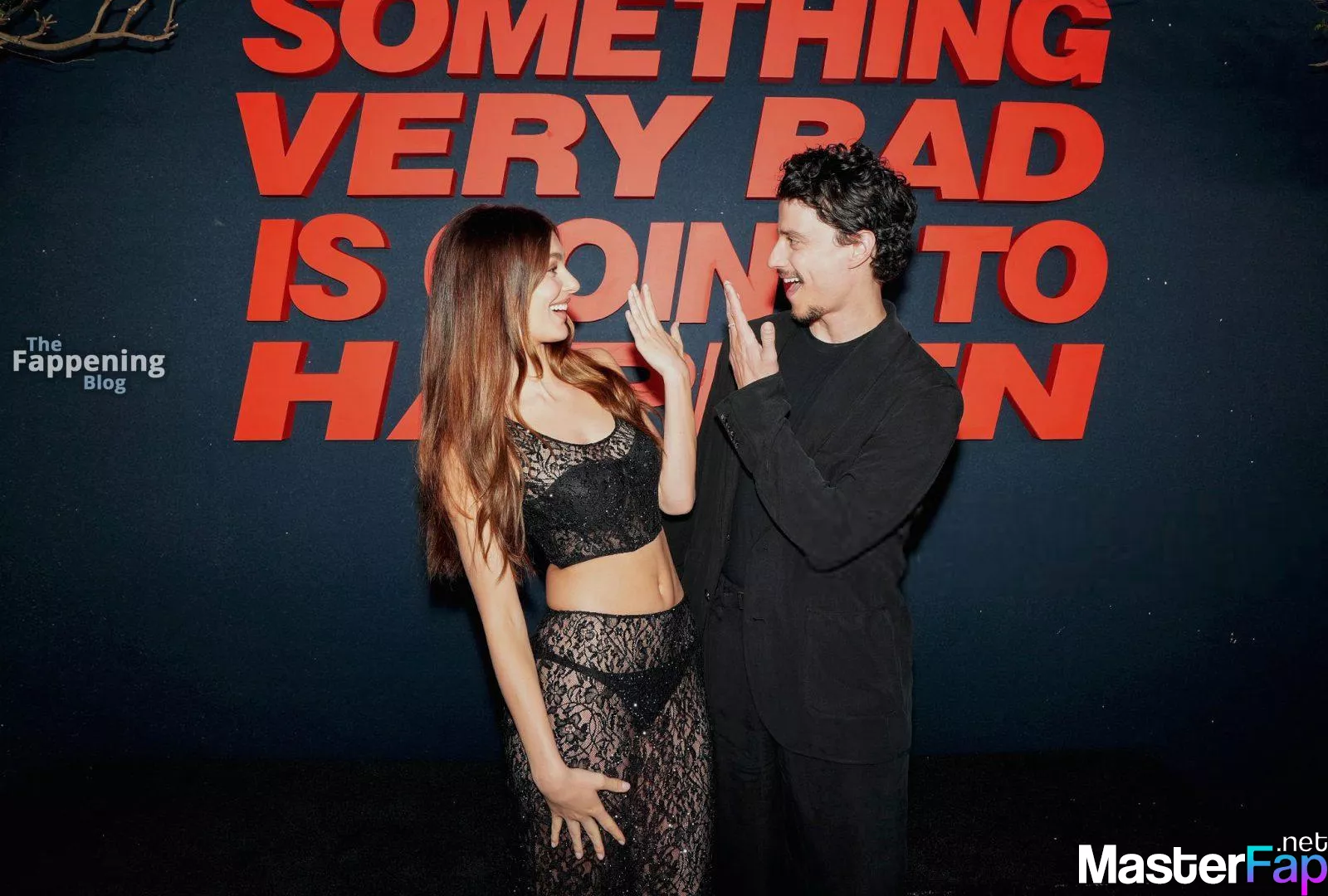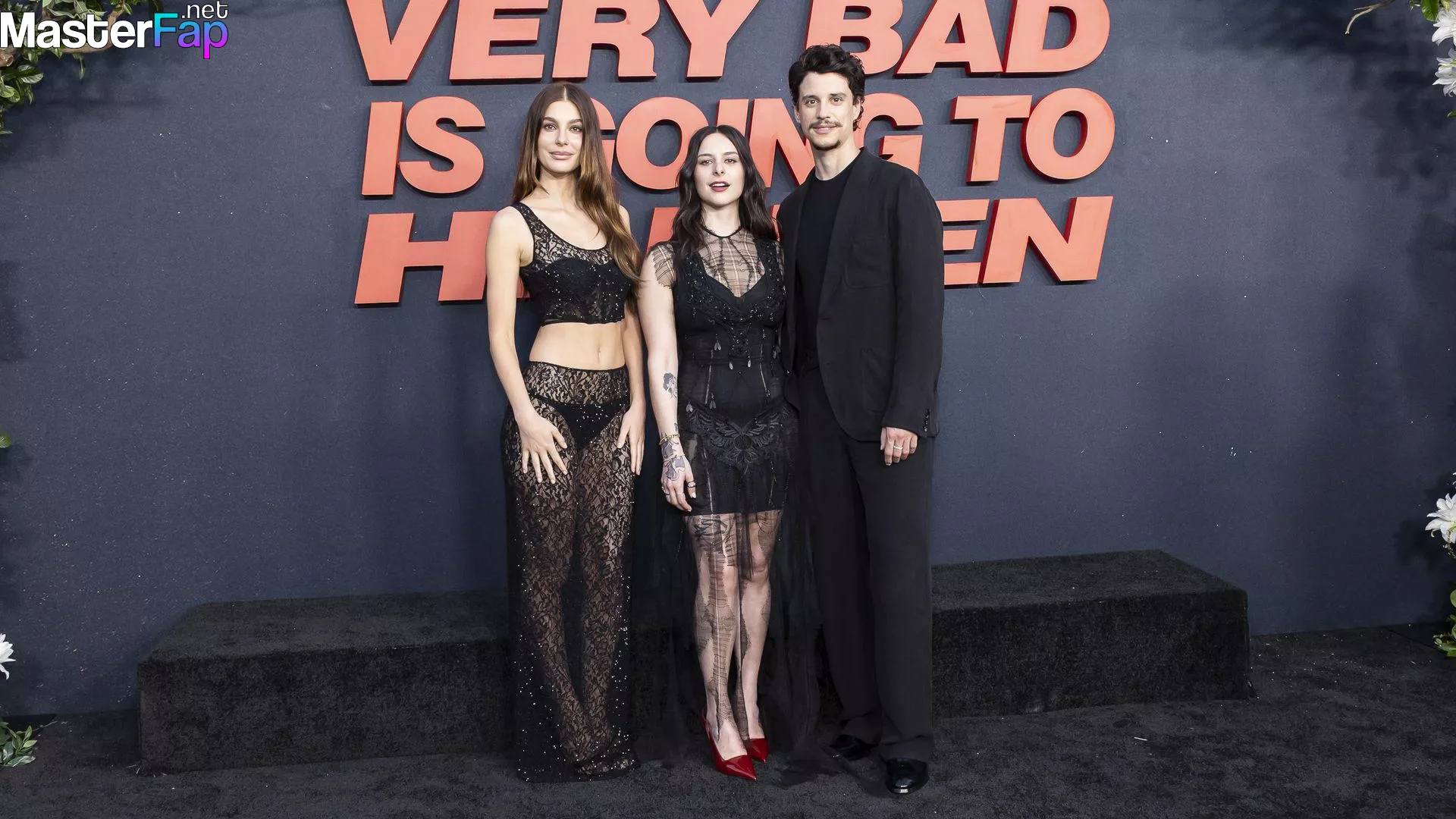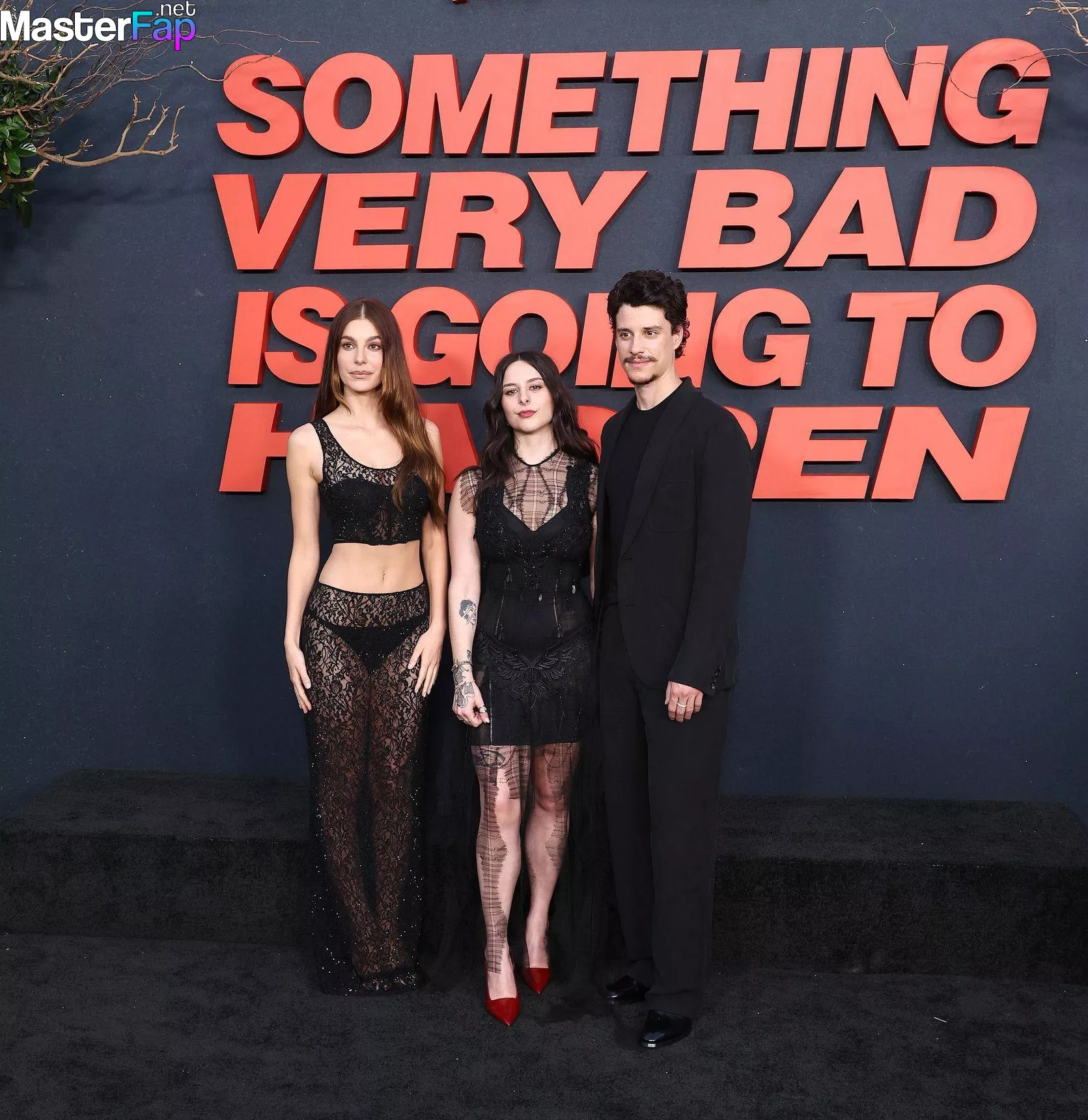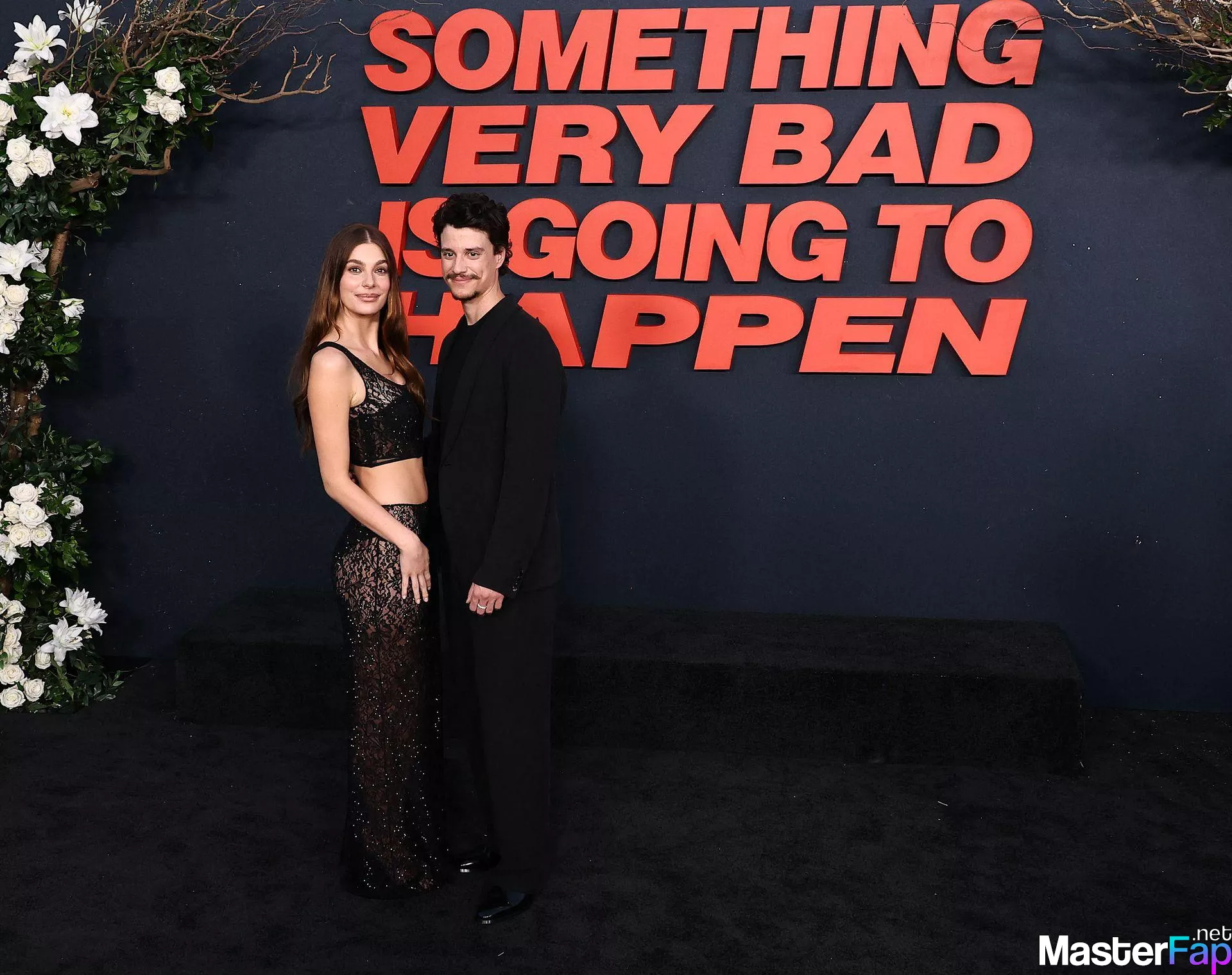 Camila Morrone poses in a black see-through ensemble on the red carpet of the “Something Very Bad Is Going to Happen” LA premiere.