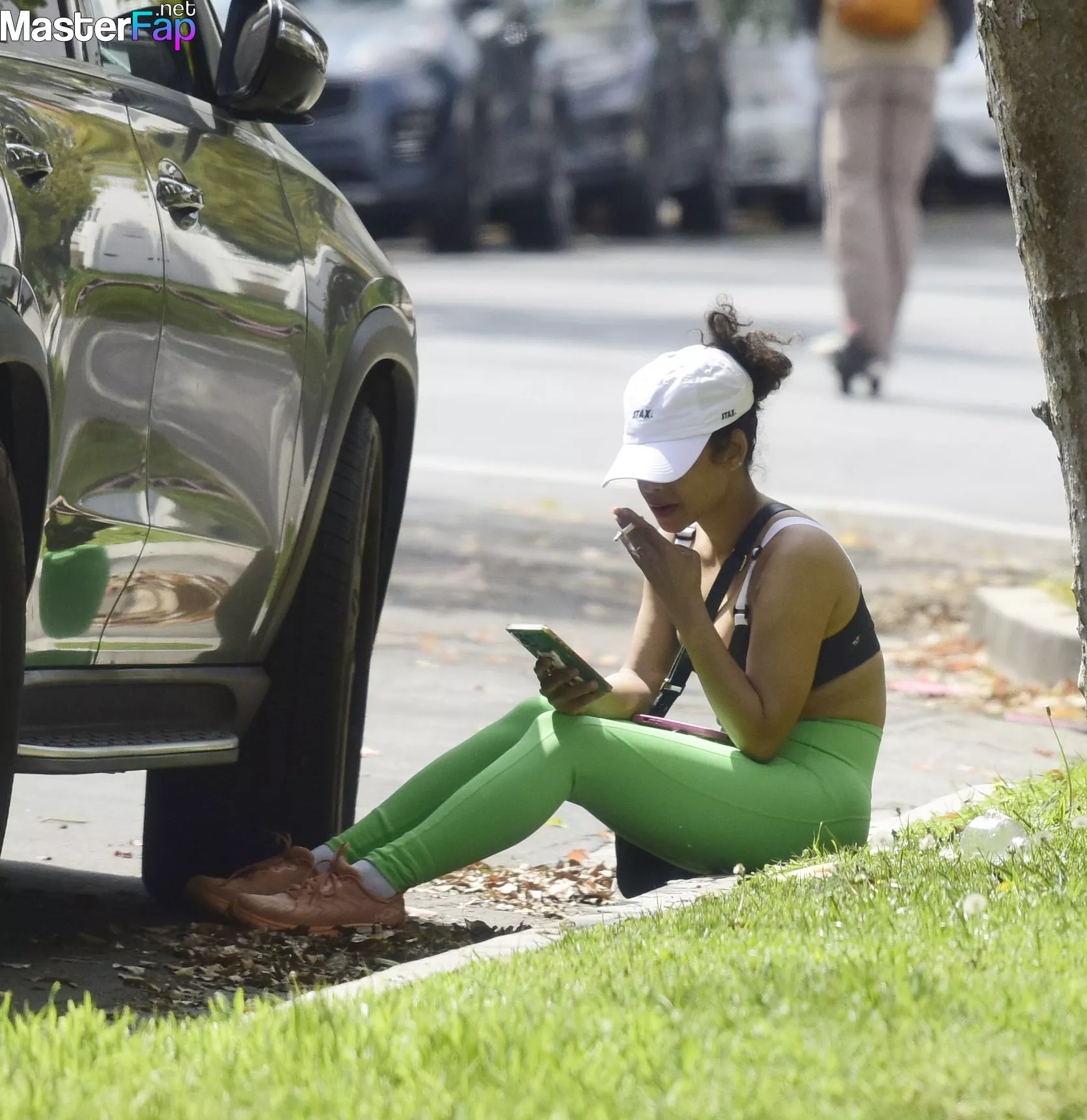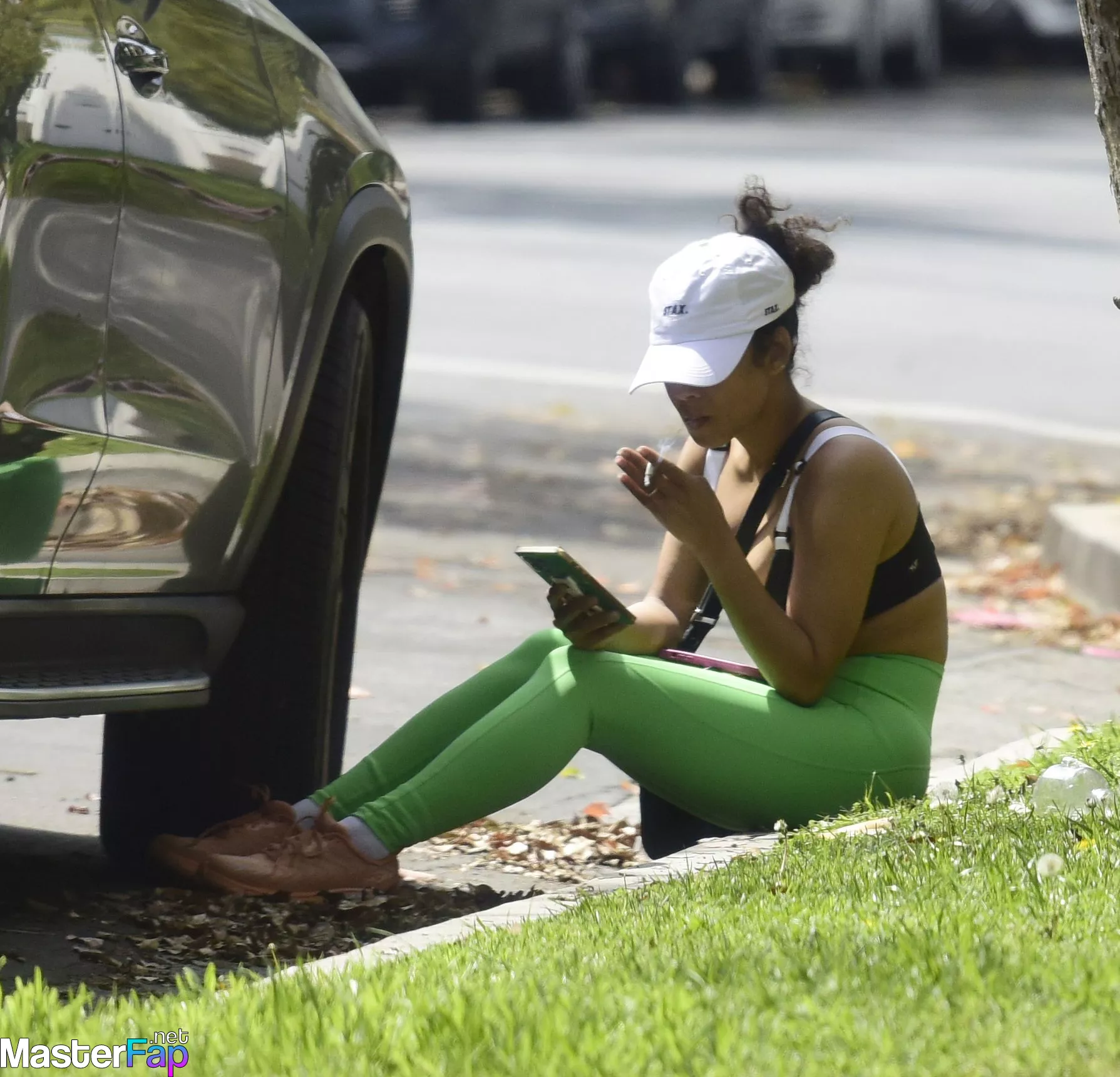 During her exercise on April 19, 2023 in Los Angeles, Christina Milian pulls over to the side of the road to take a cigarette. The American singer and actress was seen in public wearing a cream-colored fleece, a neon green sports bra, neon green leggings, and pink athletic shoes.