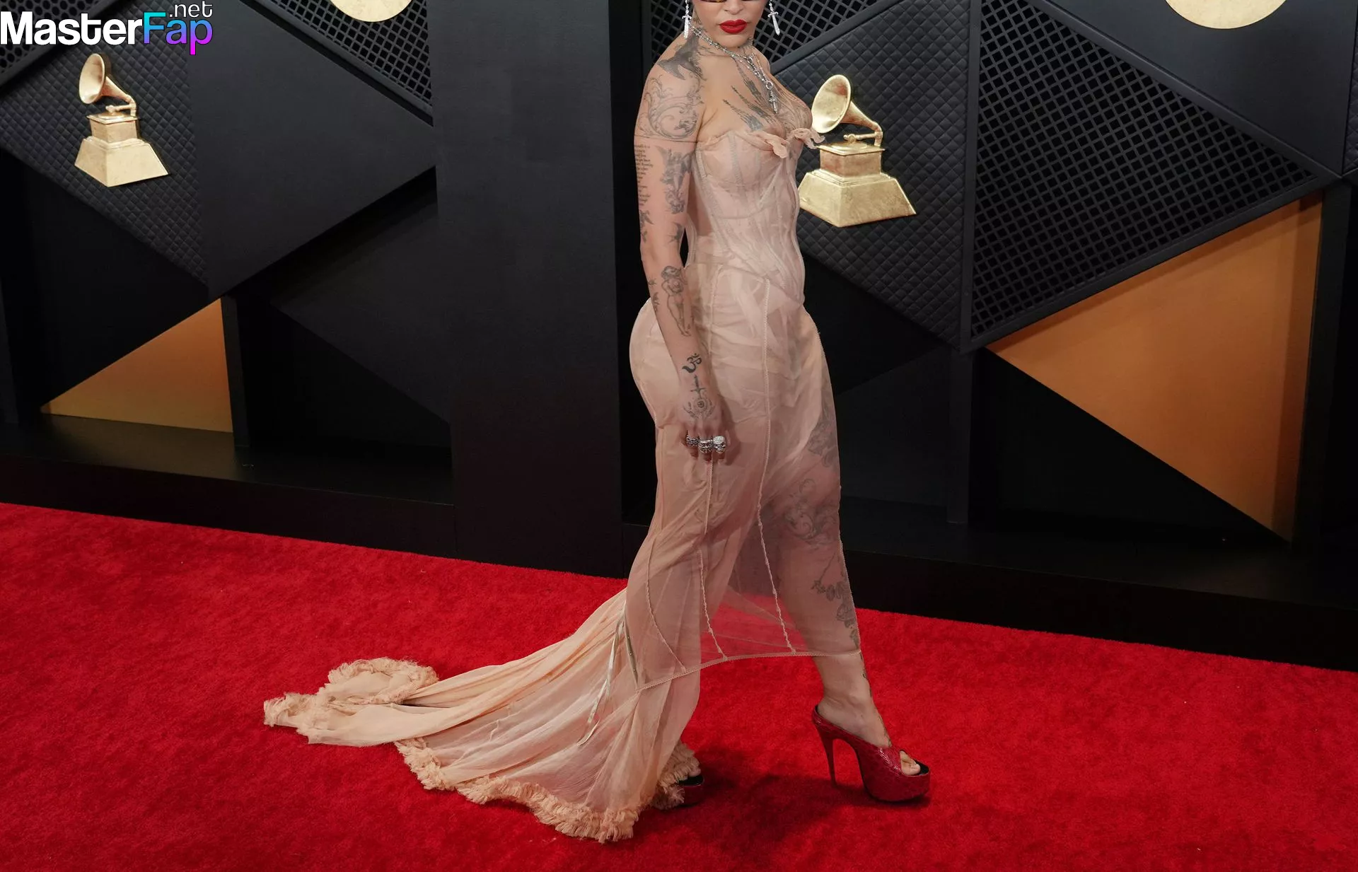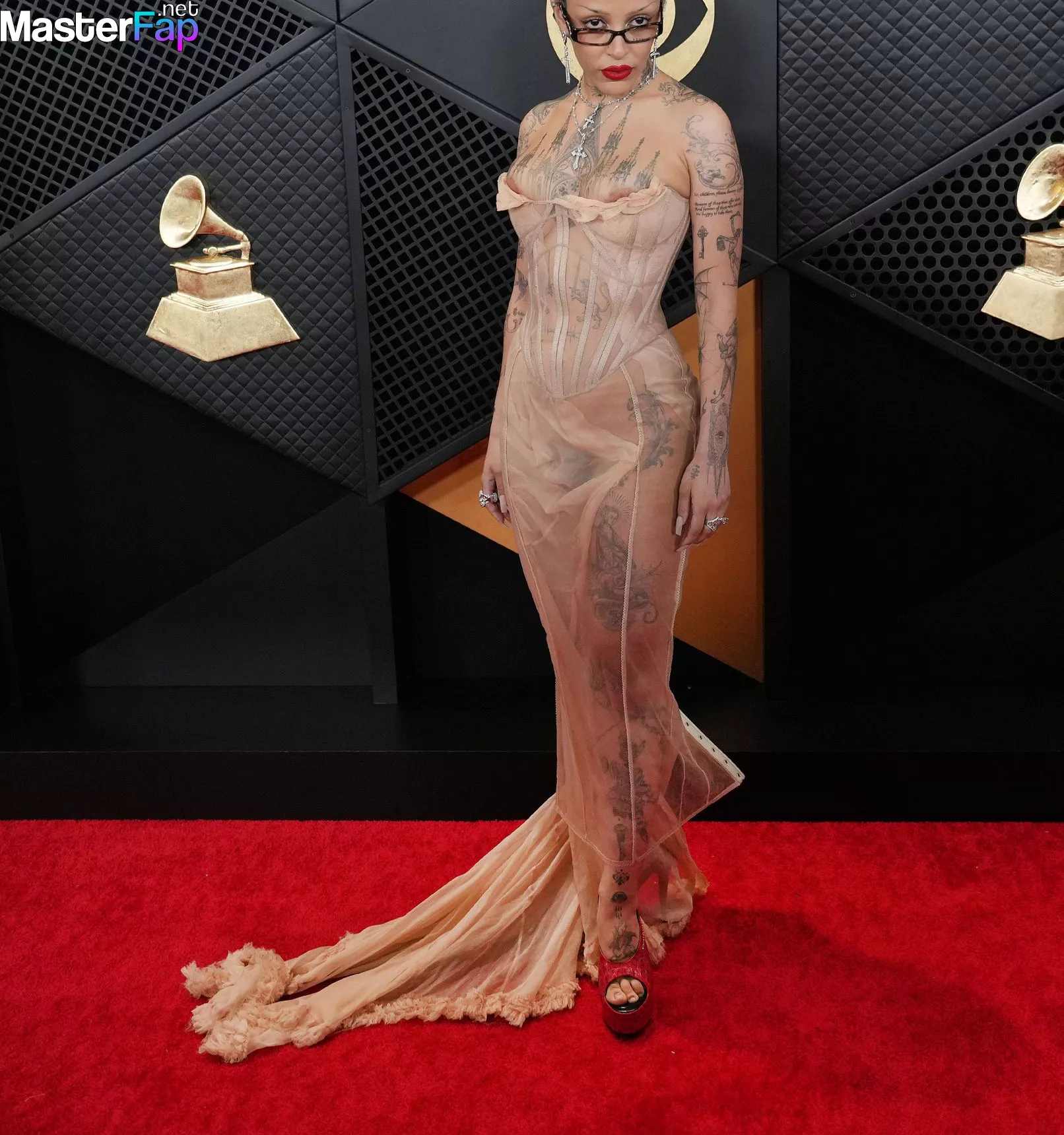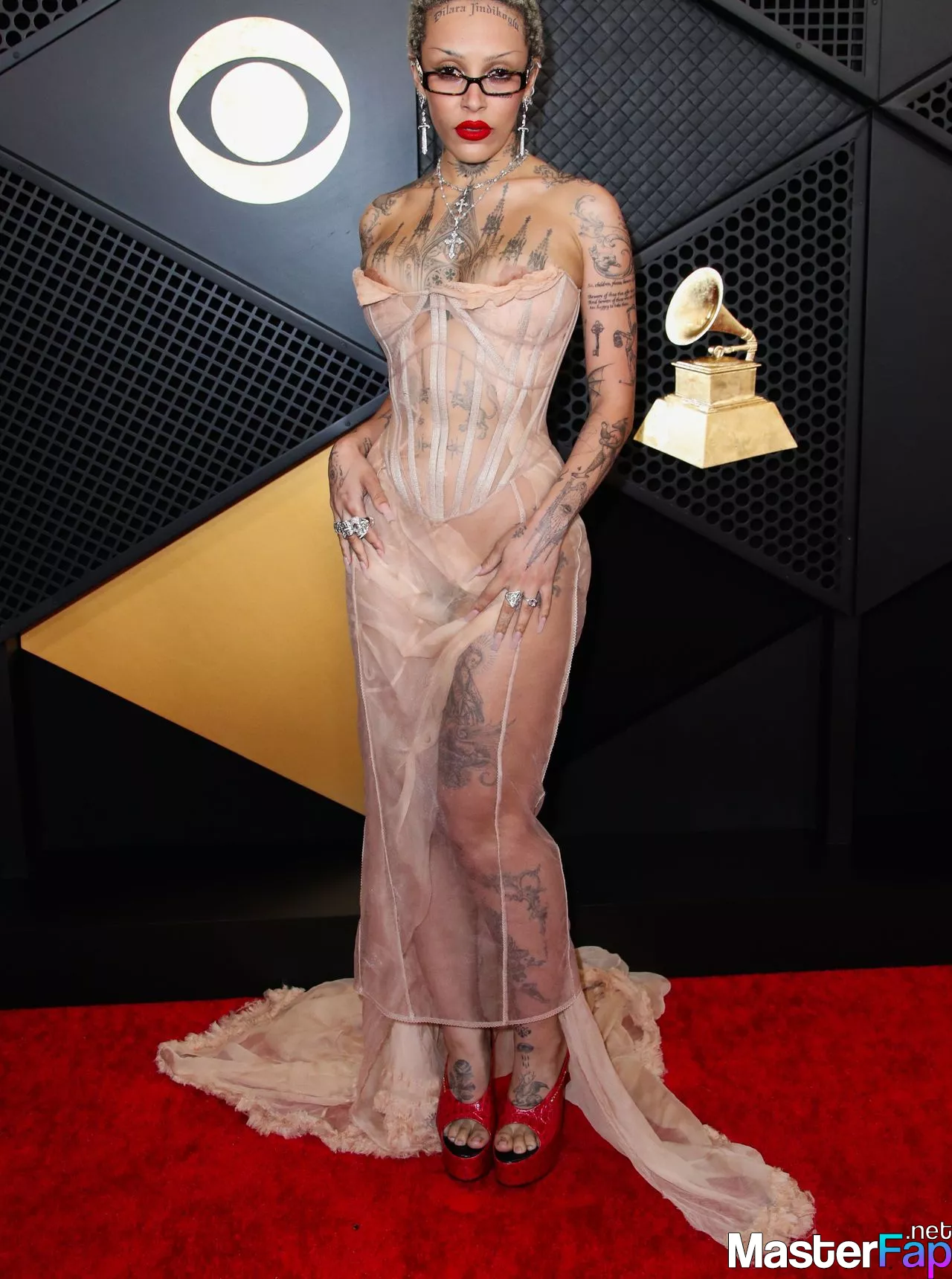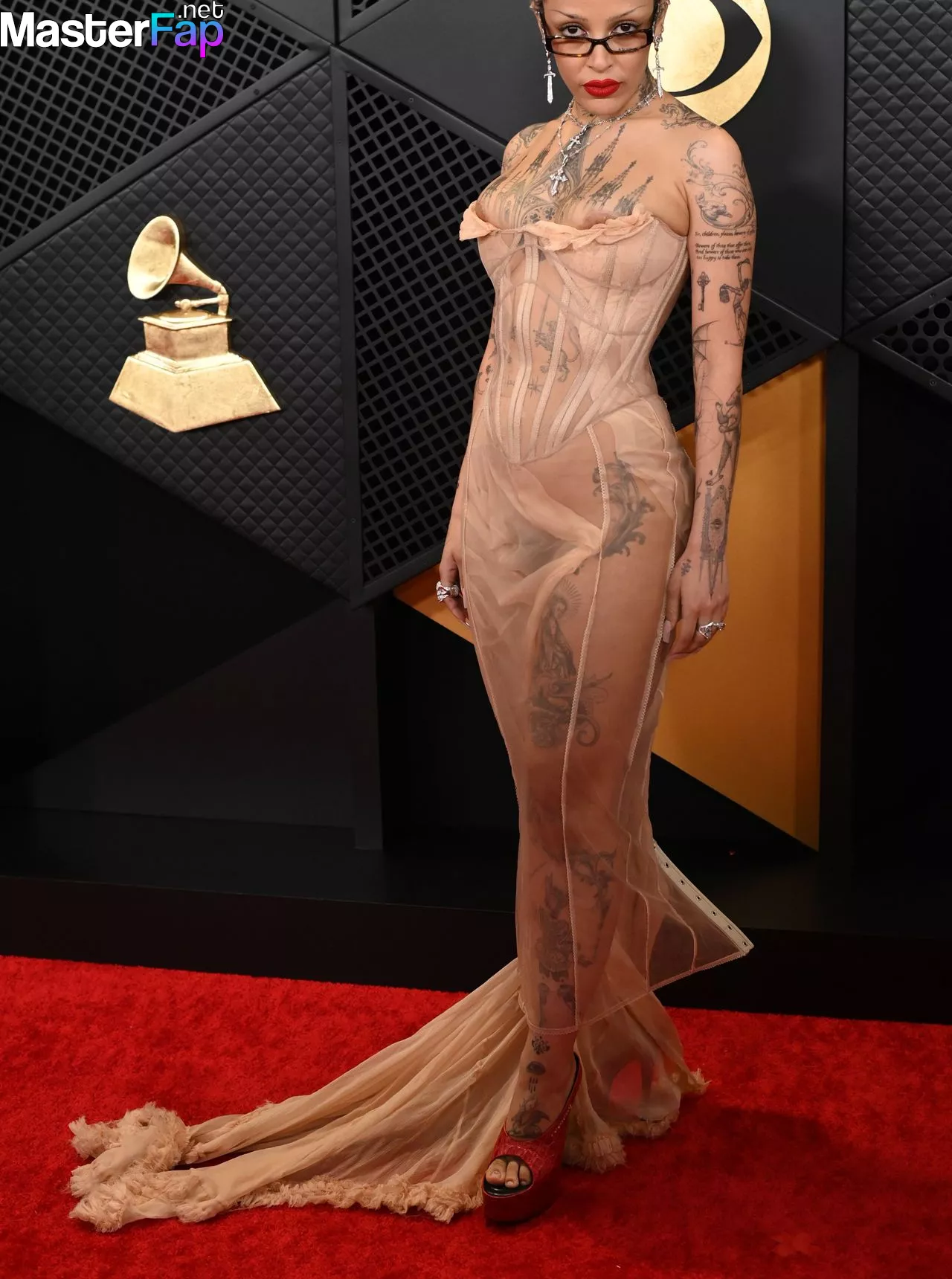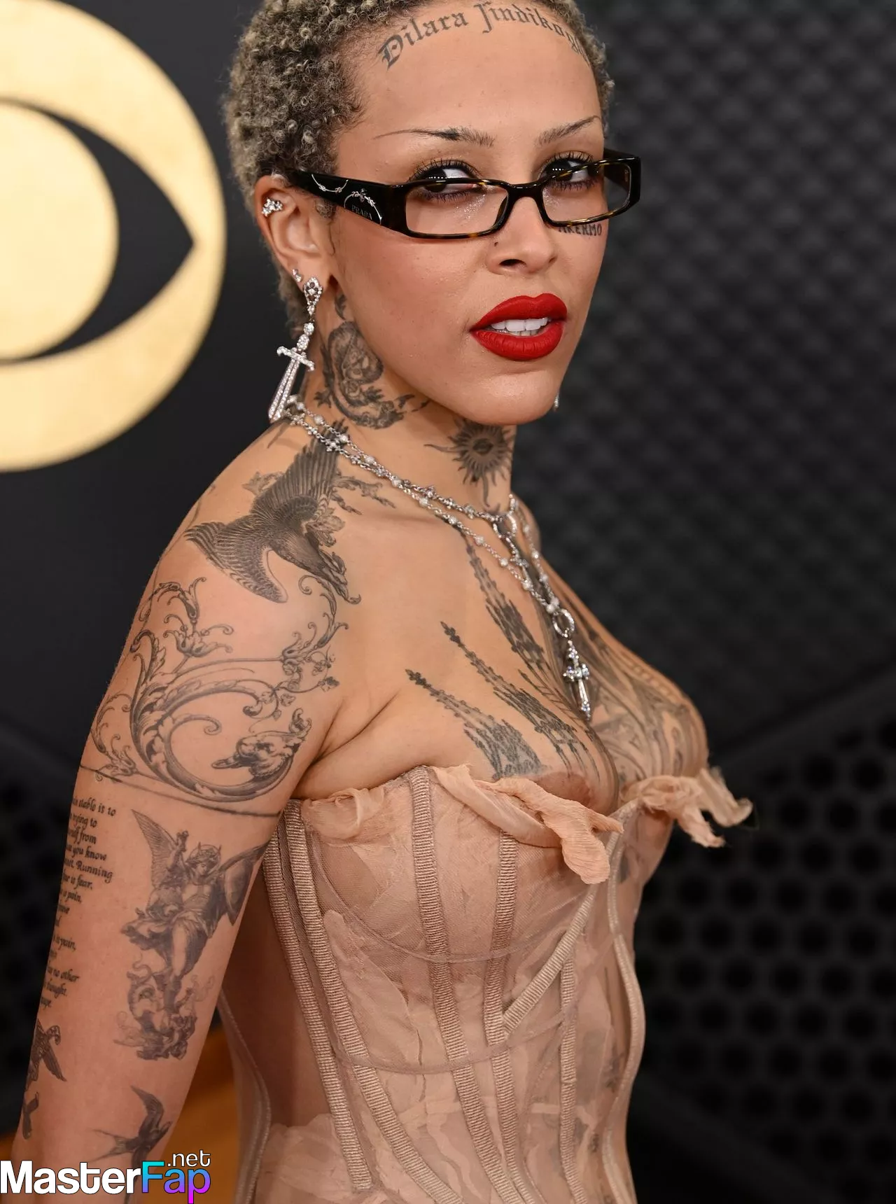 Singer Doja Cat has a nip slip in a super revealing sheer corset dress and flaunts several temporary tattoos, including one on her forehead, at the 2024 Grammys.