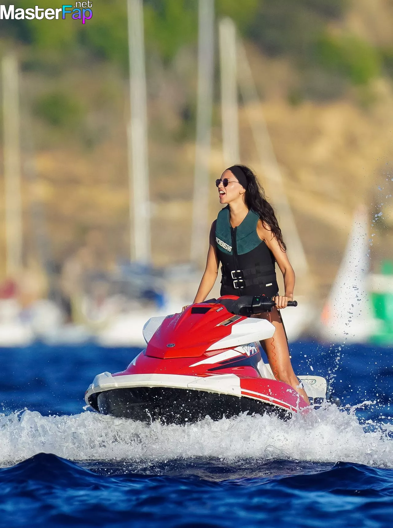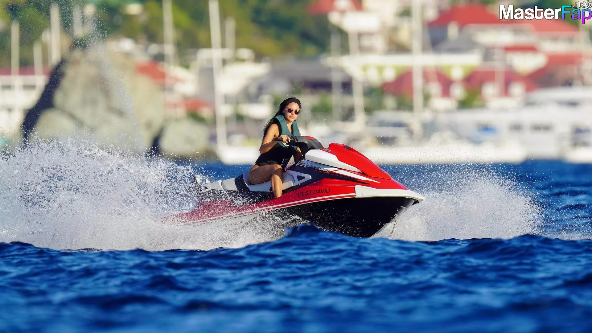As she vacations on a yacht and rides a jetski in St. Barts on February 1, 2024, Eiza Gonzalez flaunts her incredible curves while wearing a black bikini that is completely revealing.As she made her way back to the super yacht following her jet ski excursion, the Mexican actress, who is 33 years old and starred in Bay Driver, appeared to be basking in the presence of an unknown male who gently wrapped a towel over her.
