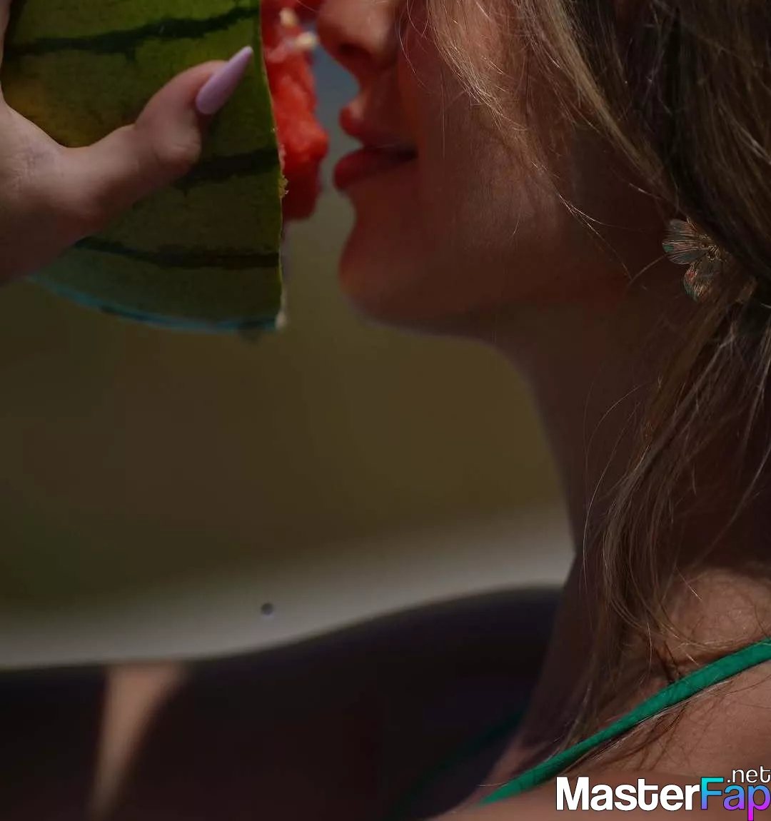 Grace Boor shows off her tatas in a bikini, posin’ with a drippy watermelon for a fresh, sexy shoot by the pool.