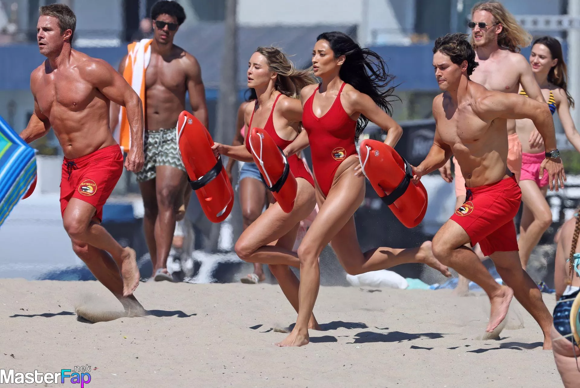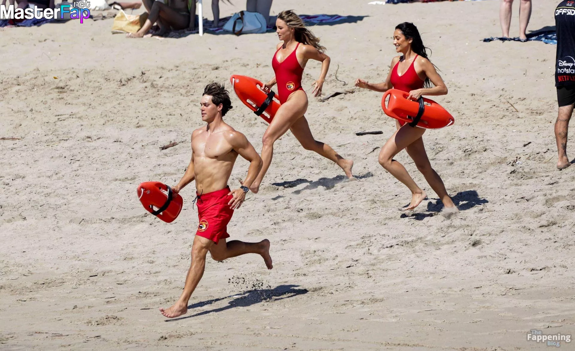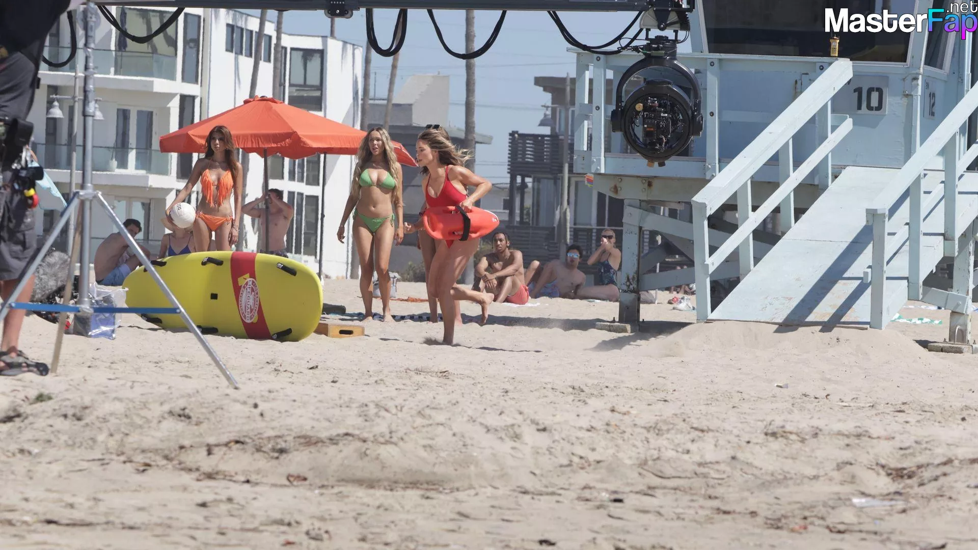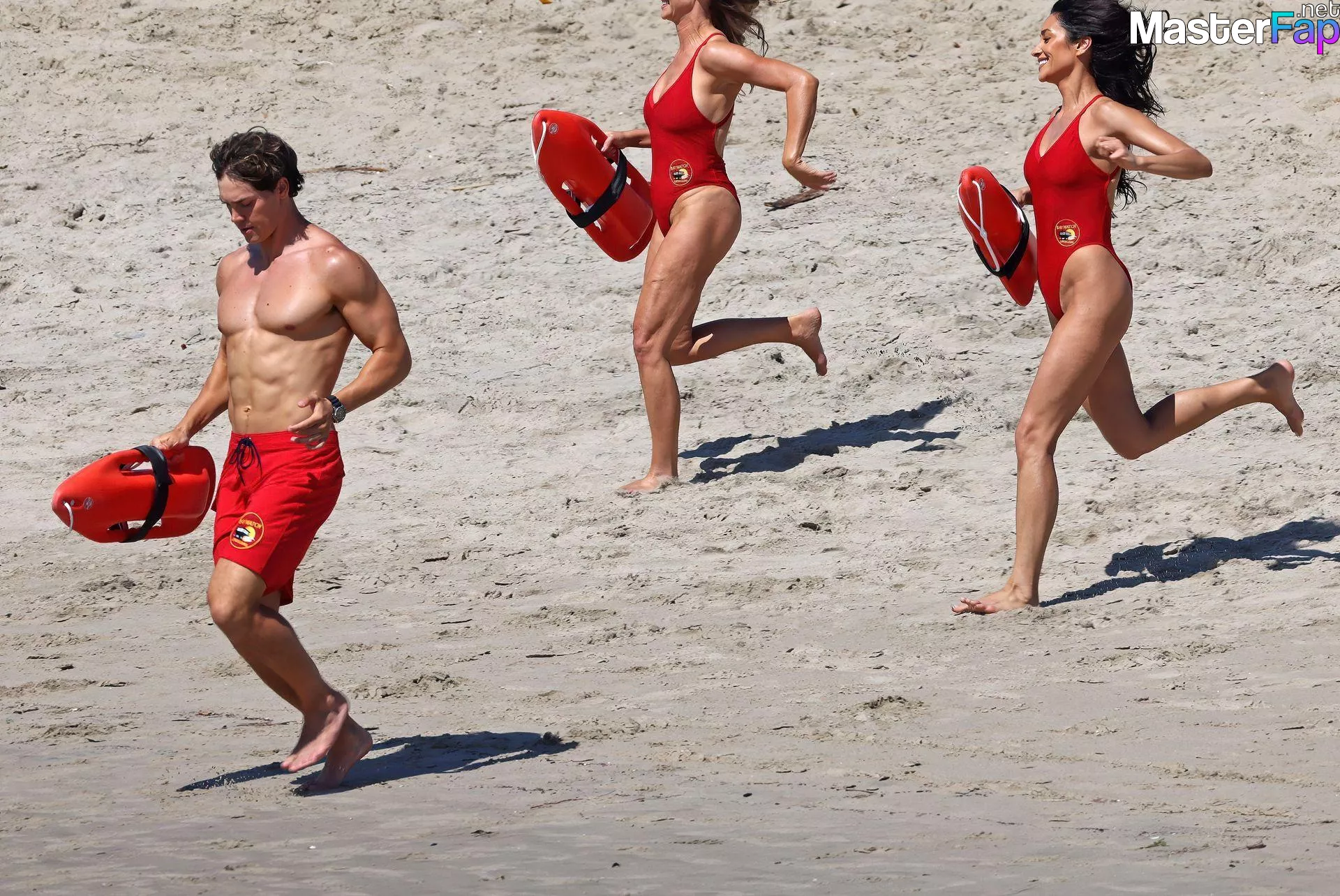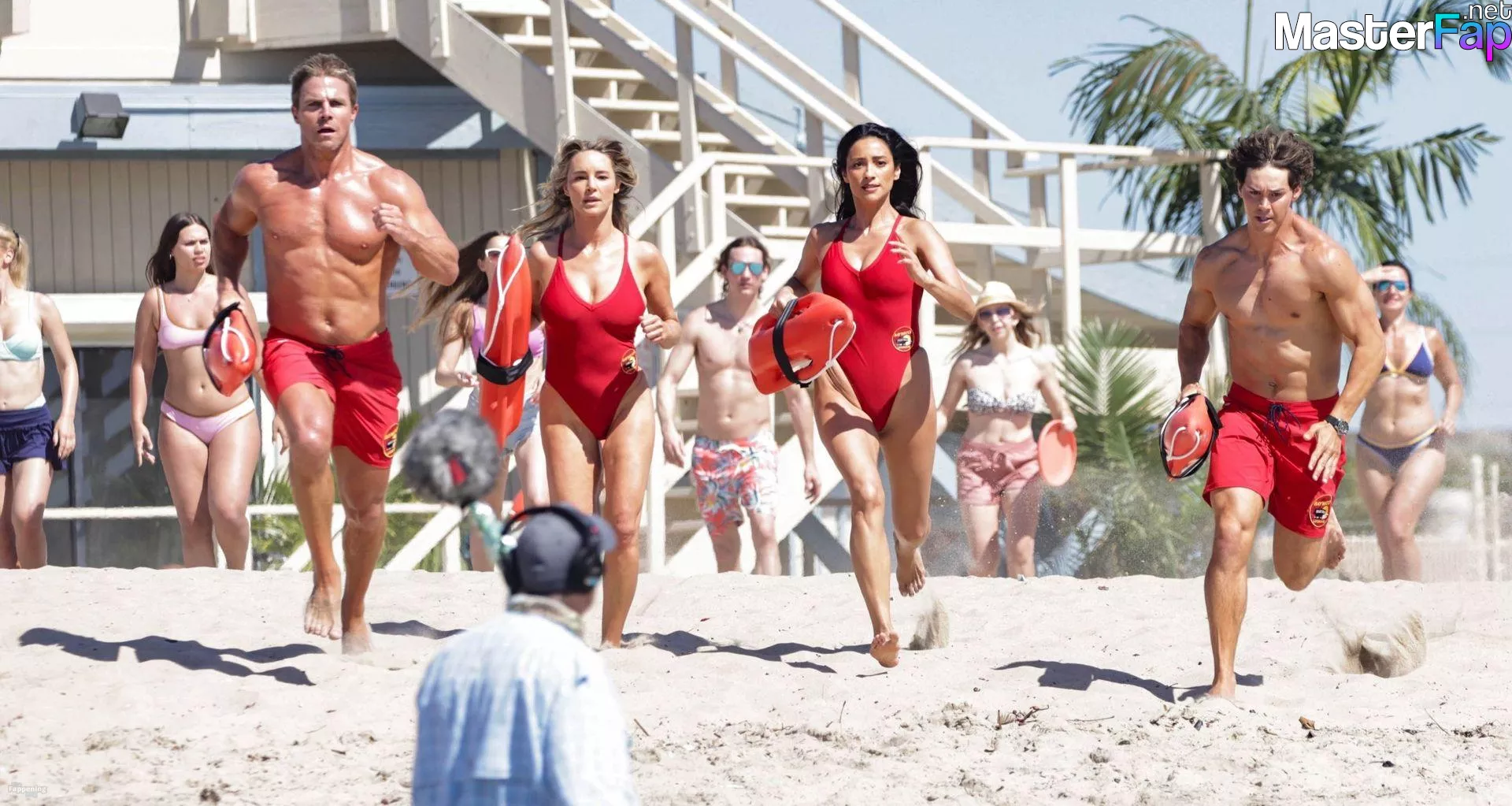 Shay Mitchell, Hassie Harrison, Stephen Amell and Noah Beck are pictured while filming the new Baywatch series in Venice Beach.