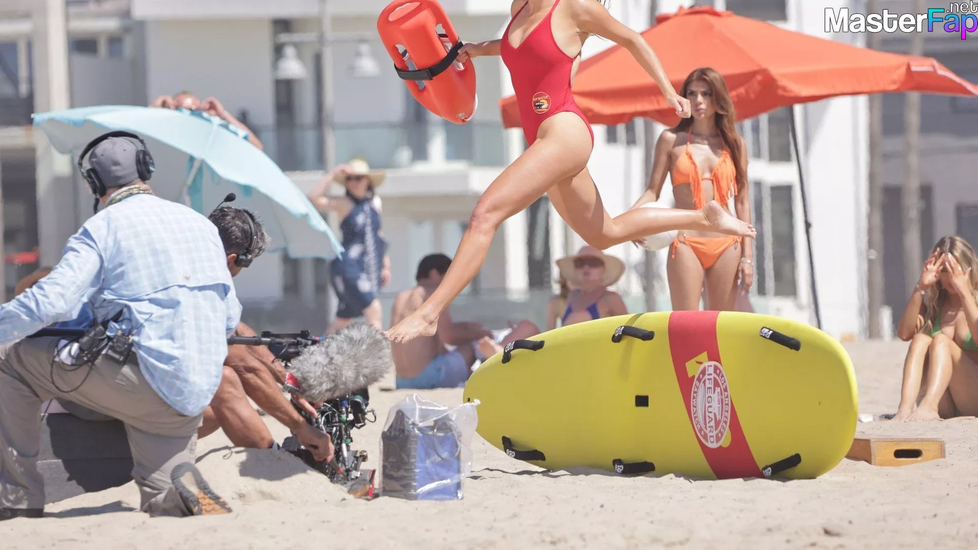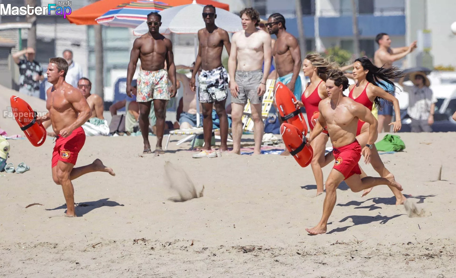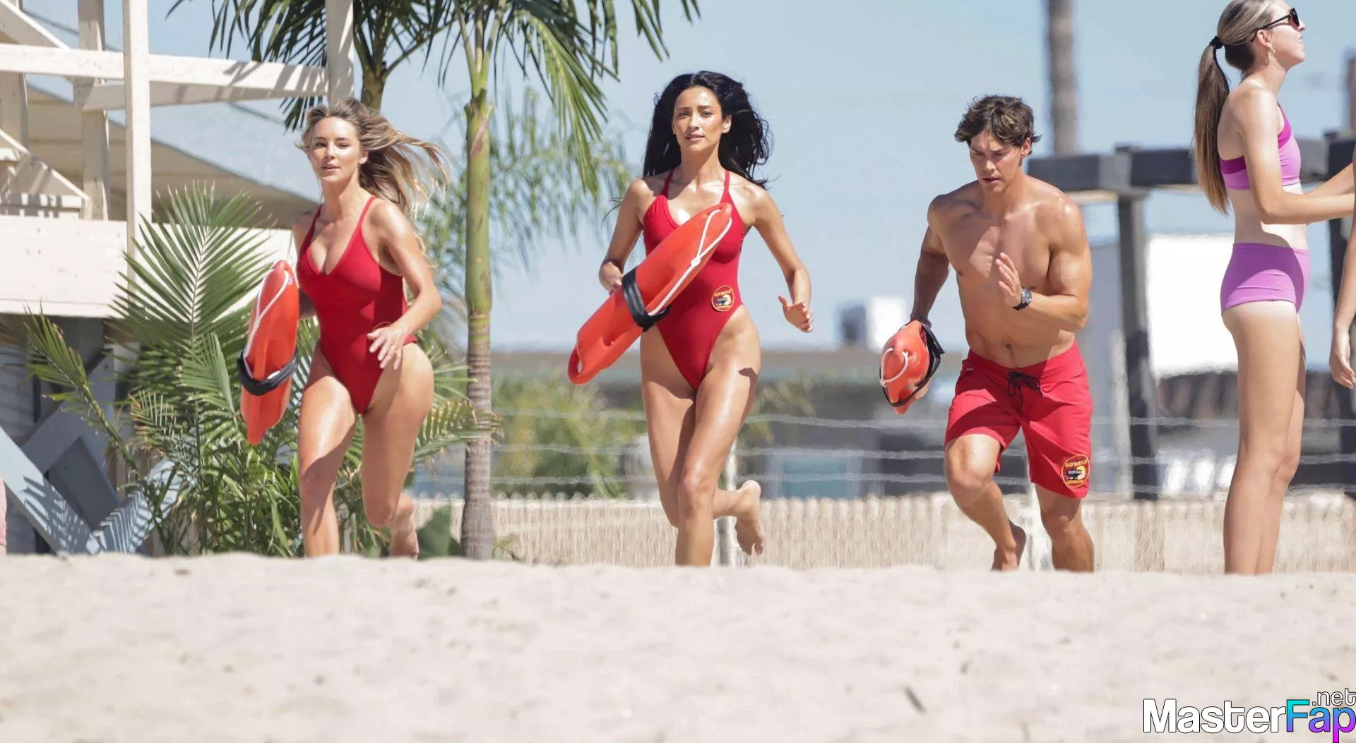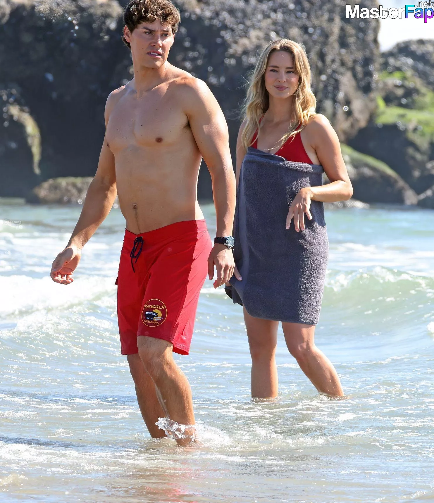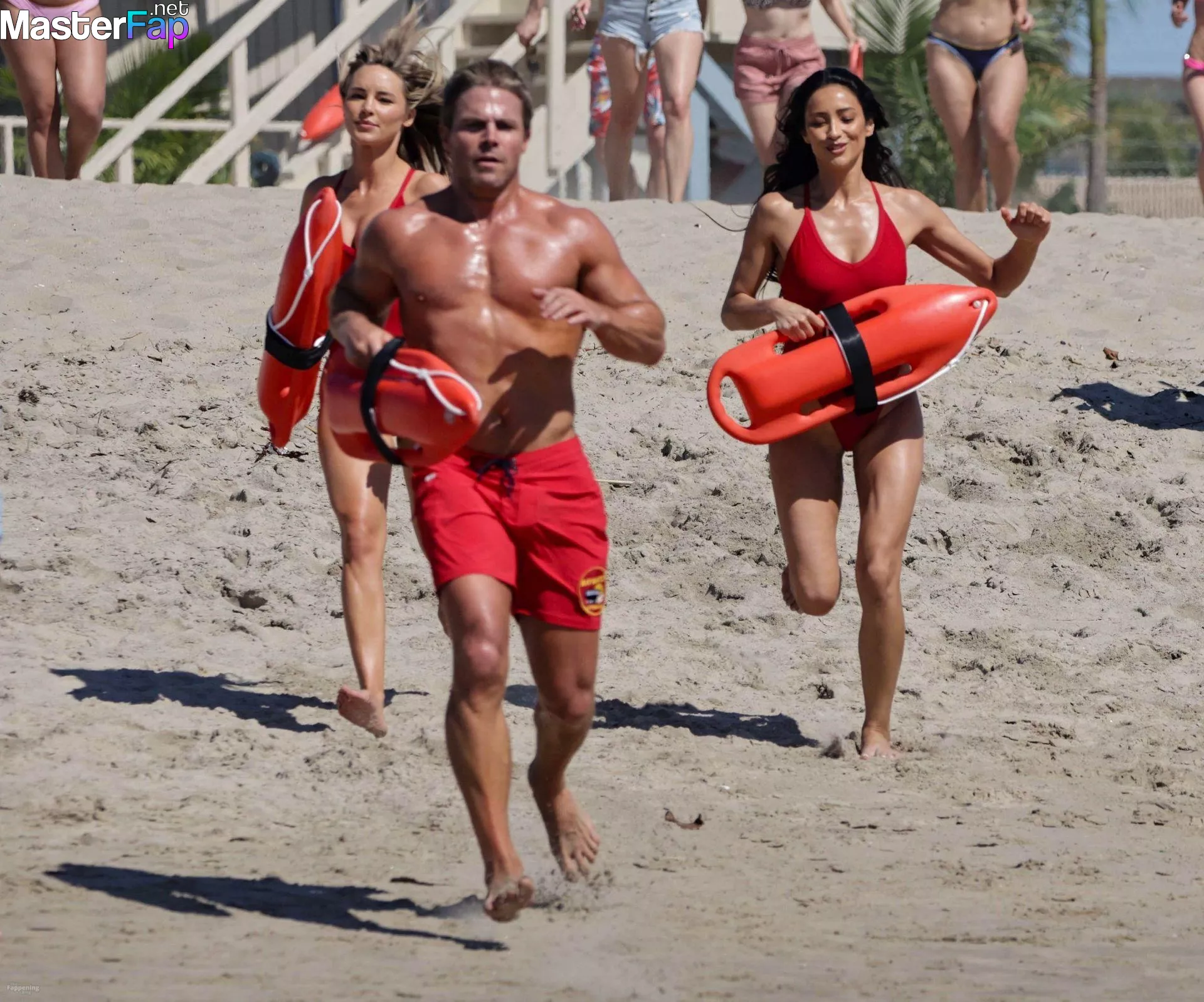 Shay Mitchell, Hassie Harrison, Stephen Amell and Noah Beck are pictured while filming the new Baywatch series in Venice Beach.