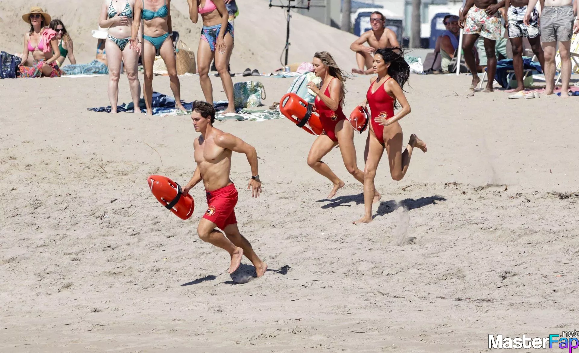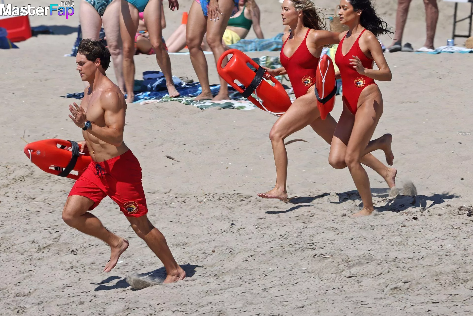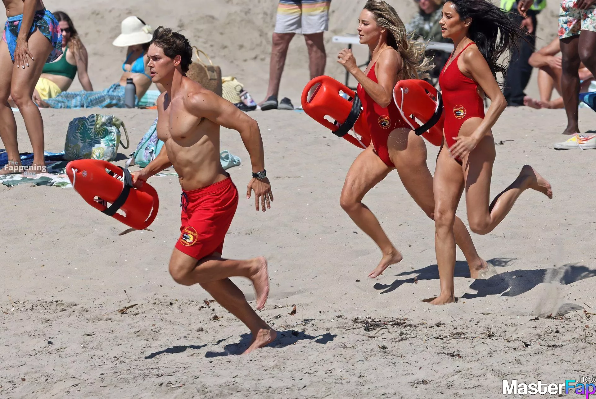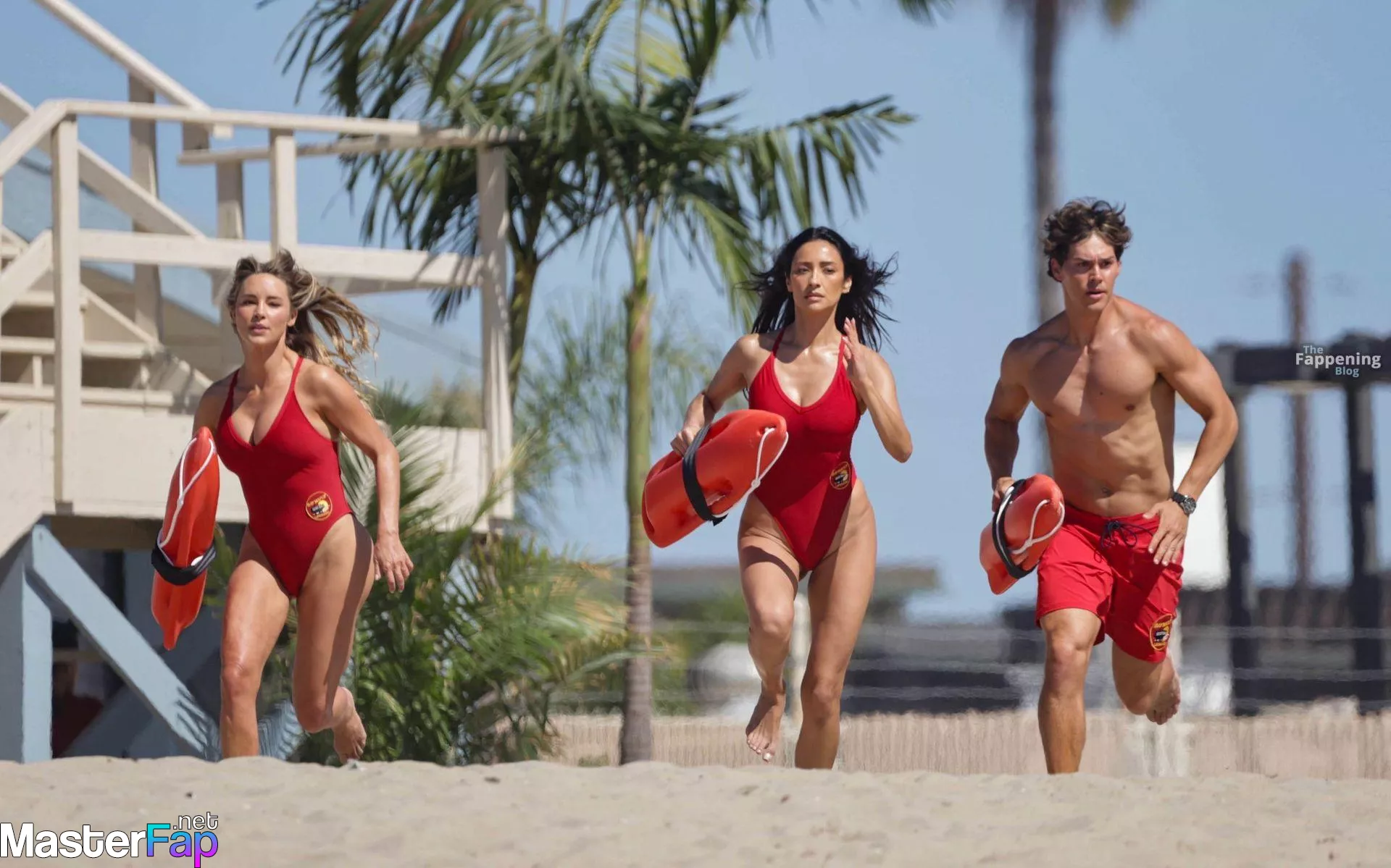 Shay Mitchell, Hassie Harrison, Stephen Amell and Noah Beck are pictured while filming the new Baywatch series in Venice Beach.