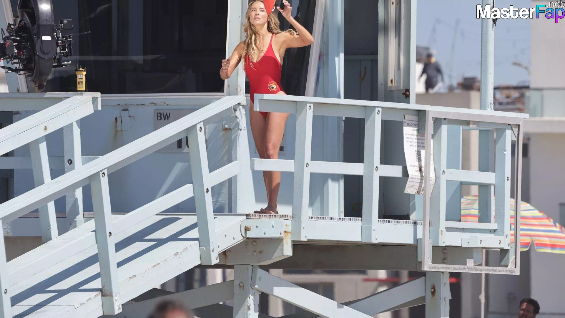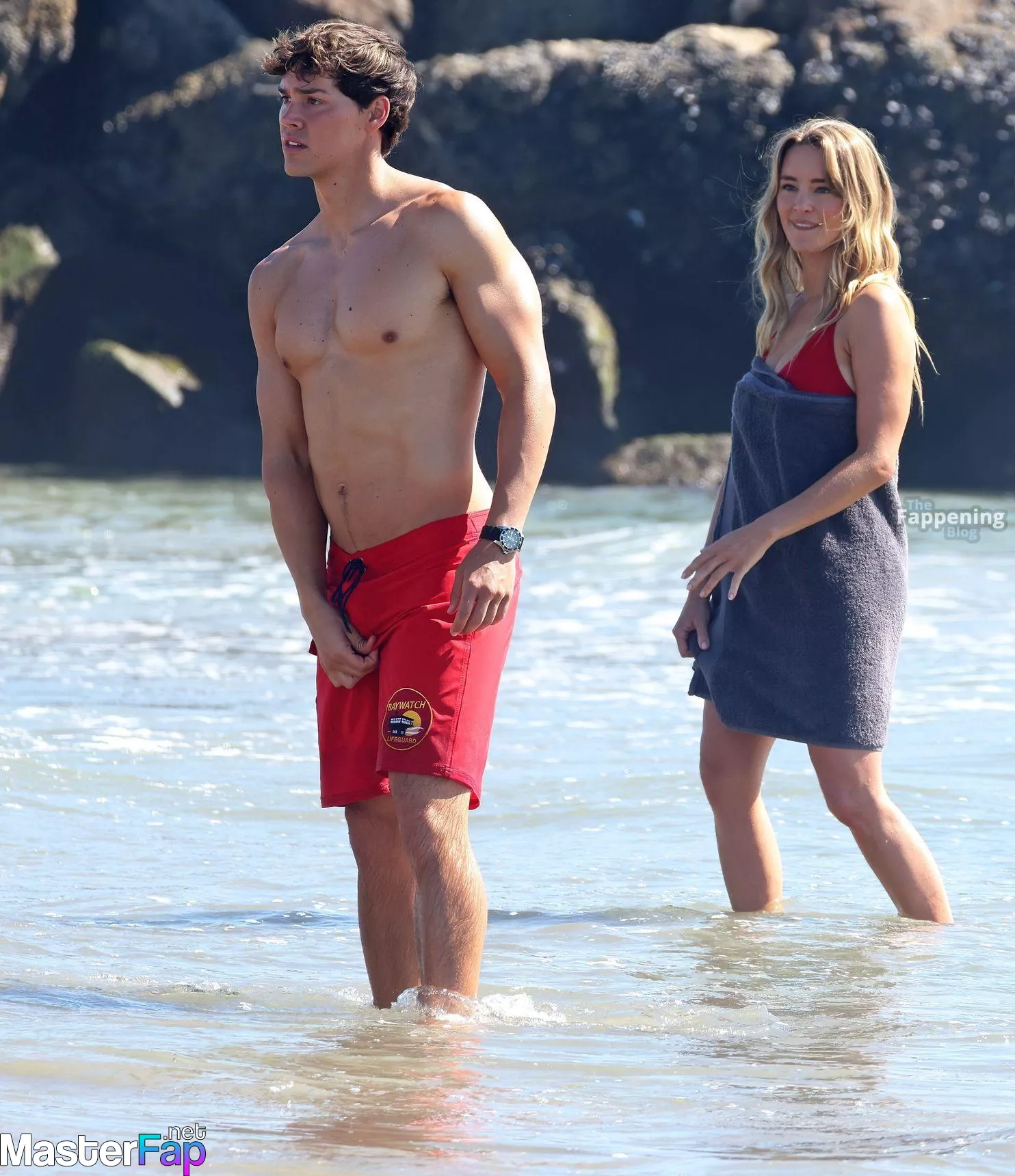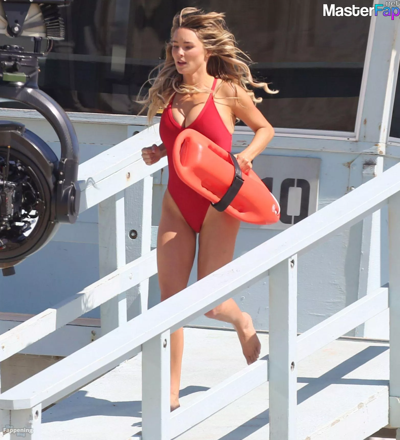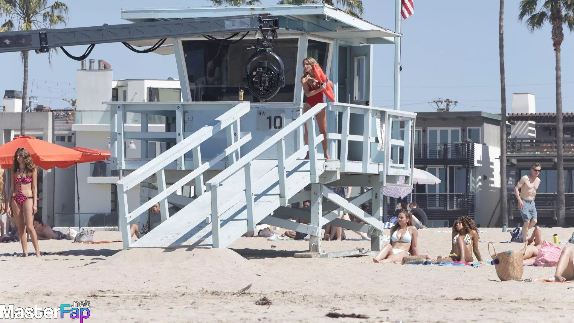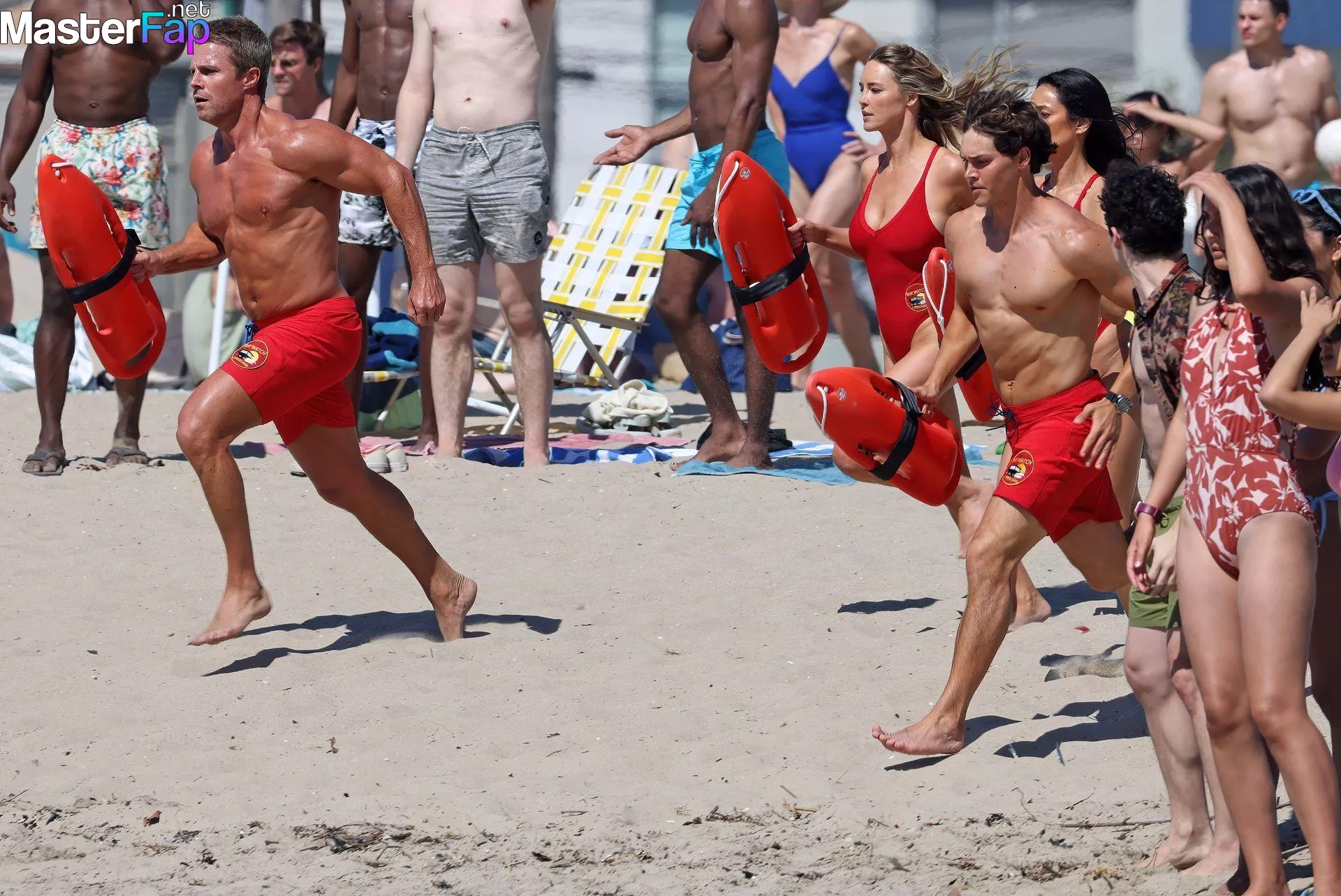 Shay Mitchell, Hassie Harrison, Stephen Amell and Noah Beck are pictured while filming the new Baywatch series in Venice Beach.