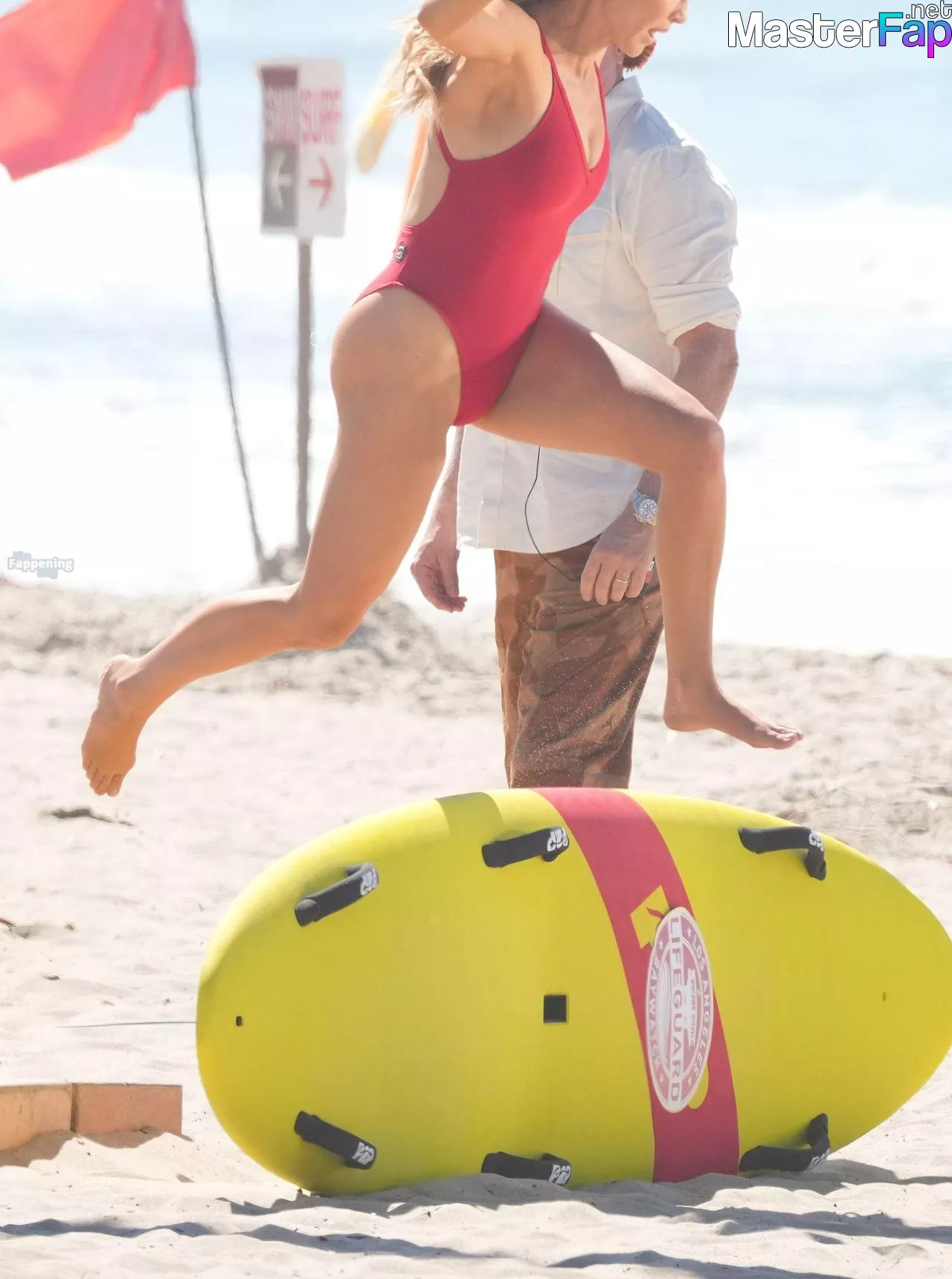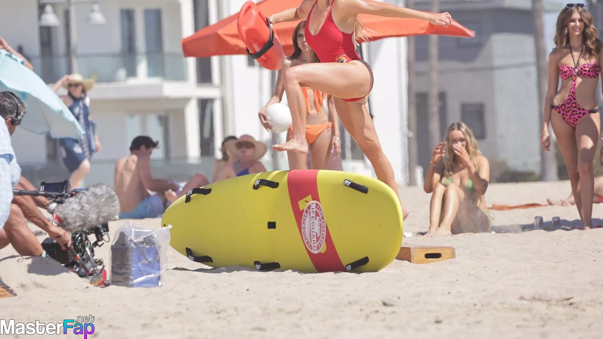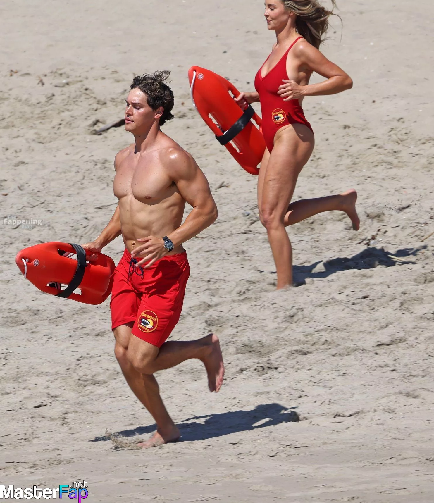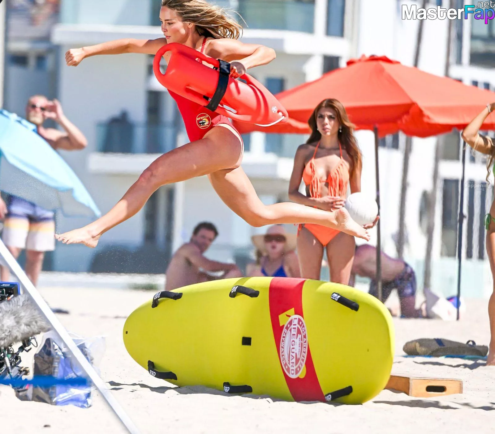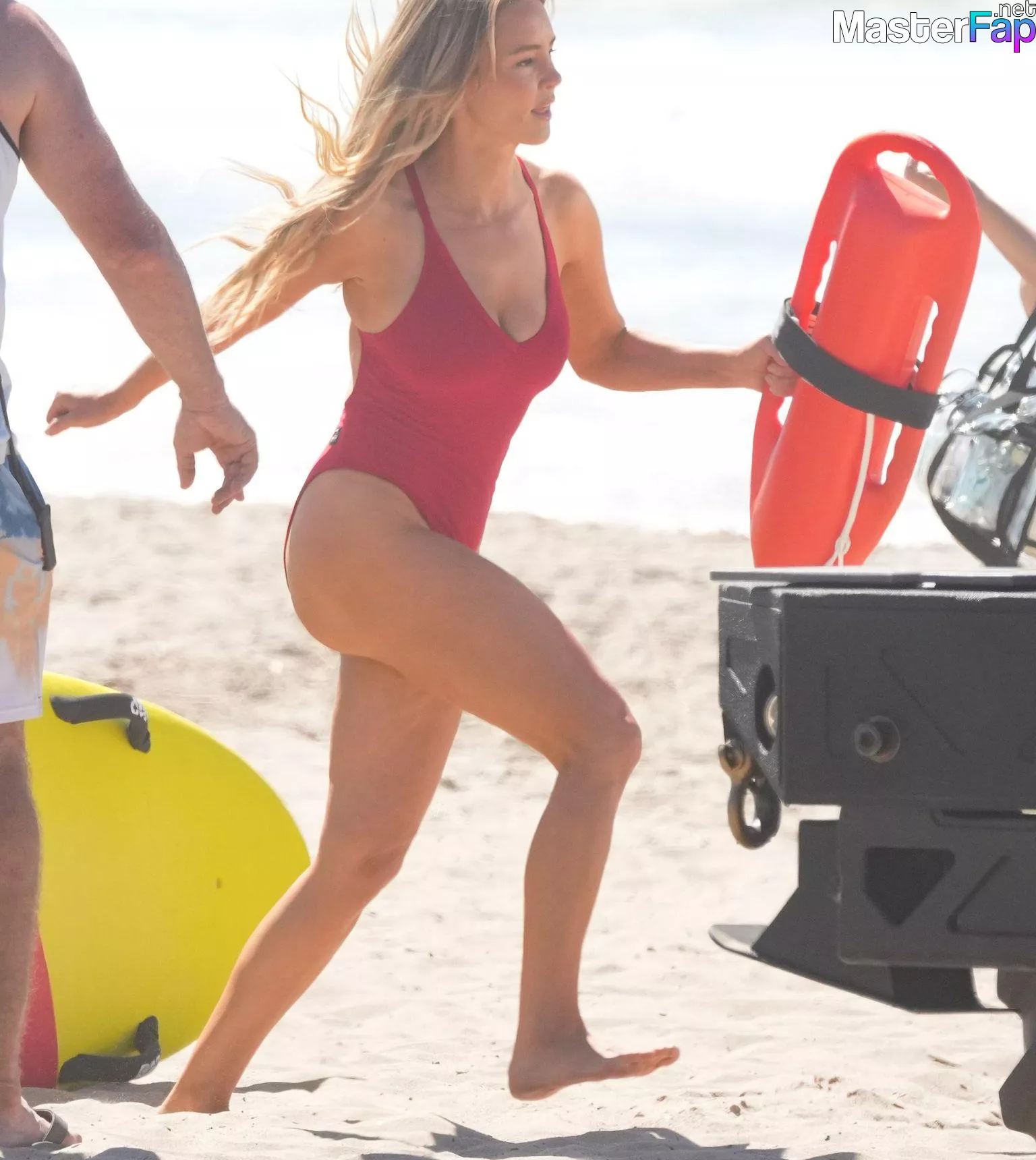 Shay Mitchell, Hassie Harrison, Stephen Amell and Noah Beck are pictured while filming the new Baywatch series in Venice Beach.