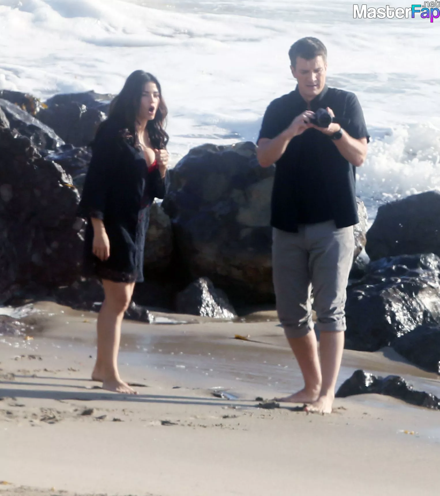 Jenna Dewan is seen on the beach in Los Angeles, California, on December 18th, 2023, wearing a red swimming suit and a black cover up. Alongside her co-star Nathan Fillion, the American actress, who is 43 years old, was seen playing in the waves while filming sequences for the film "The Rookie," which was about their honeymoon.