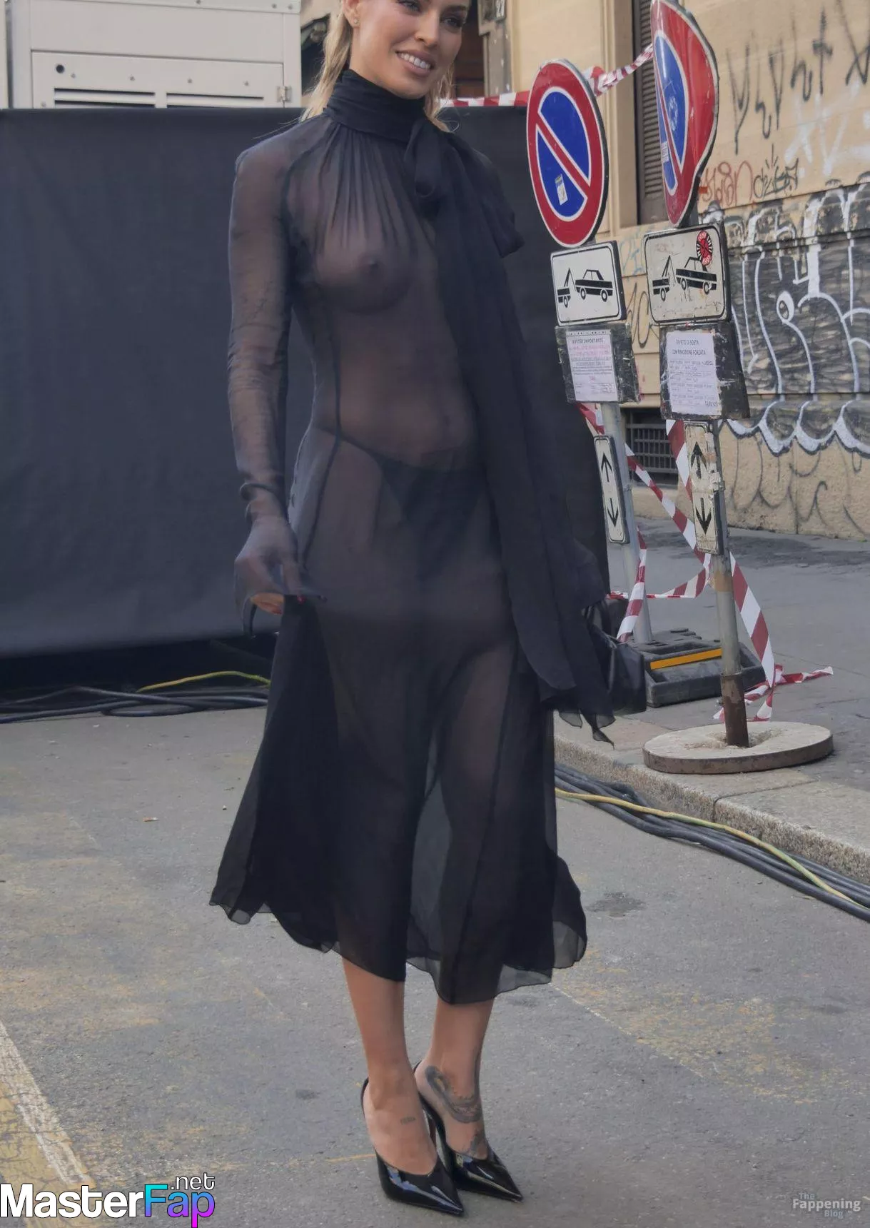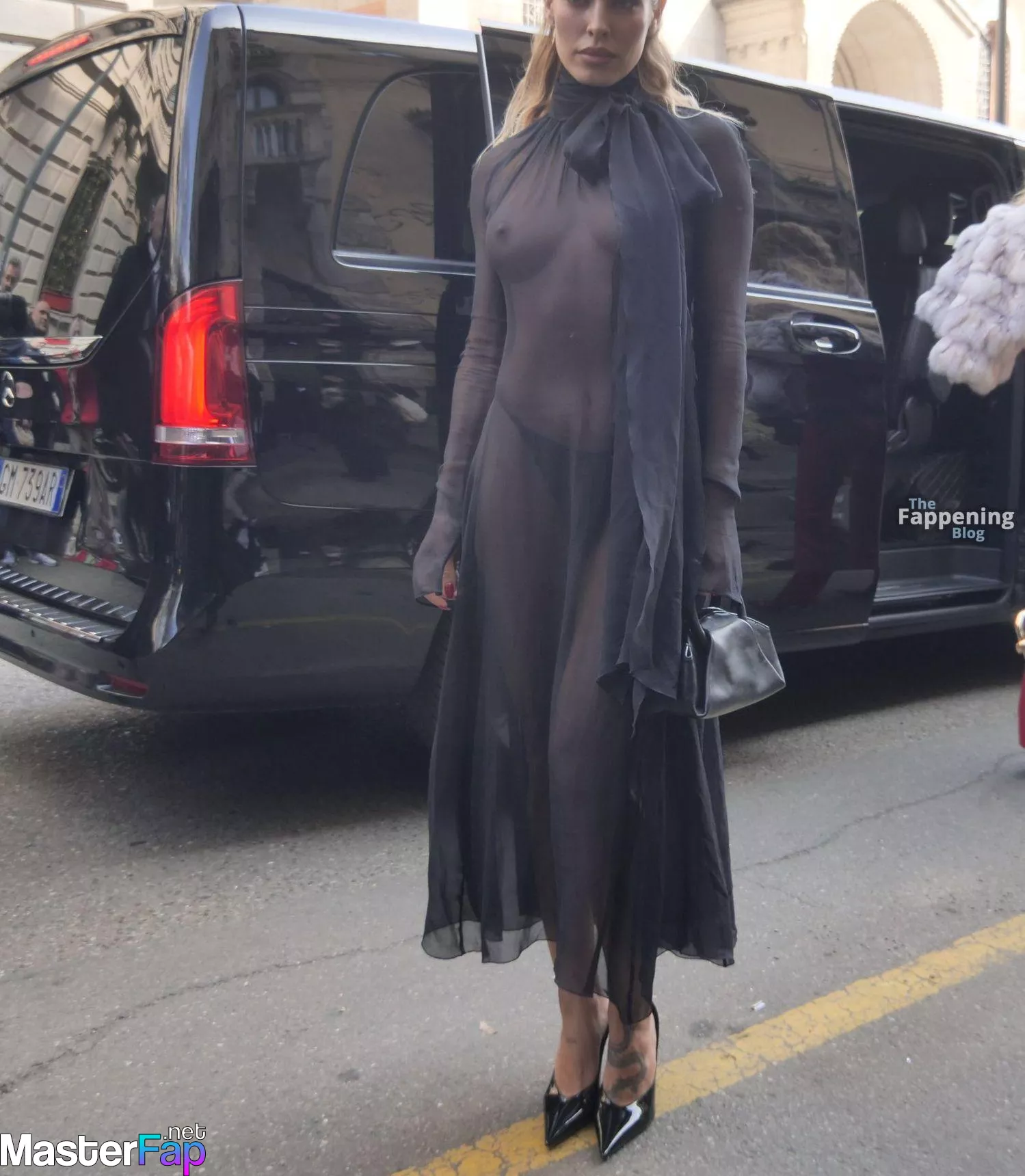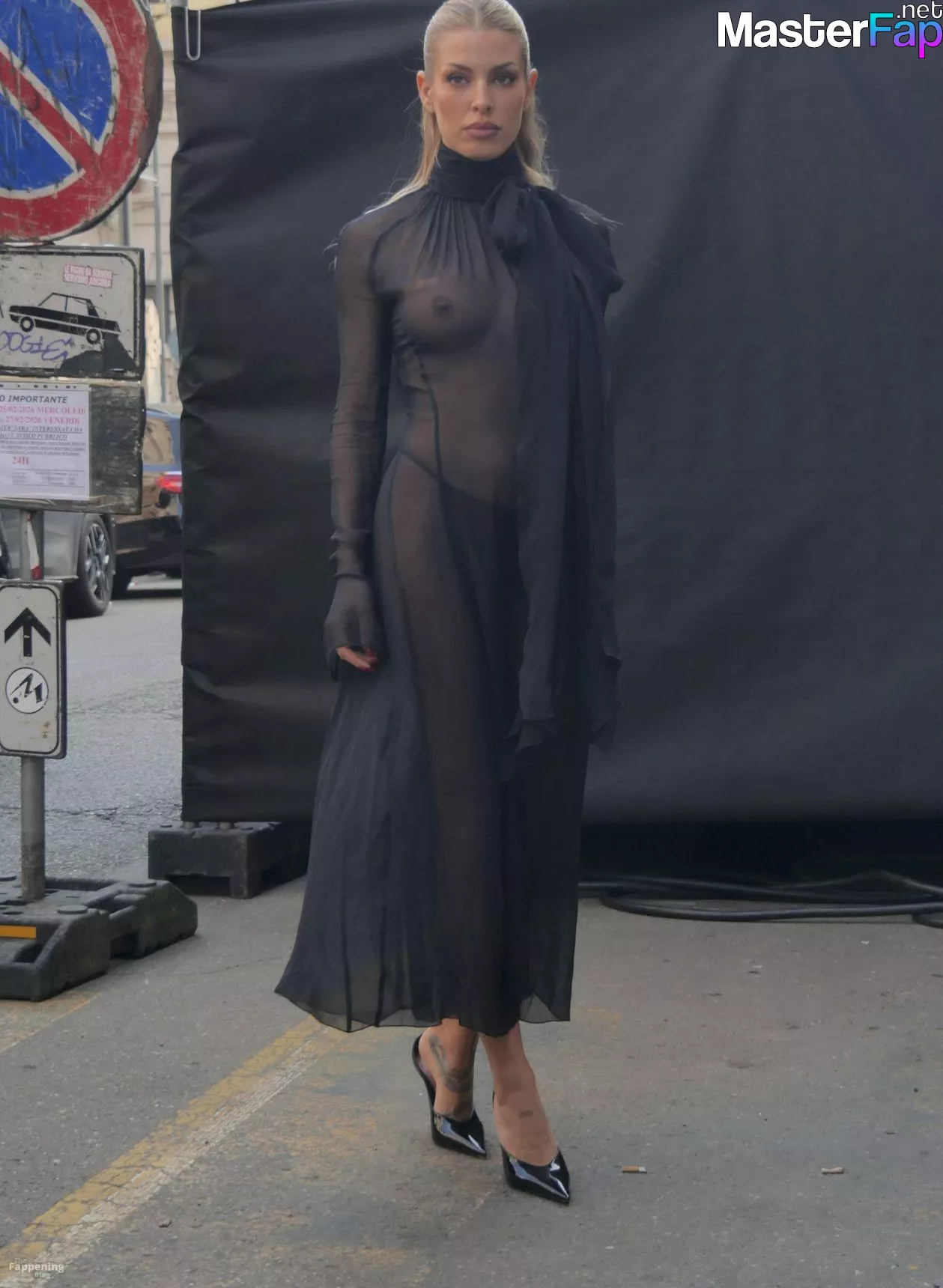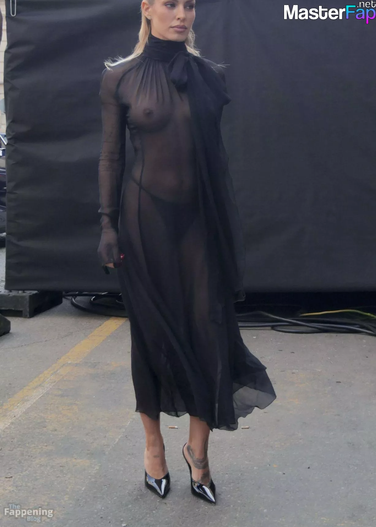 Jessica Goicoechea goes braless, flauntin’ her bare tits in a sheer black dress at the Blumarine Fashion Show in Milan.