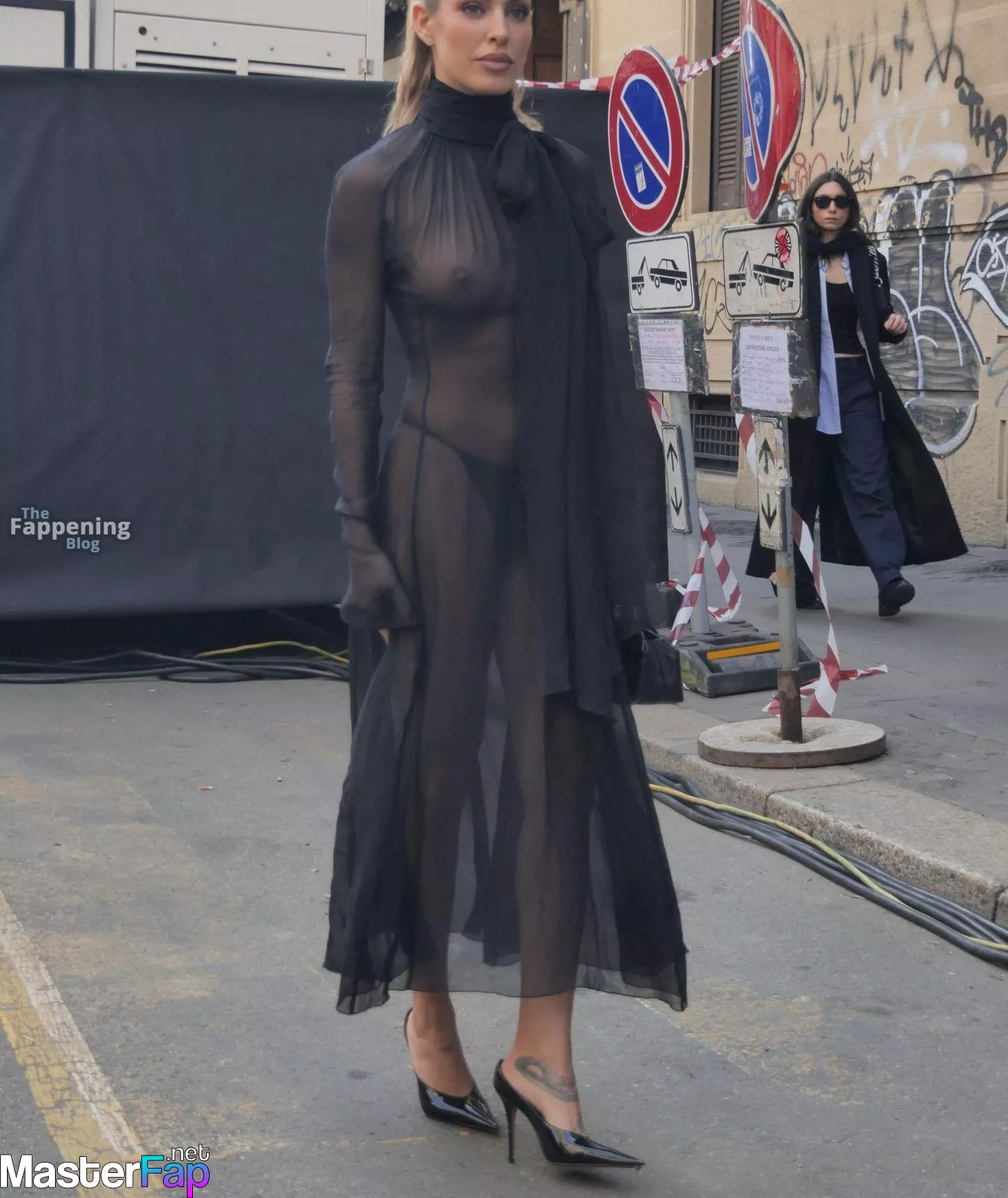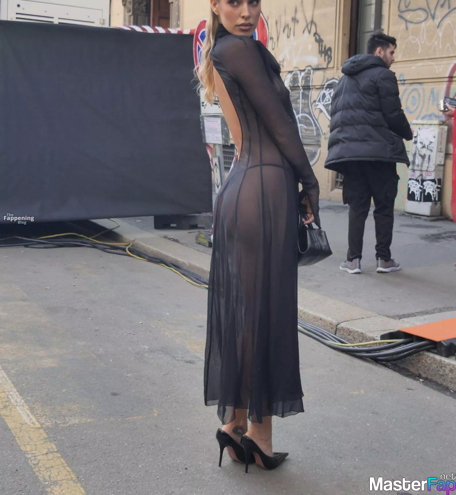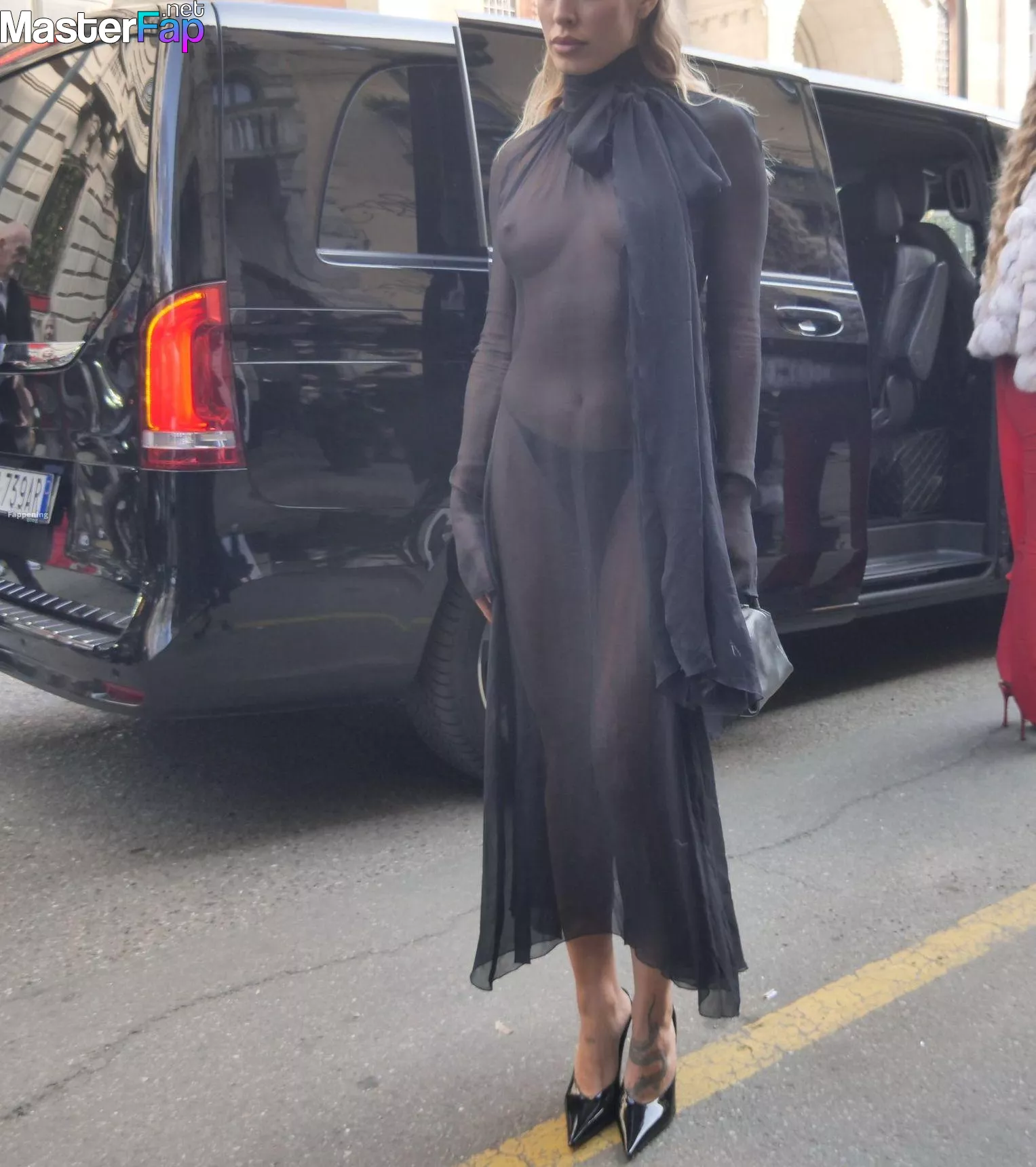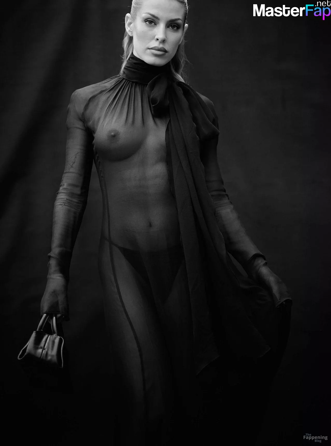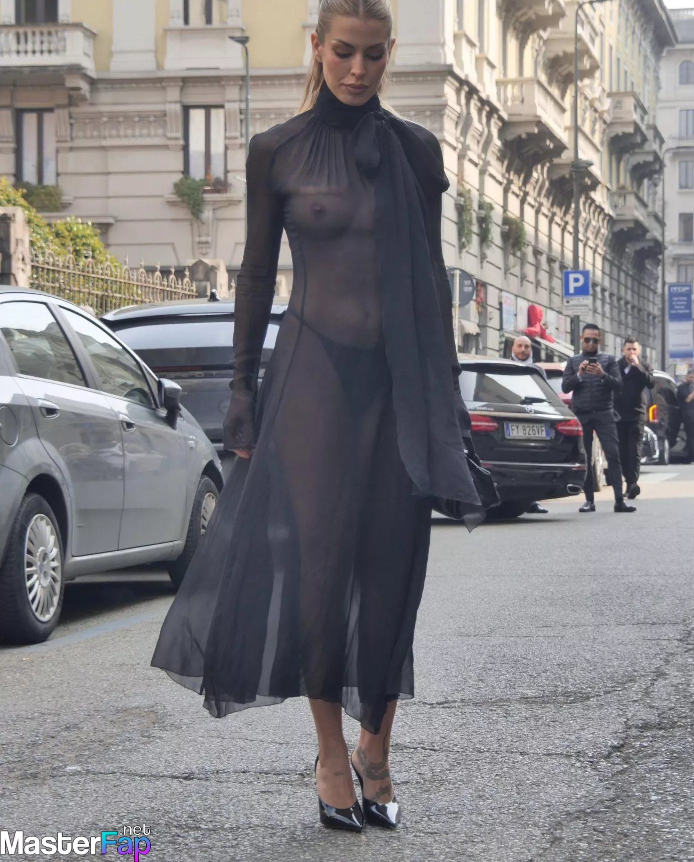 Jessica Goicoechea goes braless, flauntin’ her bare tits in a sheer black dress at the Blumarine Fashion Show in Milan.