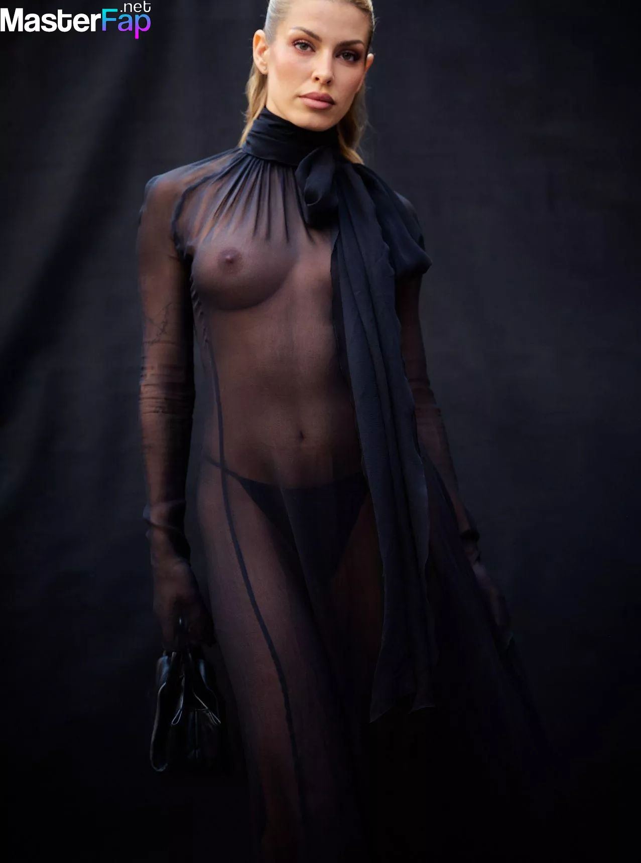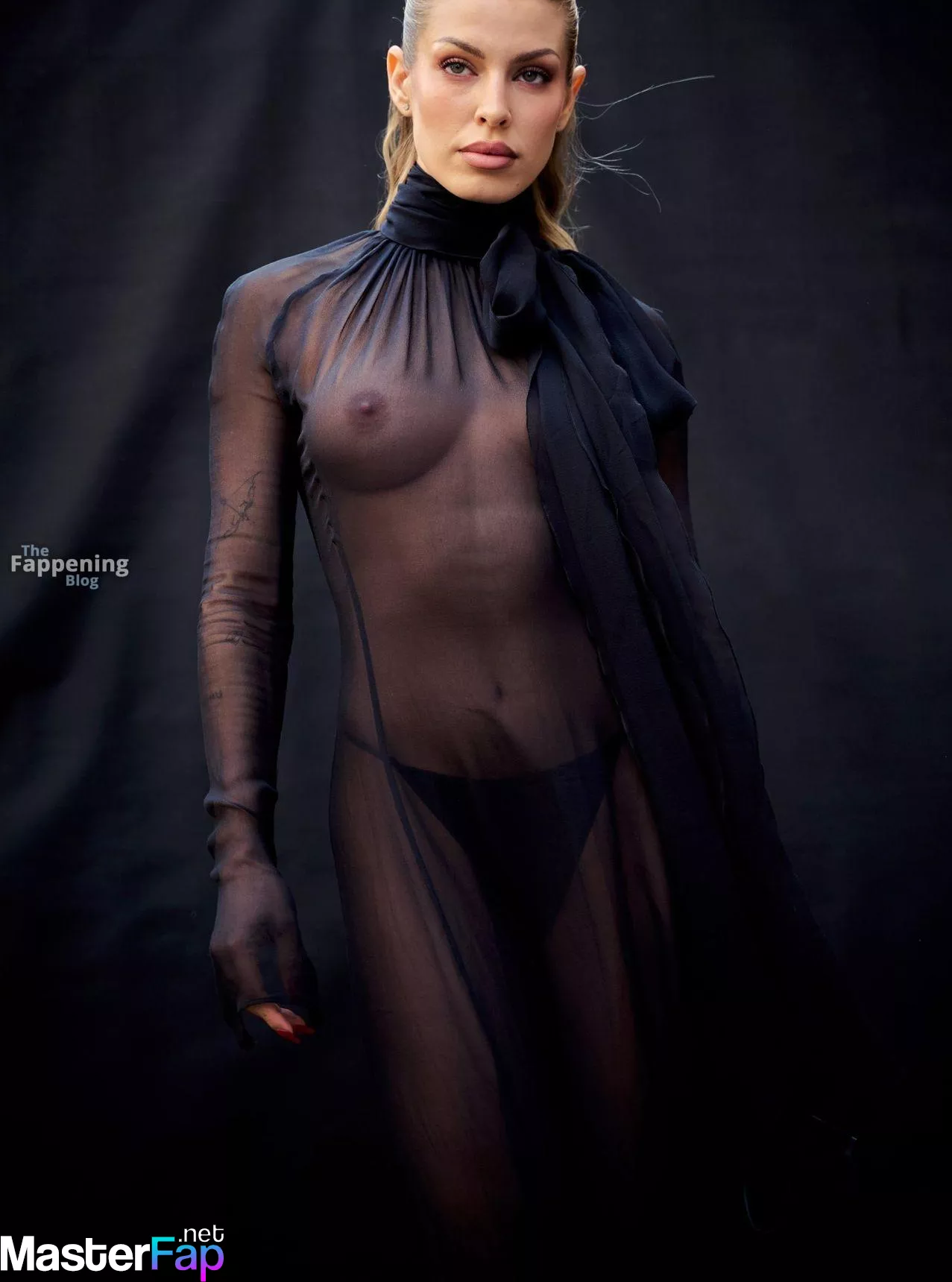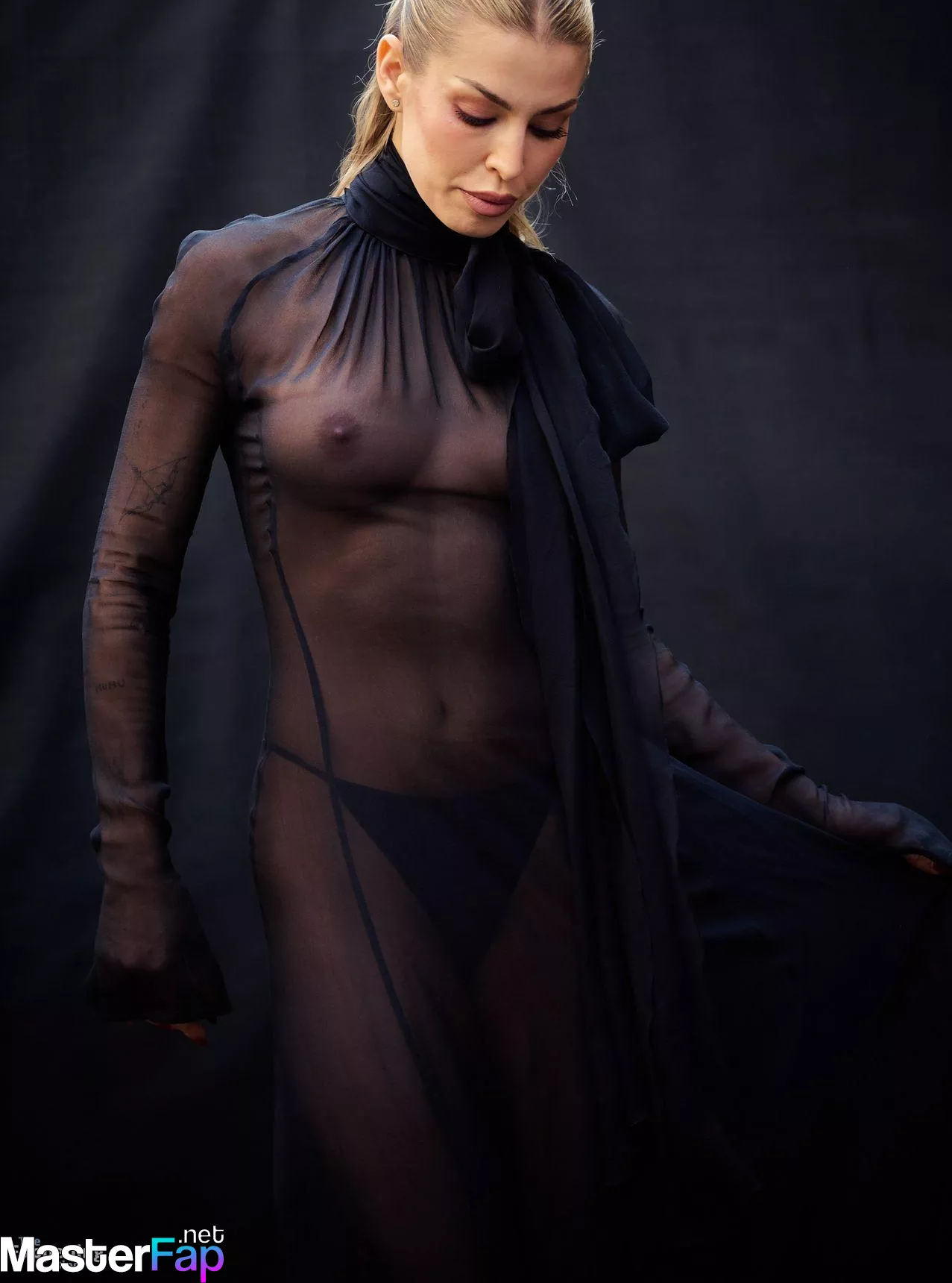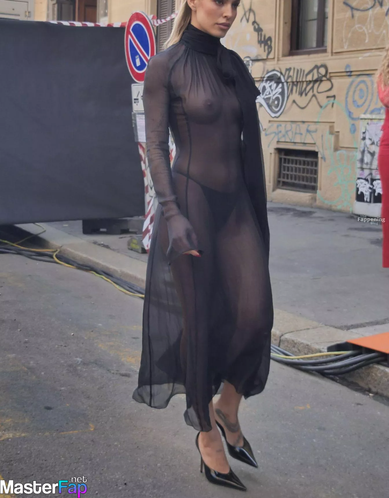 Jessica Goicoechea goes braless, flauntin’ her bare tits in a sheer black dress at the Blumarine Fashion Show in Milan.