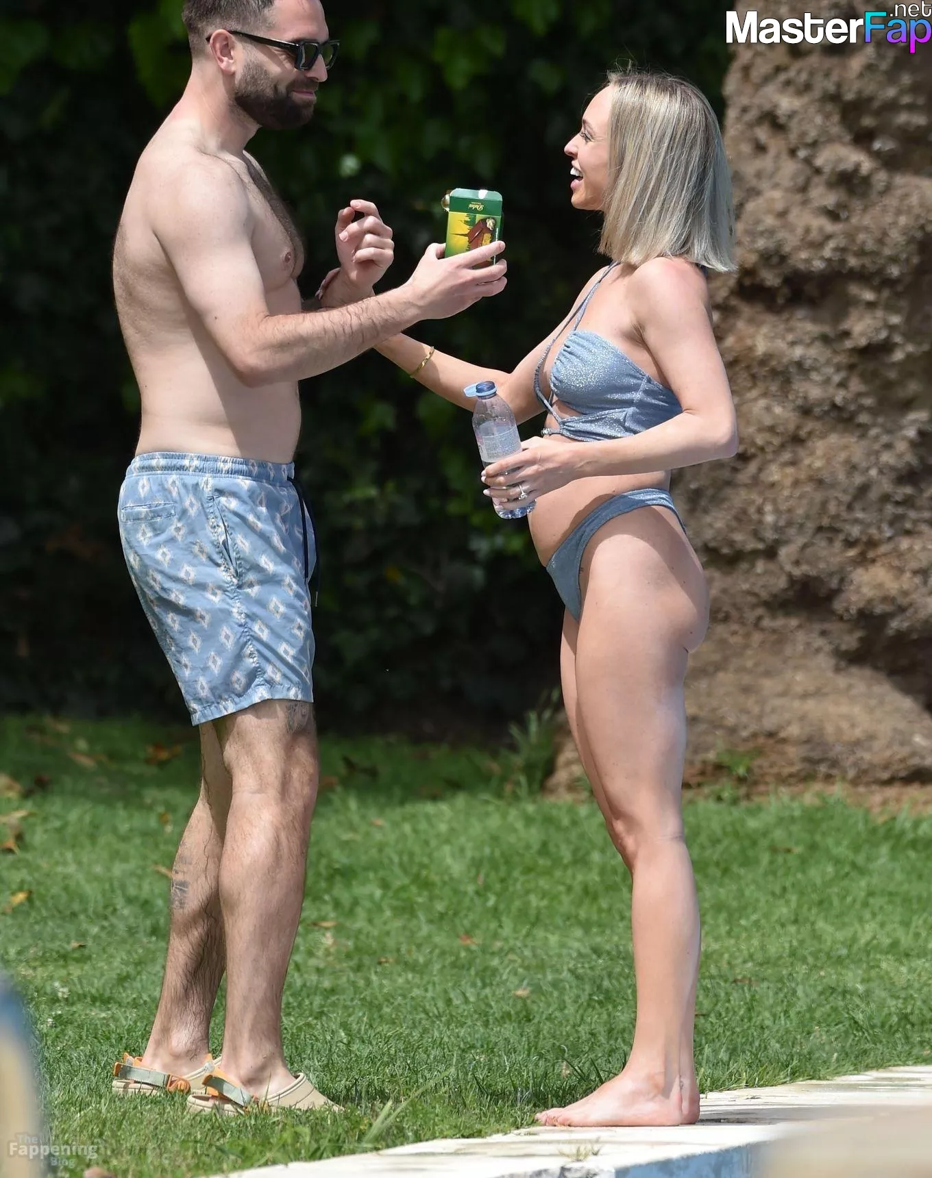 “Hollyoaks” actress Jorgie Porter shows off her bikini body while on holiday with fiancé Ollie Piotrowski in Spain.The actress gave birth to her daughter Peony only 4 months ago. Ollie was seen feeding Jorgie the TikTok Viral ‘Dubai Chocolate‘ around the pool.
