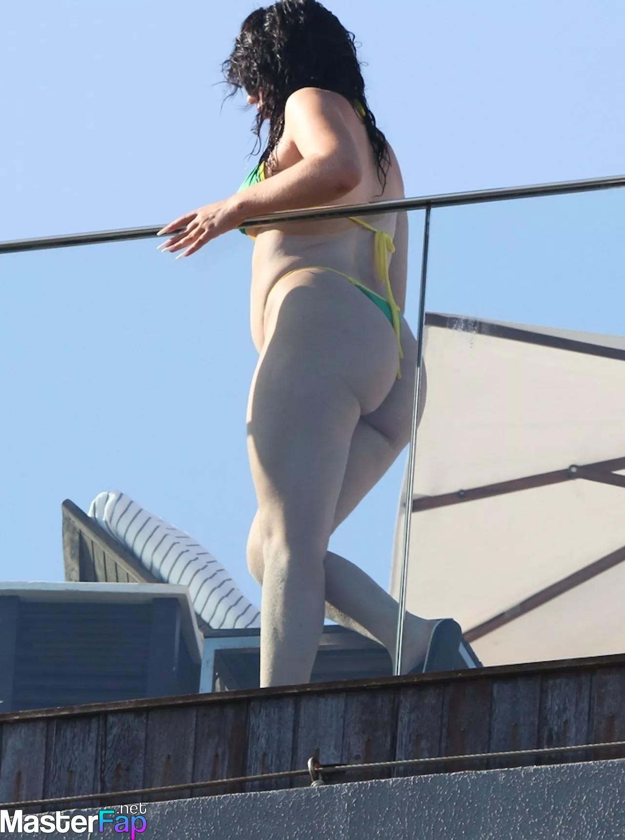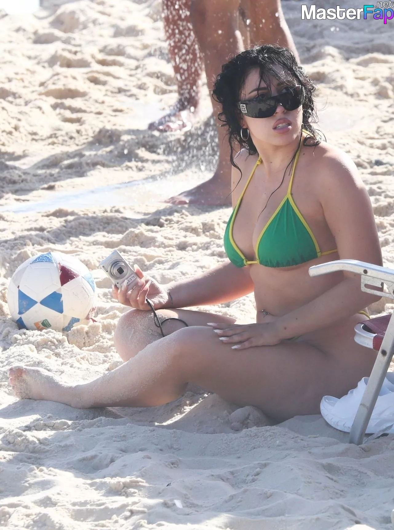 Kali Uchis, a Colombian-American singer and songwriter, may be seen in Rio de Janeiro on March 23, 2023, enjoying the sunlight with her crew while wearing a green and yellow two-piece bikini.