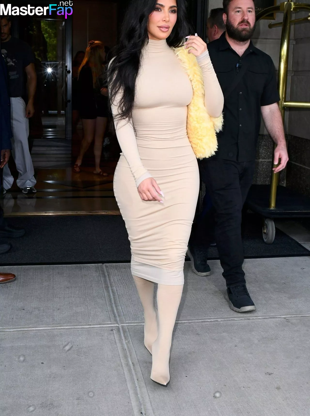 Kim Kardashian is seen in New York, showing off her curvy, sexy bod in a daring, tight nude dress as she exits her hotel.