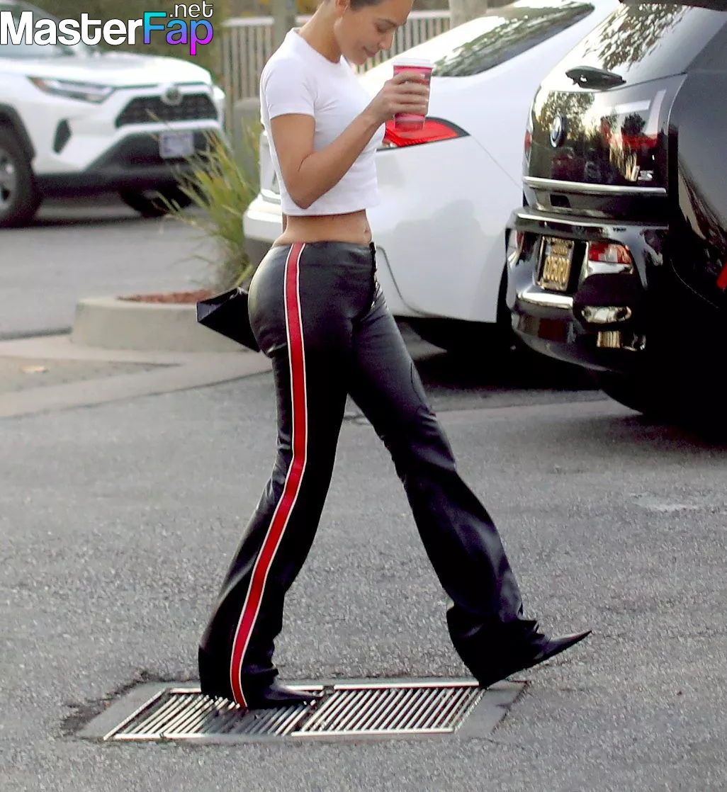 During a coffee run in Los Angeles, Kim Kardashian flaunts her endowments by wearing a white top combined with leather trousers.