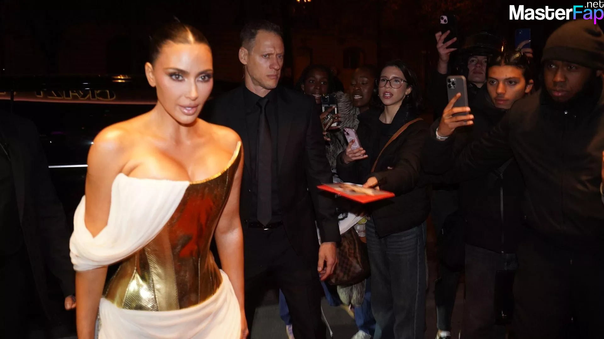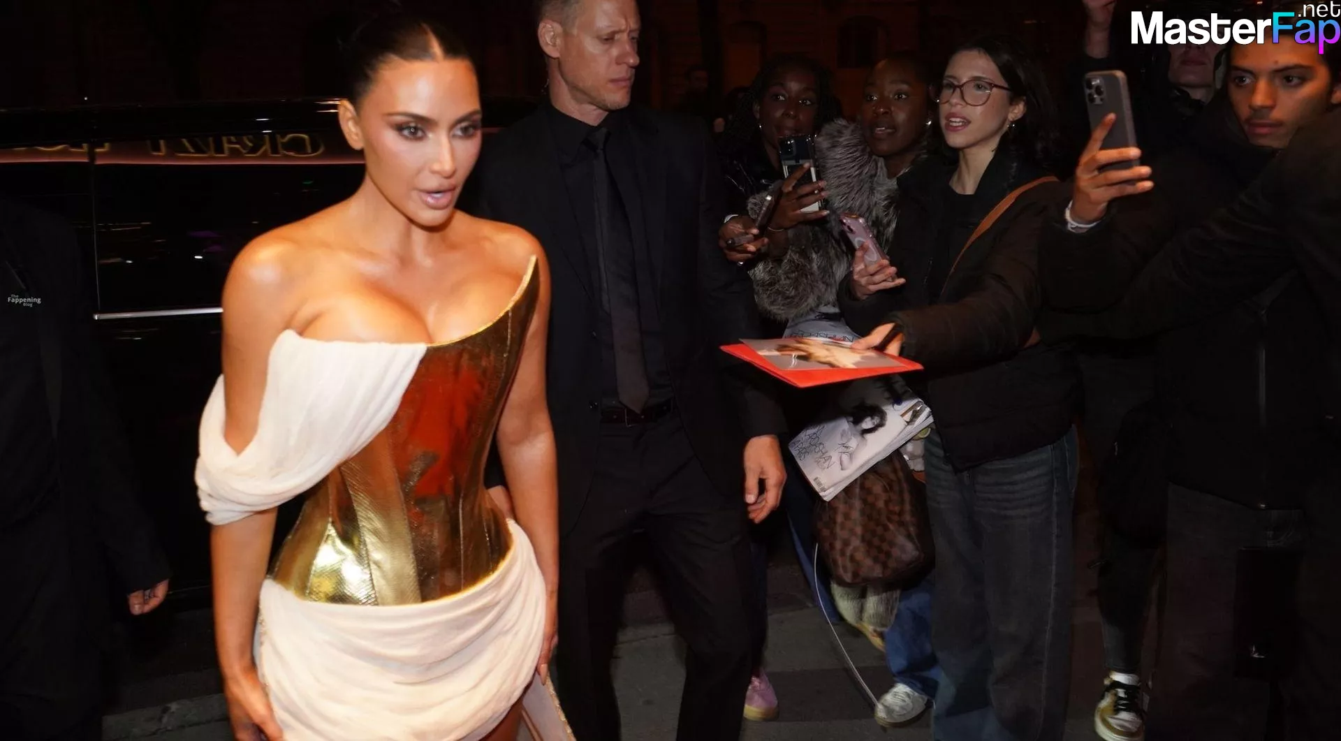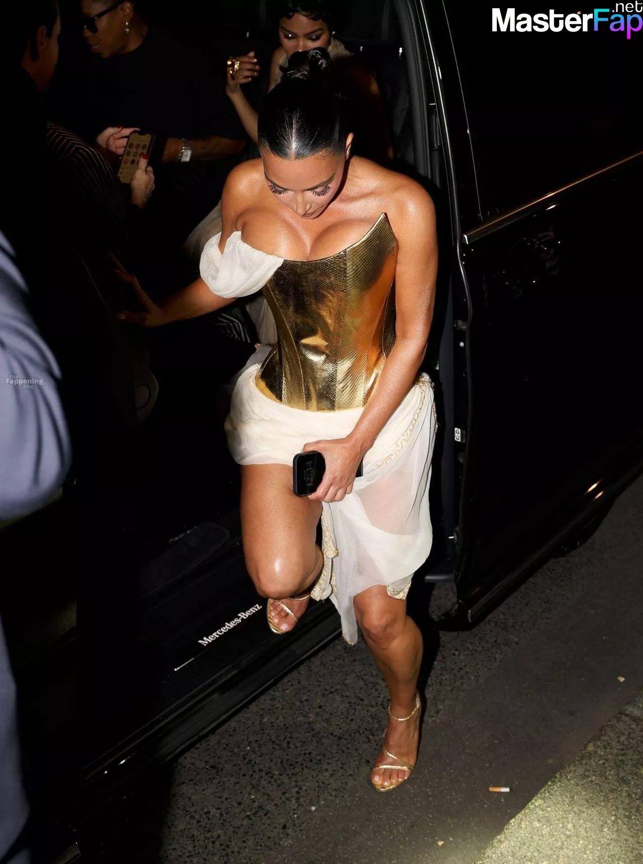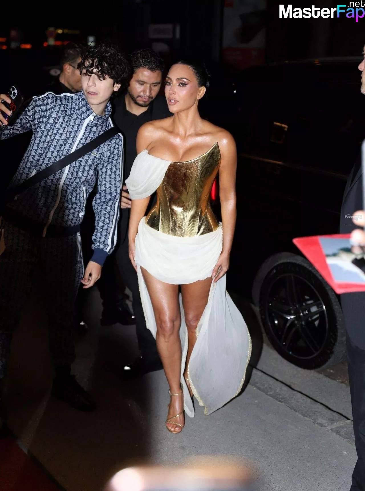 Kim Kardashian rocked up to Crazy Horse in Paris for her 45th birthday bash after the premiere of her Disney+ series All’s Fair. She slipped into a gold corset dress that had her massive boobs spillin’ out with insane cleavage, paired with a high-slit skirt that flashed her body and legs.