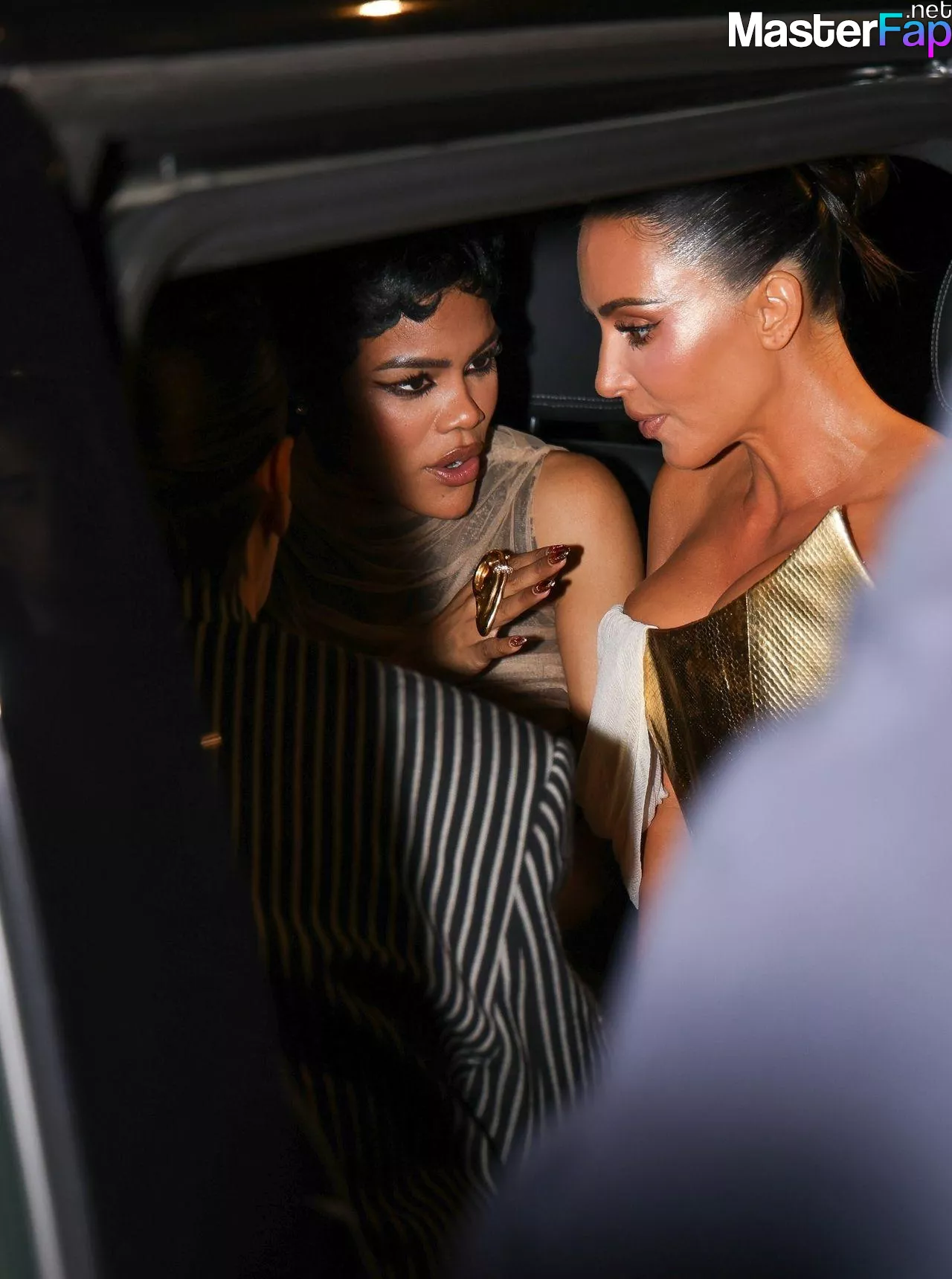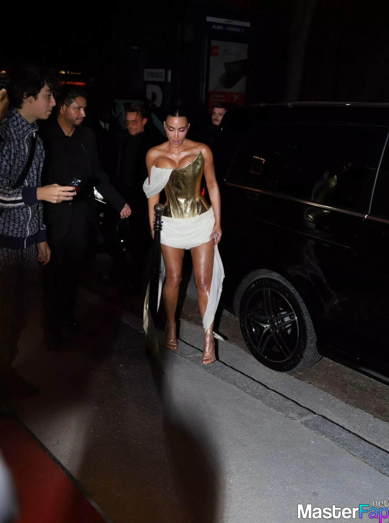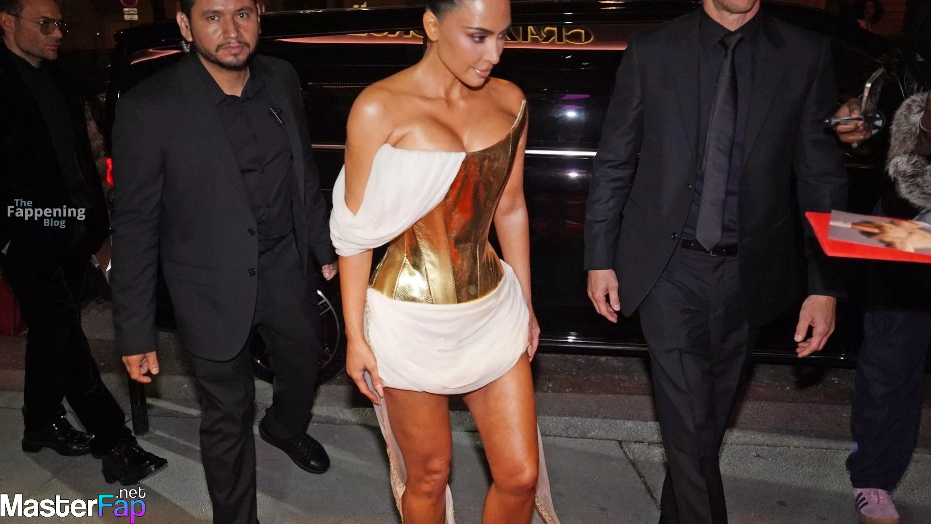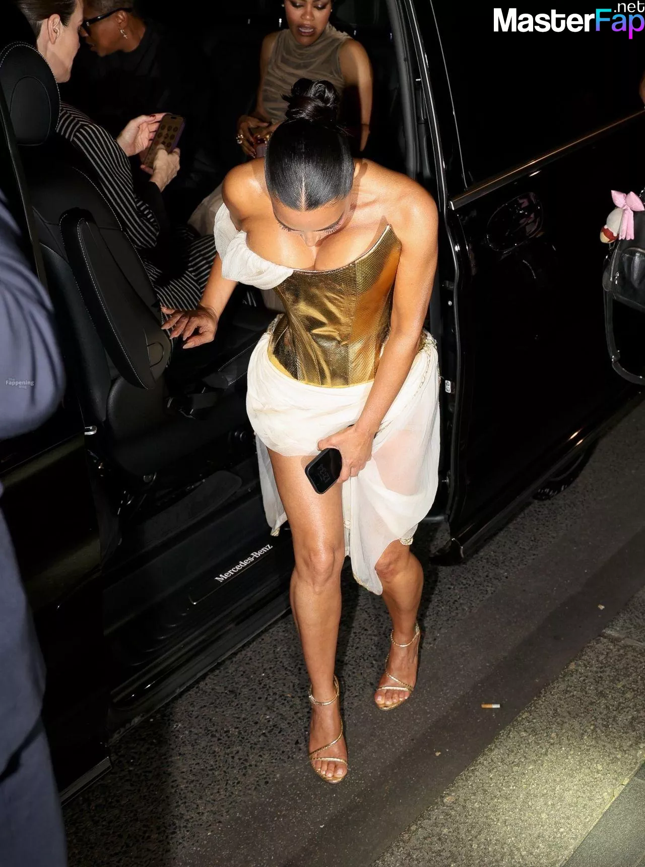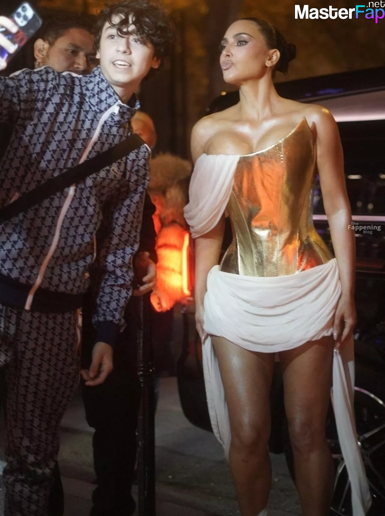 Kim Kardashian rocked up to Crazy Horse in Paris for her 45th birthday bash after the premiere of her Disney+ series All’s Fair. She slipped into a gold corset dress that had her massive boobs spillin’ out with insane cleavage, paired with a high-slit skirt that flashed her body and legs.