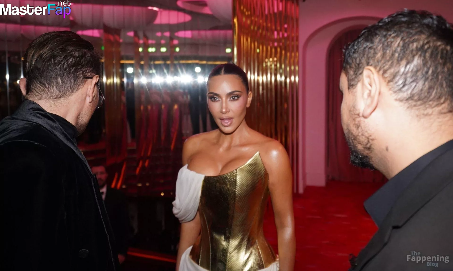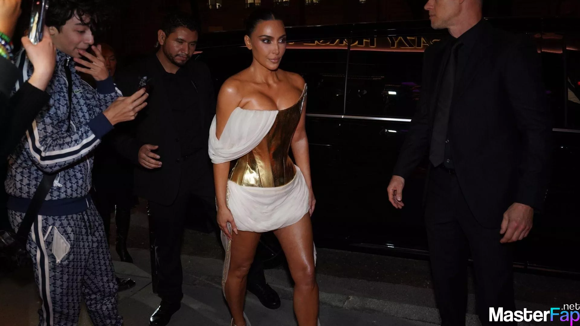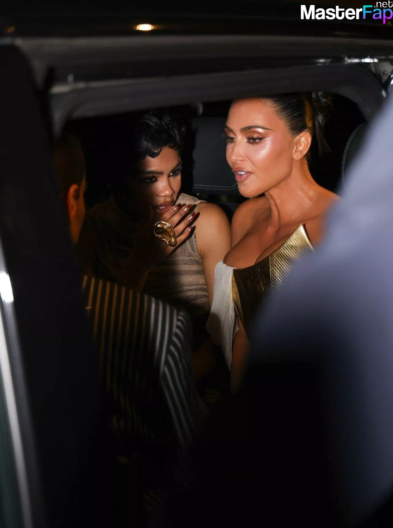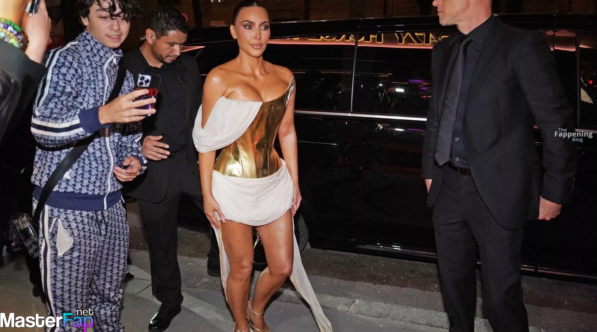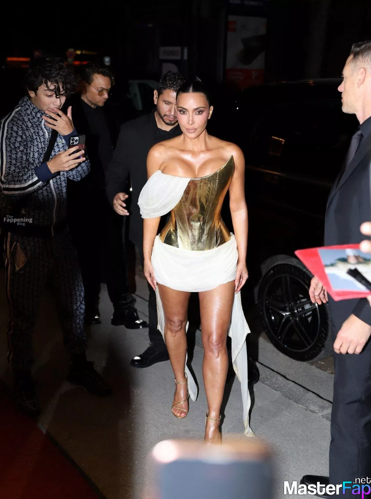 Kim Kardashian rocked up to Crazy Horse in Paris for her 45th birthday bash after the premiere of her Disney+ series All’s Fair. She slipped into a gold corset dress that had her massive boobs spillin’ out with insane cleavage, paired with a high-slit skirt that flashed her body and legs.