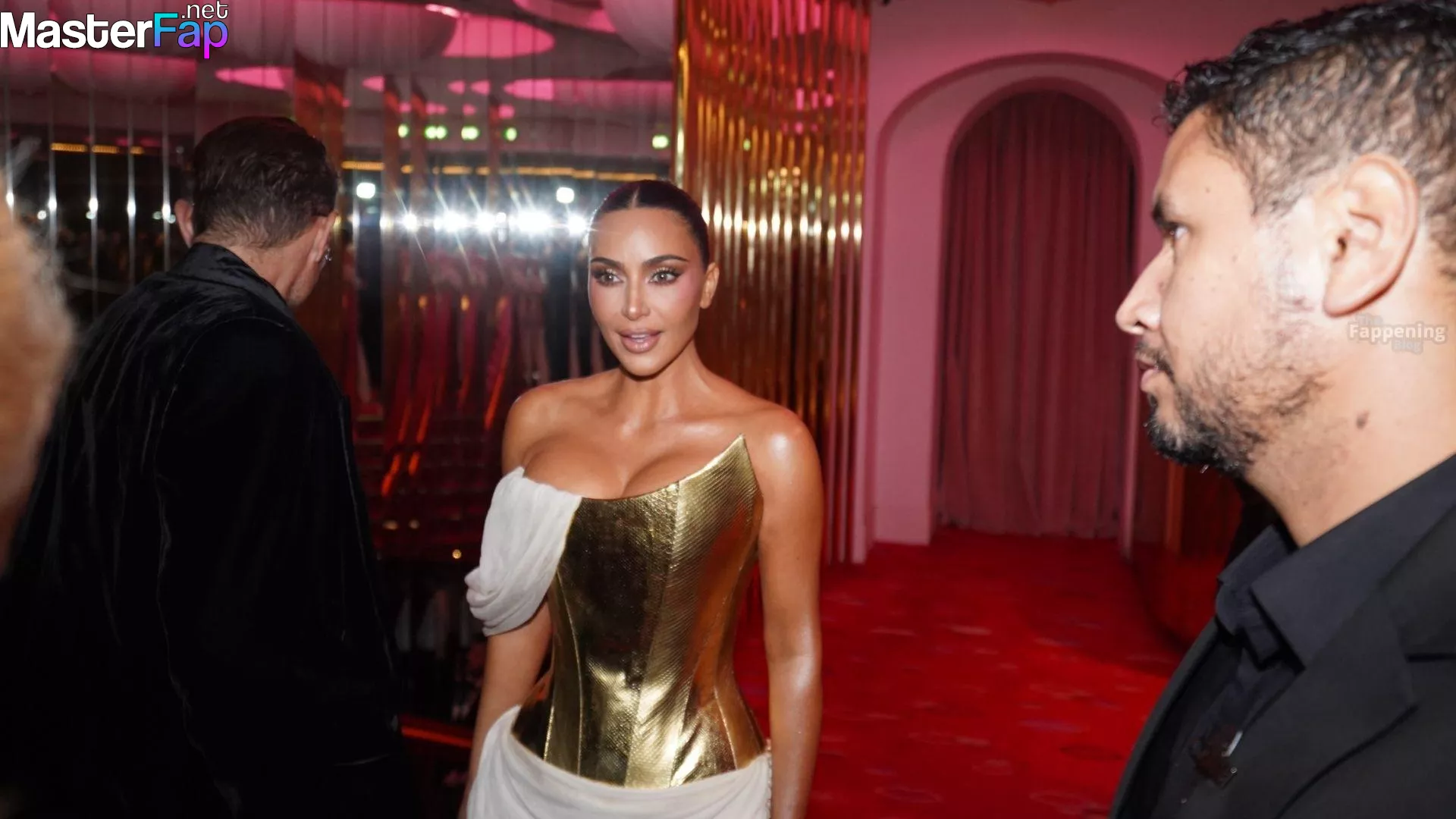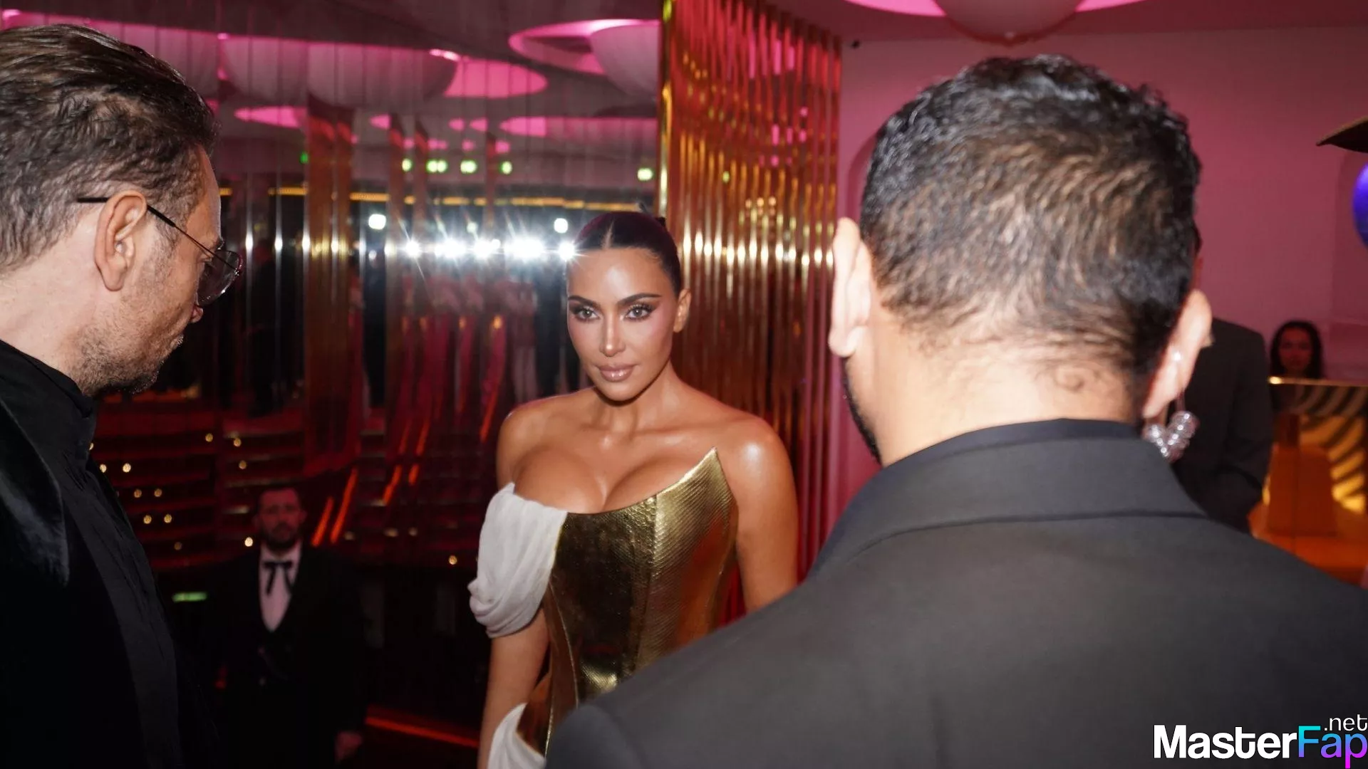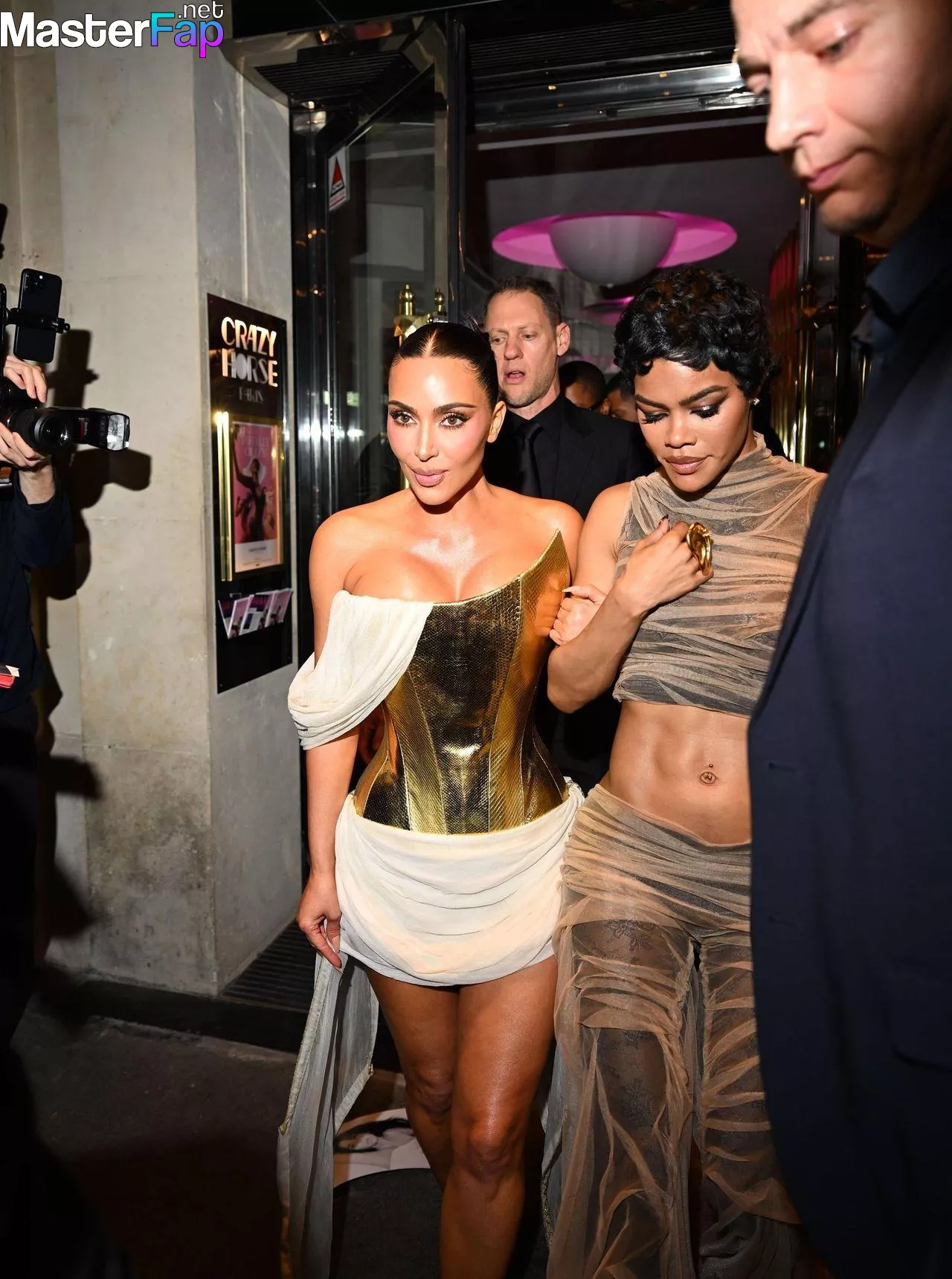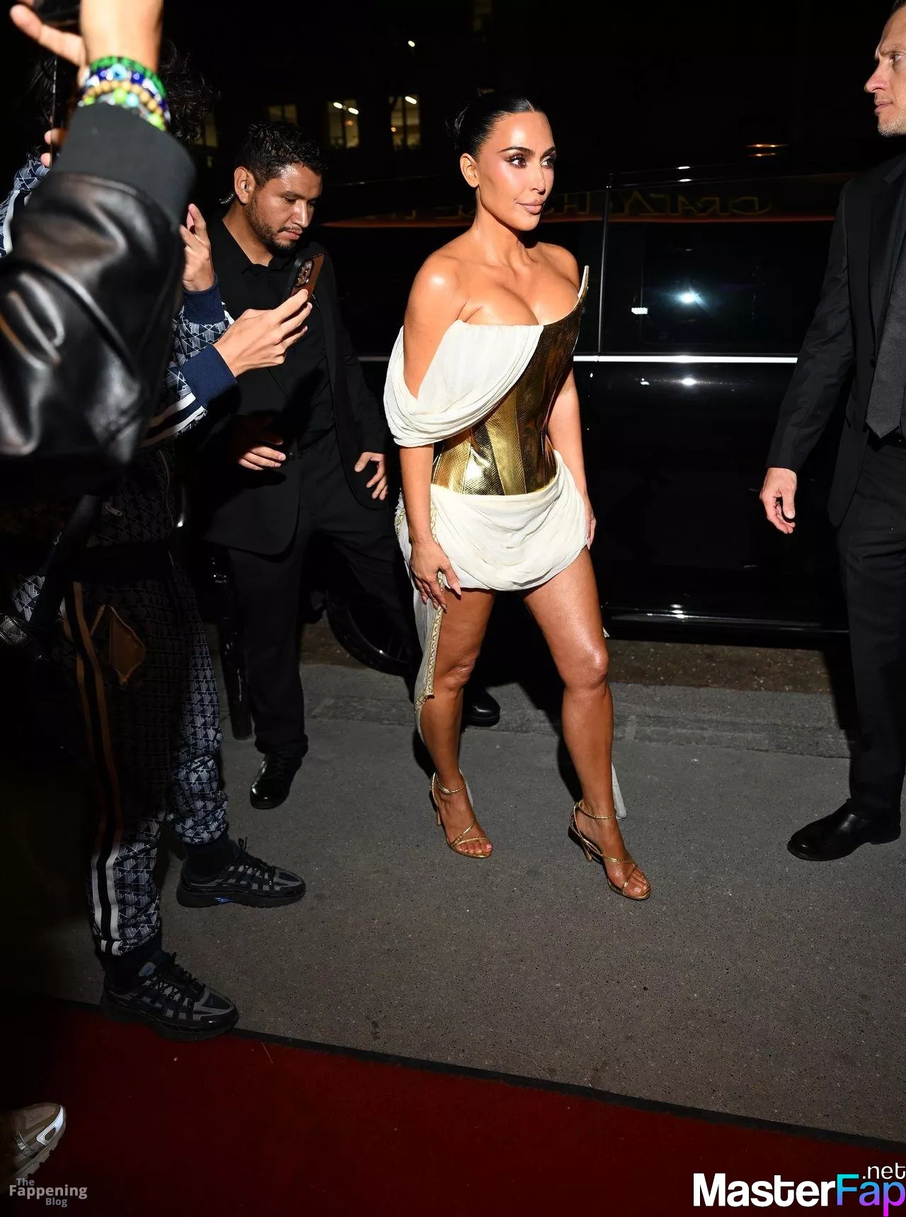 Kim Kardashian rocked up to Crazy Horse in Paris for her 45th birthday bash after the premiere of her Disney+ series All’s Fair. She slipped into a gold corset dress that had her massive boobs spillin’ out with insane cleavage, paired with a high-slit skirt that flashed her body and legs.