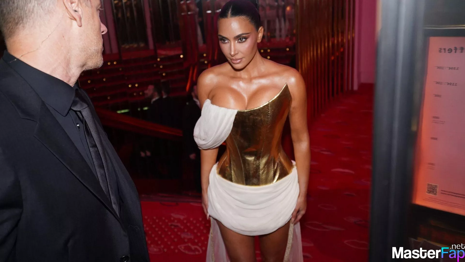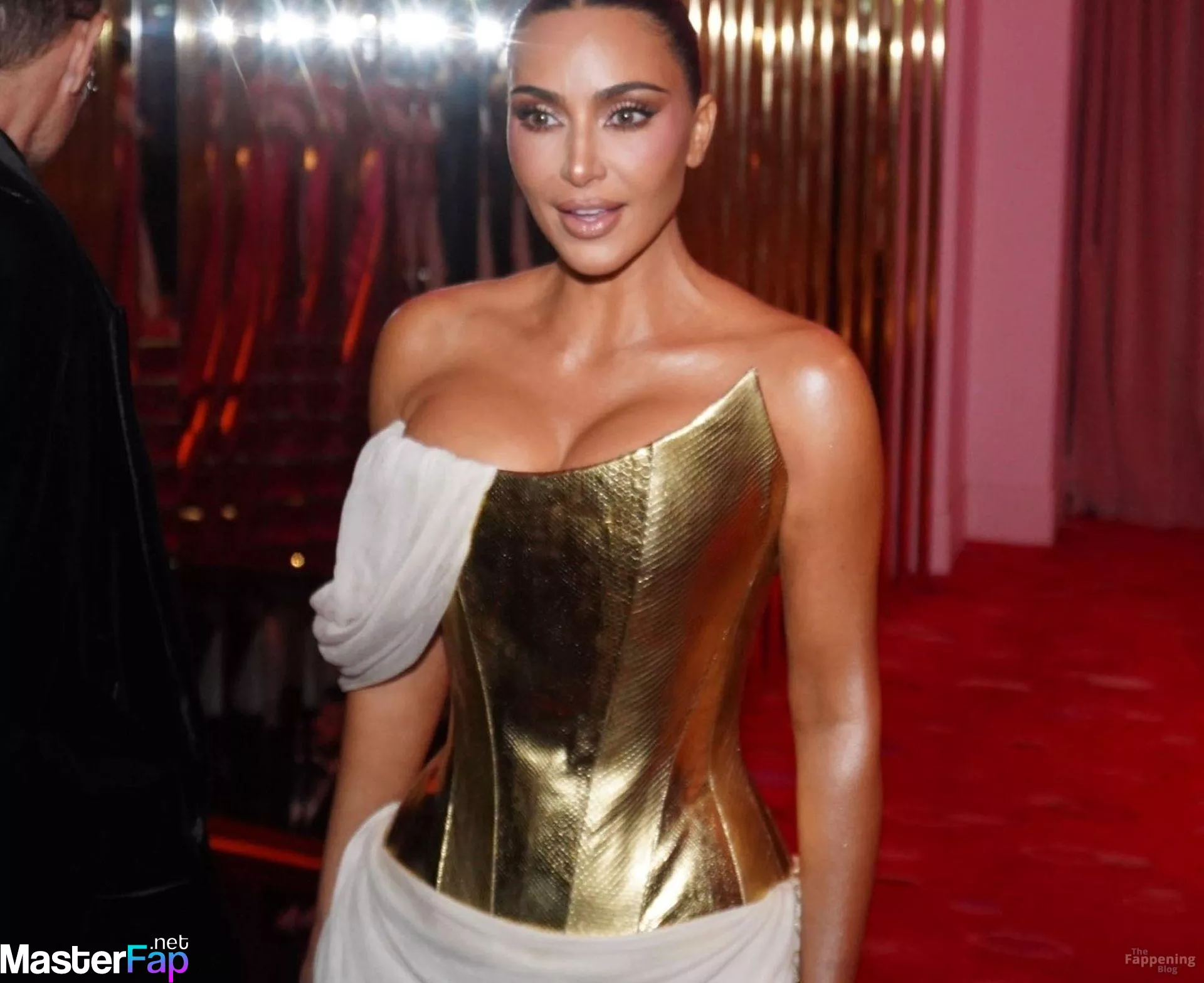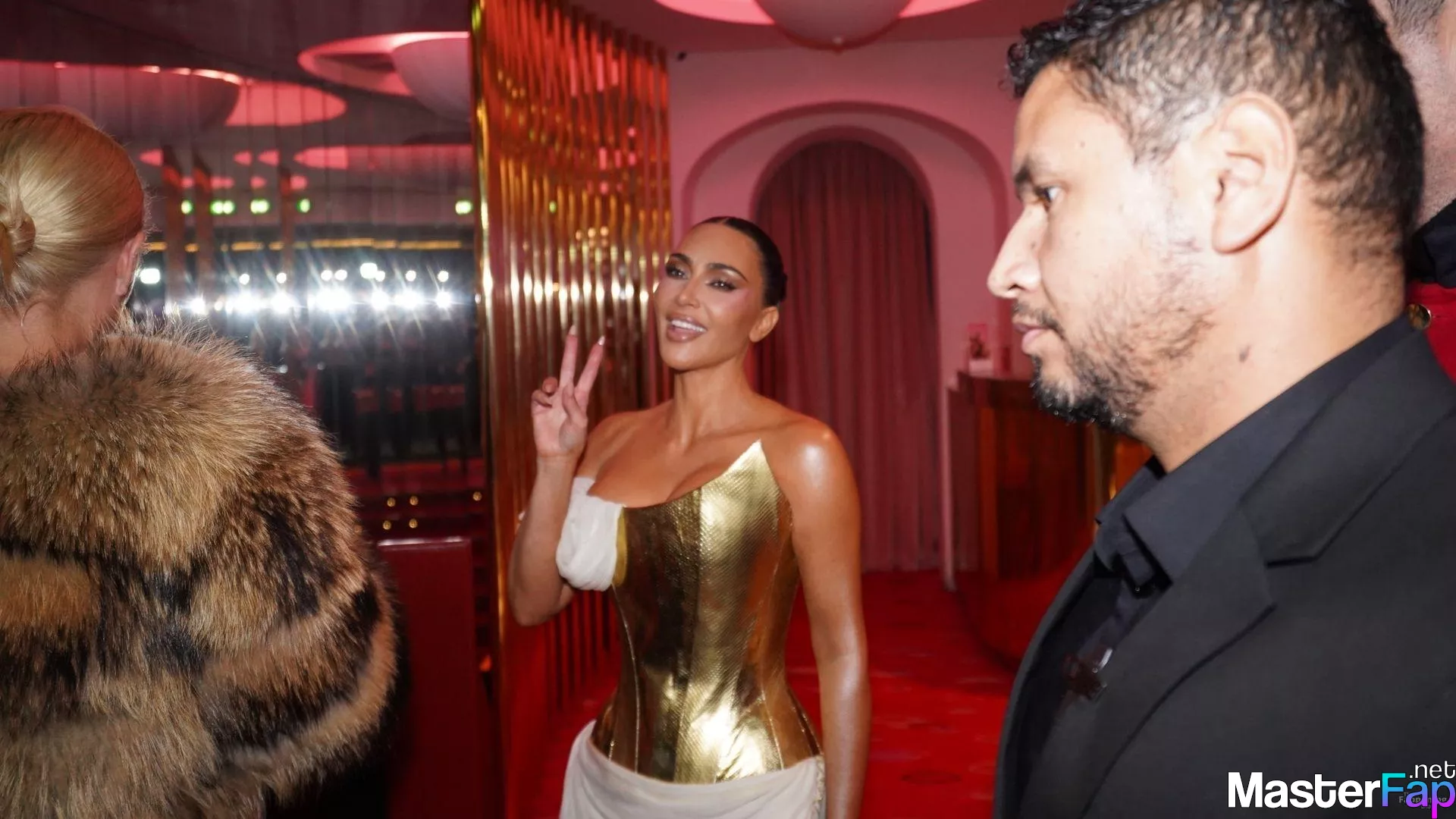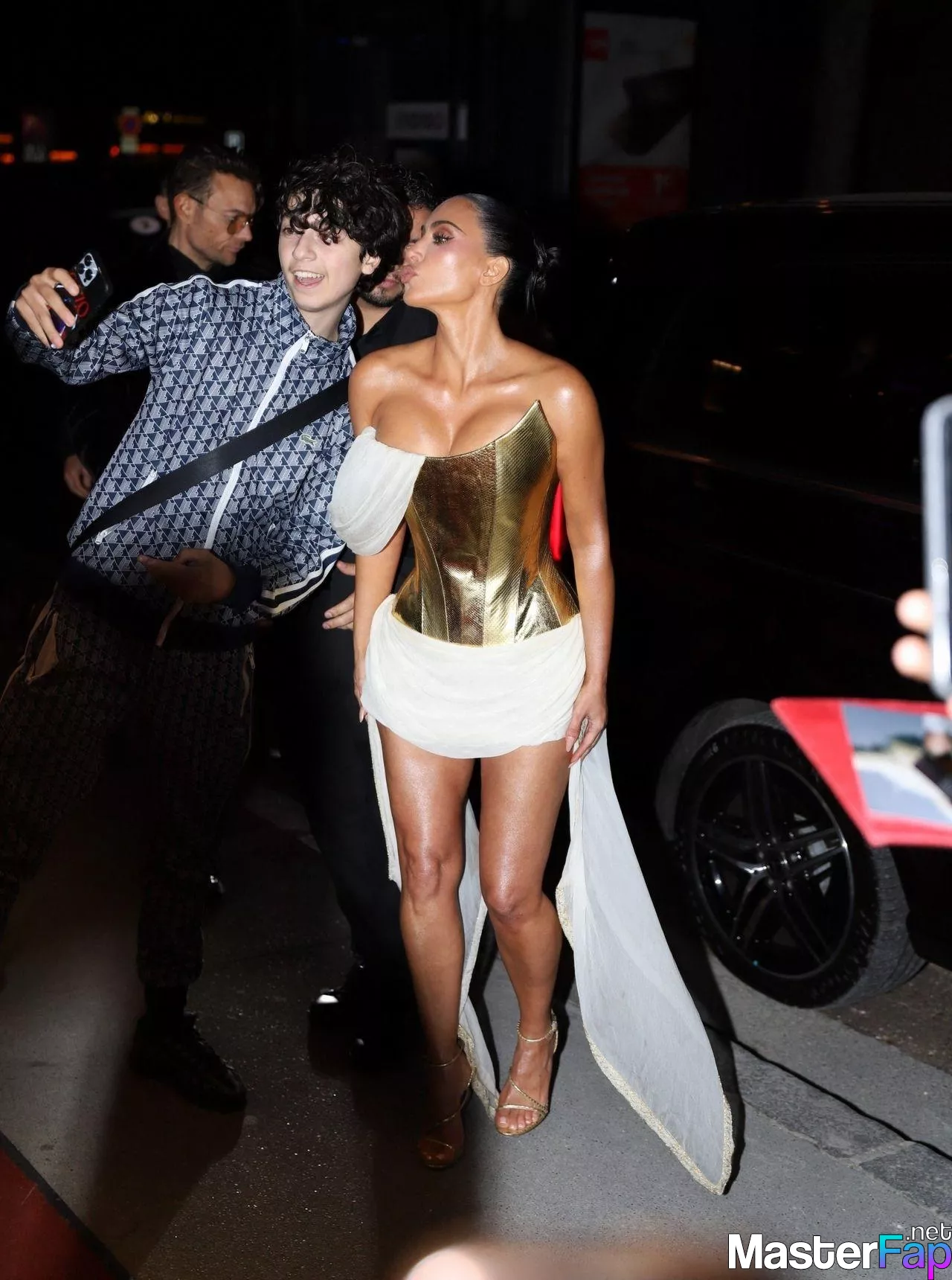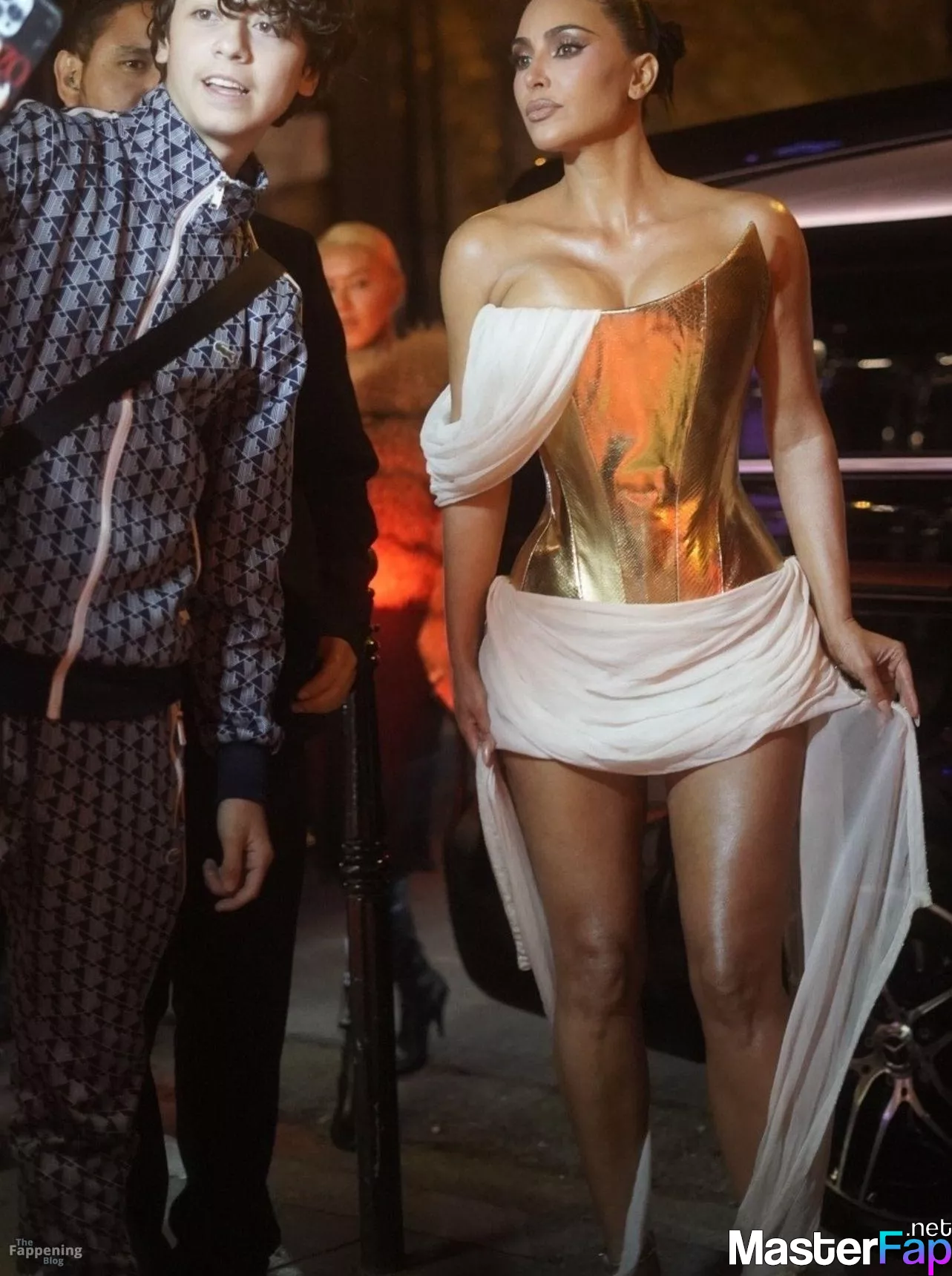 Kim Kardashian rocked up to Crazy Horse in Paris for her 45th birthday bash after the premiere of her Disney+ series All’s Fair. She slipped into a gold corset dress that had her massive boobs spillin’ out with insane cleavage, paired with a high-slit skirt that flashed her body and legs.