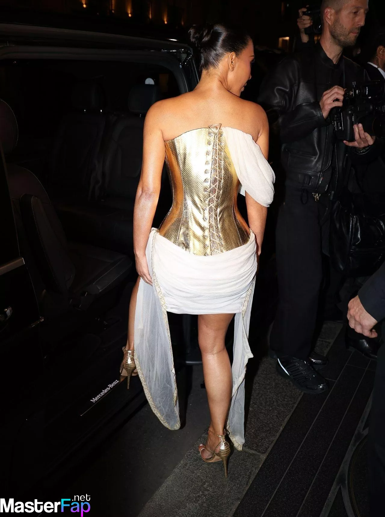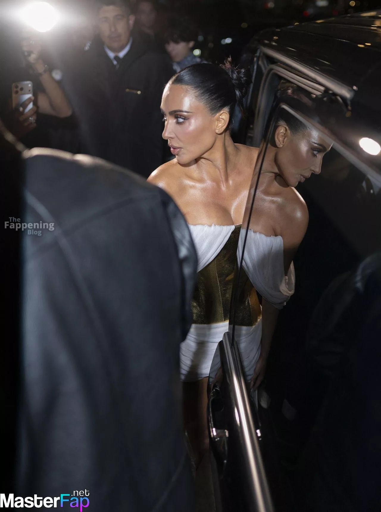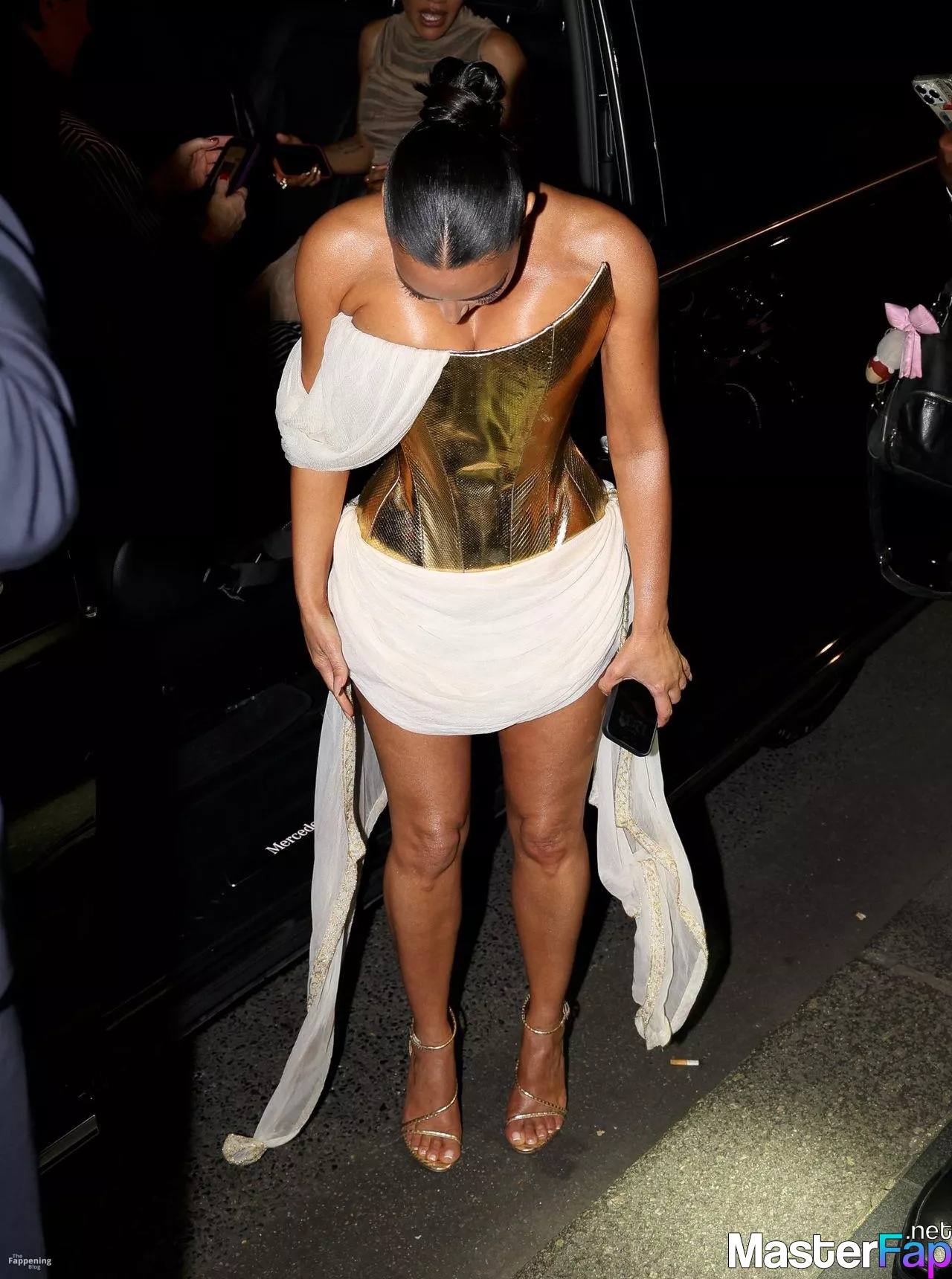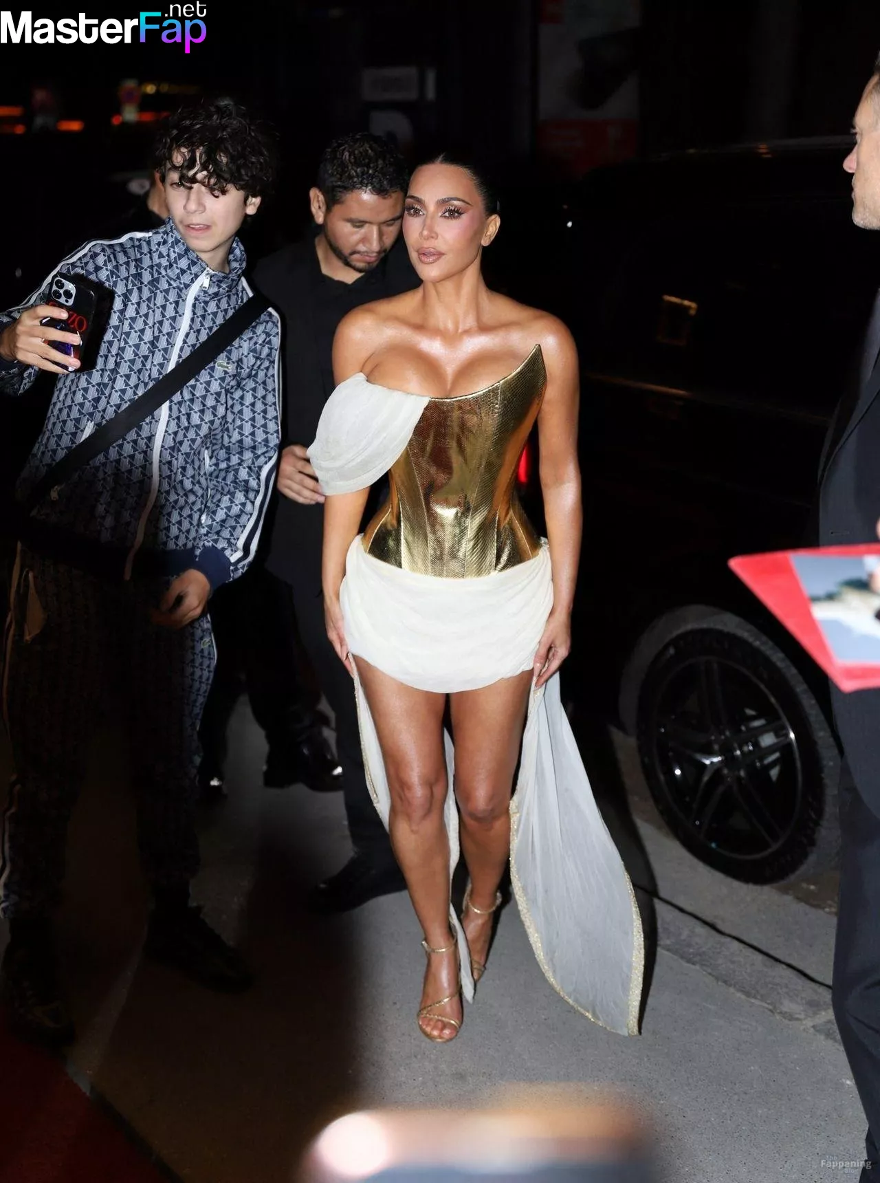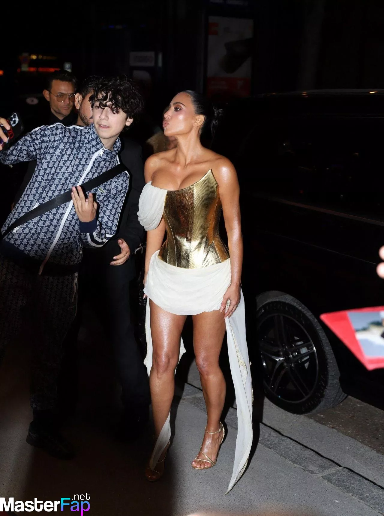 Kim Kardashian rocked up to Crazy Horse in Paris for her 45th birthday bash after the premiere of her Disney+ series All’s Fair. She slipped into a gold corset dress that had her massive boobs spillin’ out with insane cleavage, paired with a high-slit skirt that flashed her body and legs.