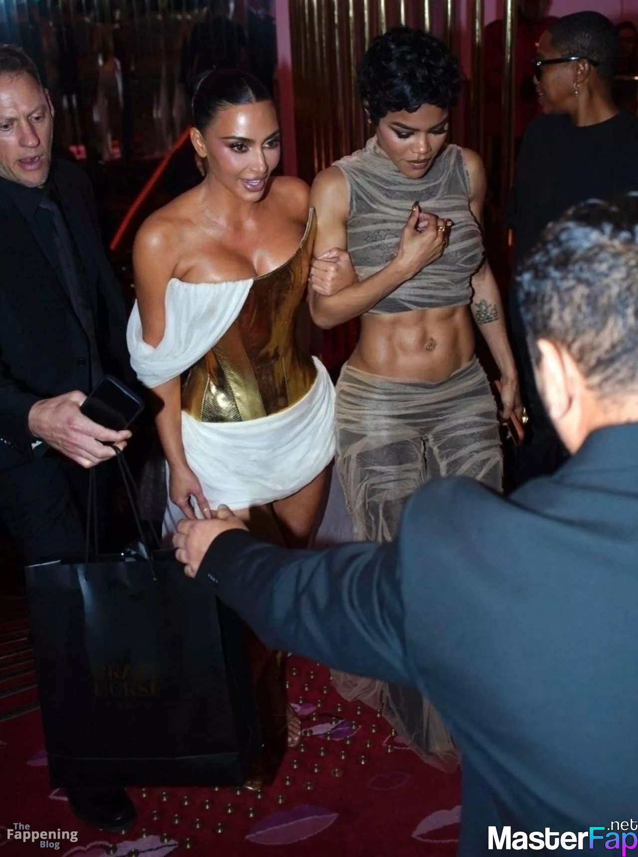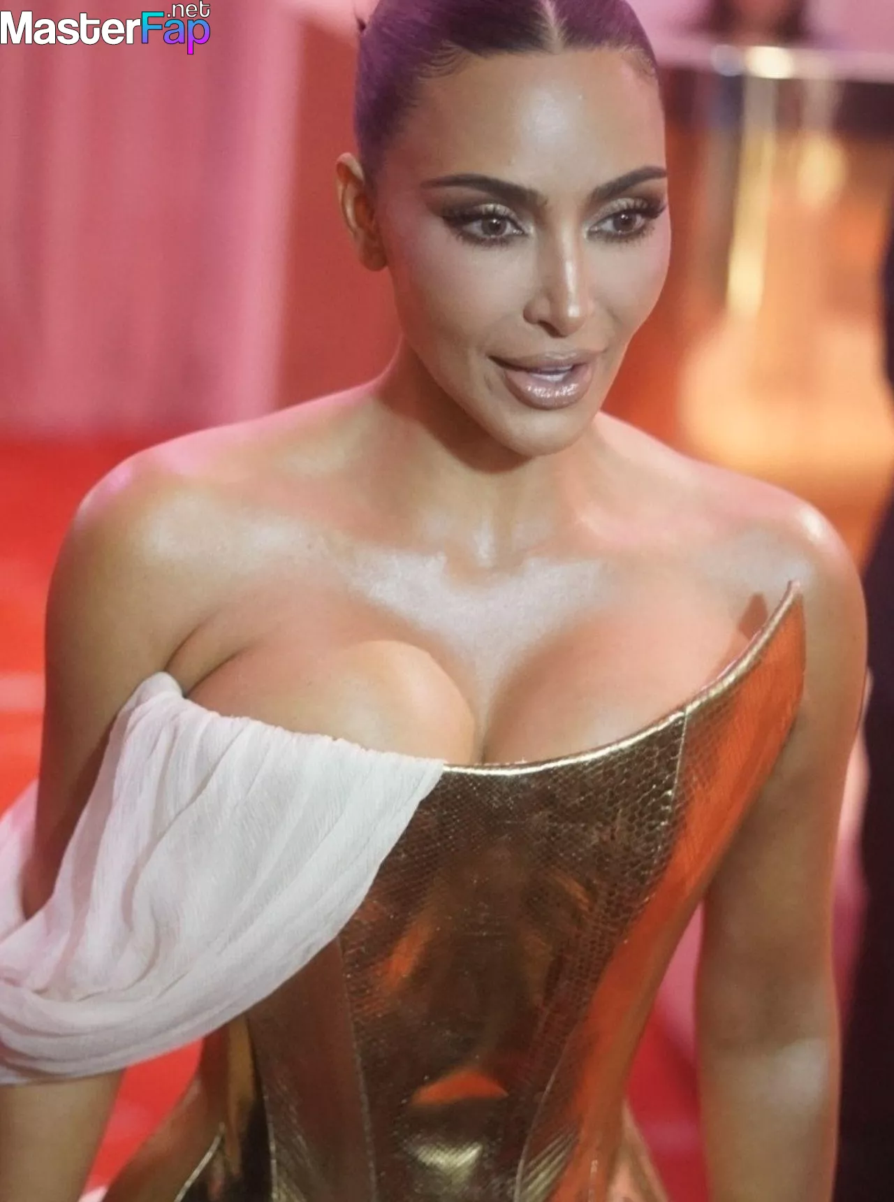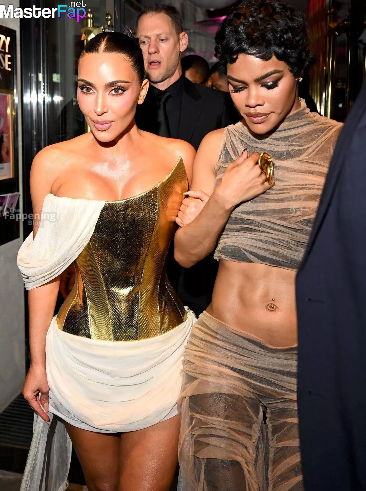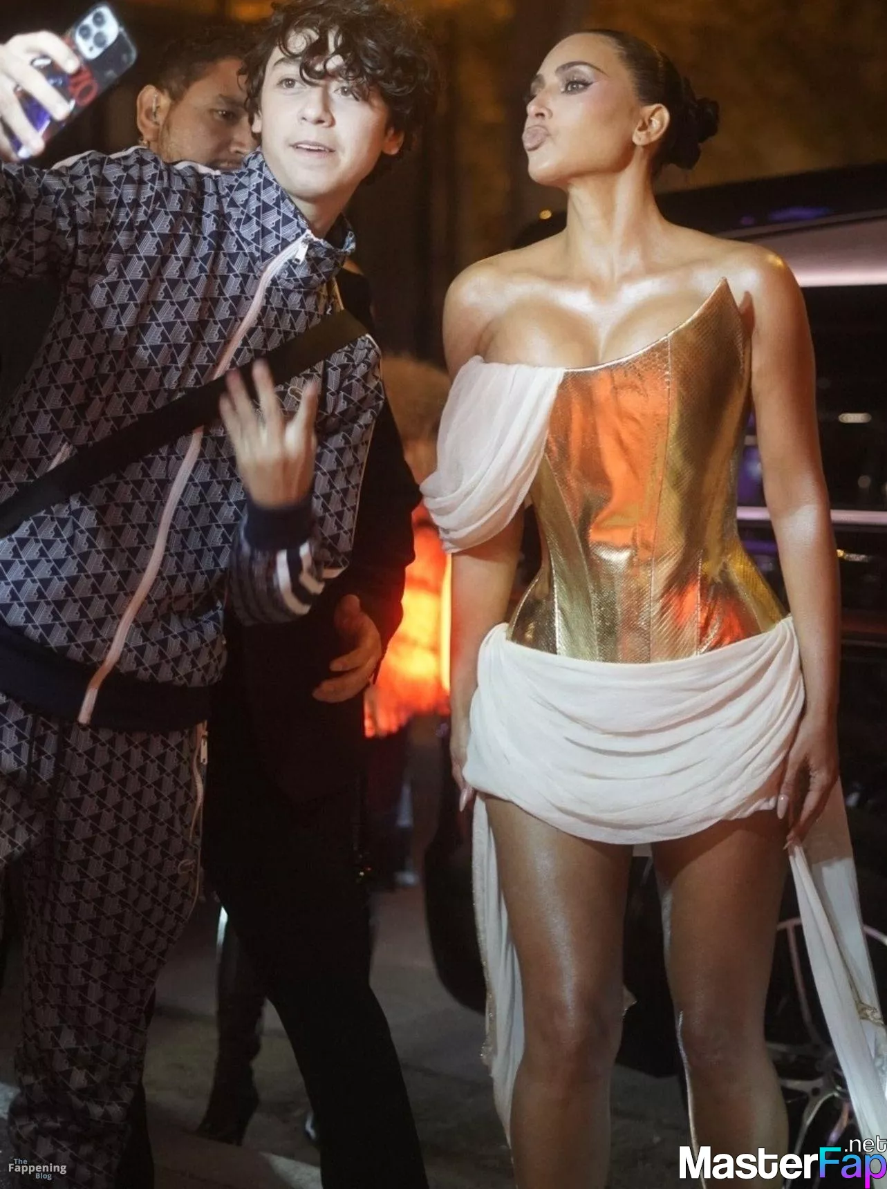 Kim Kardashian rocked up to Crazy Horse in Paris for her 45th birthday bash after the premiere of her Disney+ series All’s Fair. She slipped into a gold corset dress that had her massive boobs spillin’ out with insane cleavage, paired with a high-slit skirt that flashed her body and legs.