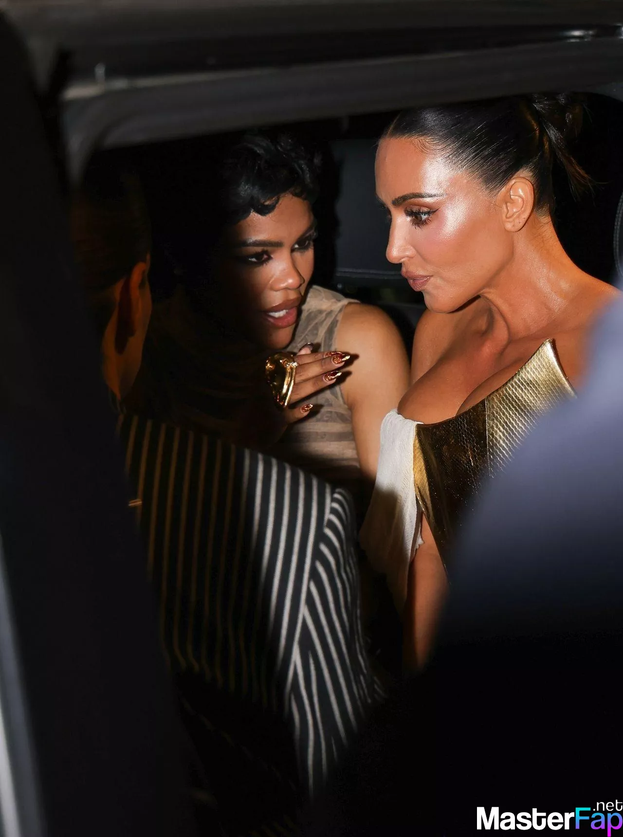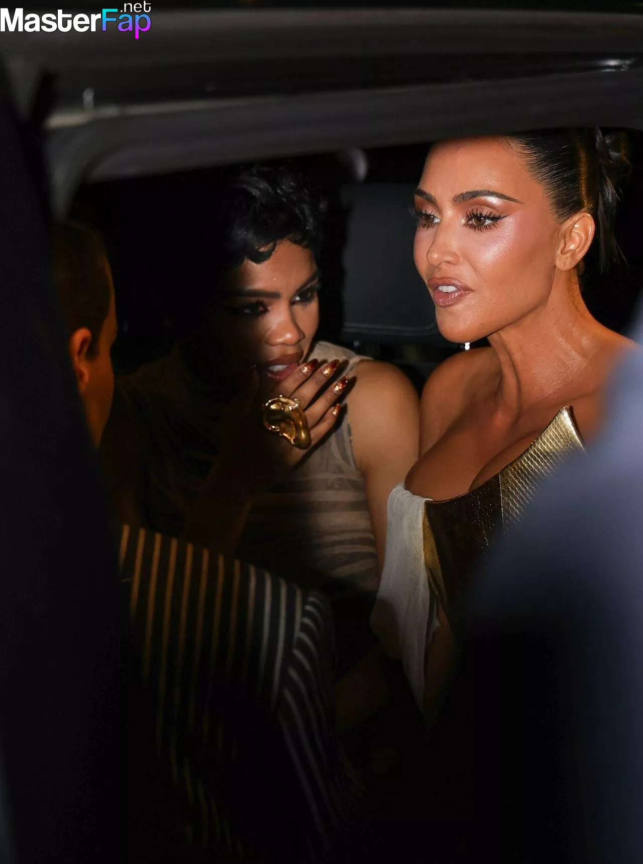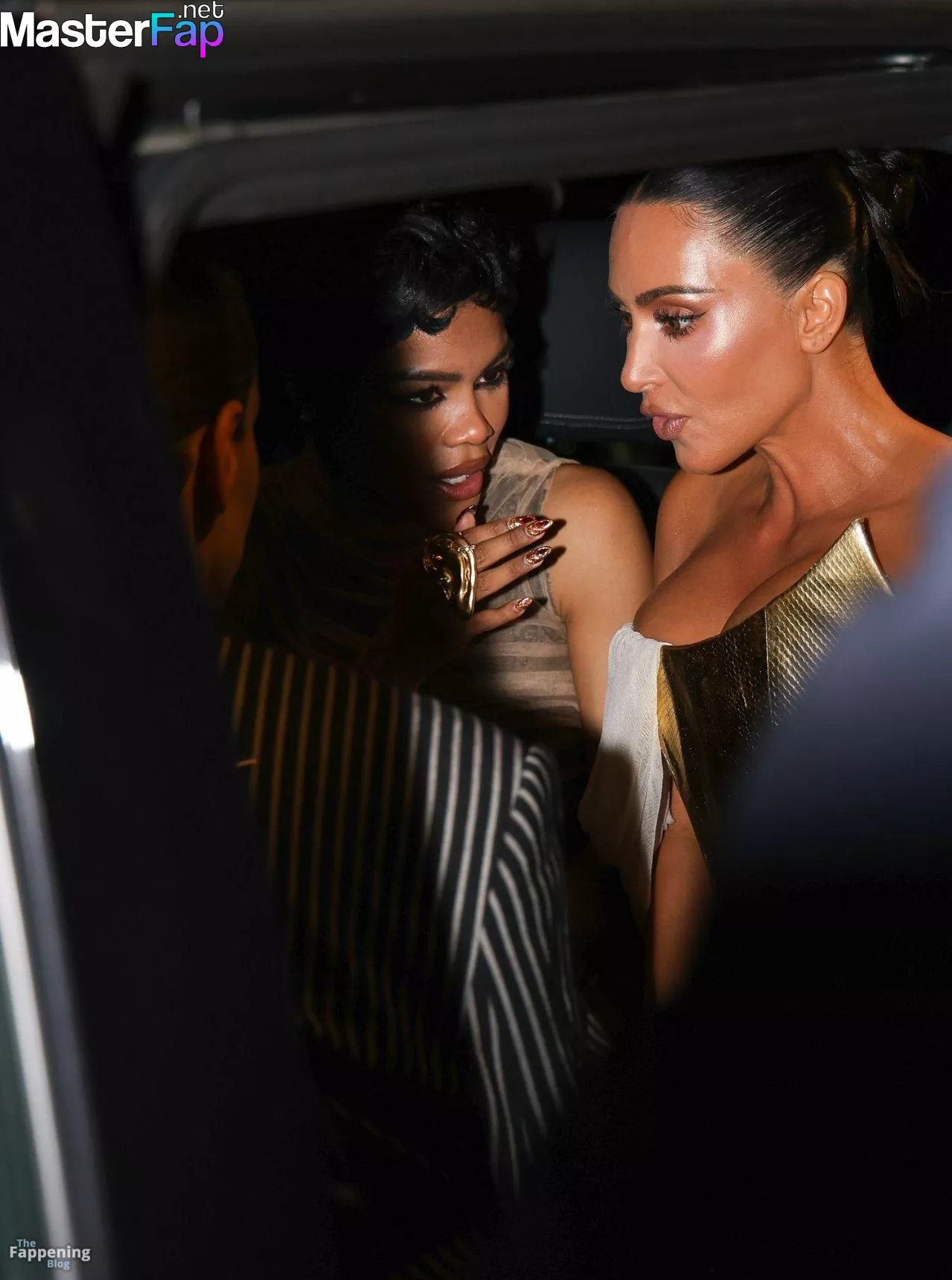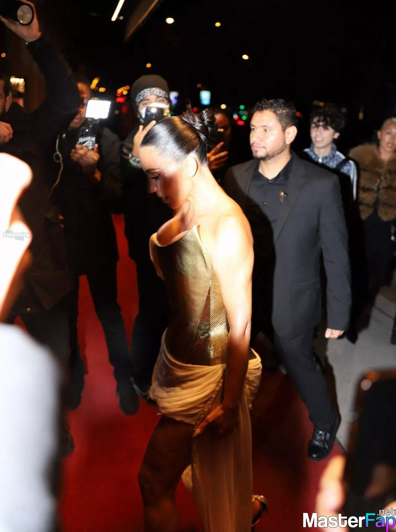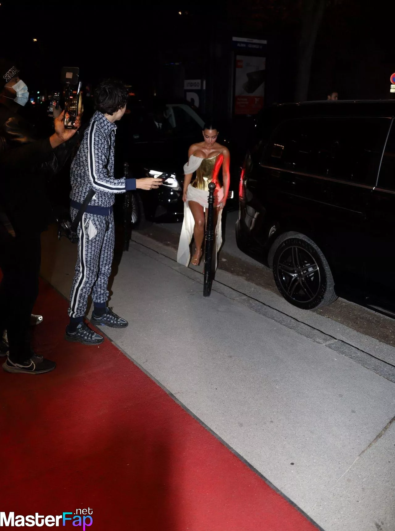 Kim Kardashian rocked up to Crazy Horse in Paris for her 45th birthday bash after the premiere of her Disney+ series All’s Fair. She slipped into a gold corset dress that had her massive boobs spillin’ out with insane cleavage, paired with a high-slit skirt that flashed her body and legs.
