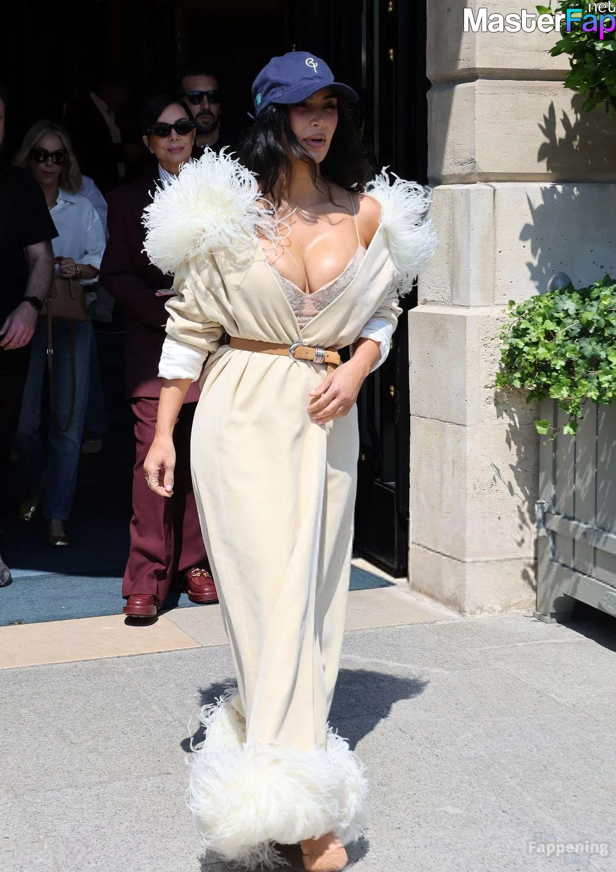Peep Kim Kardashian’s massive boobs. The reality TV star was seen in a feathered dress with a neckline in Paris.
