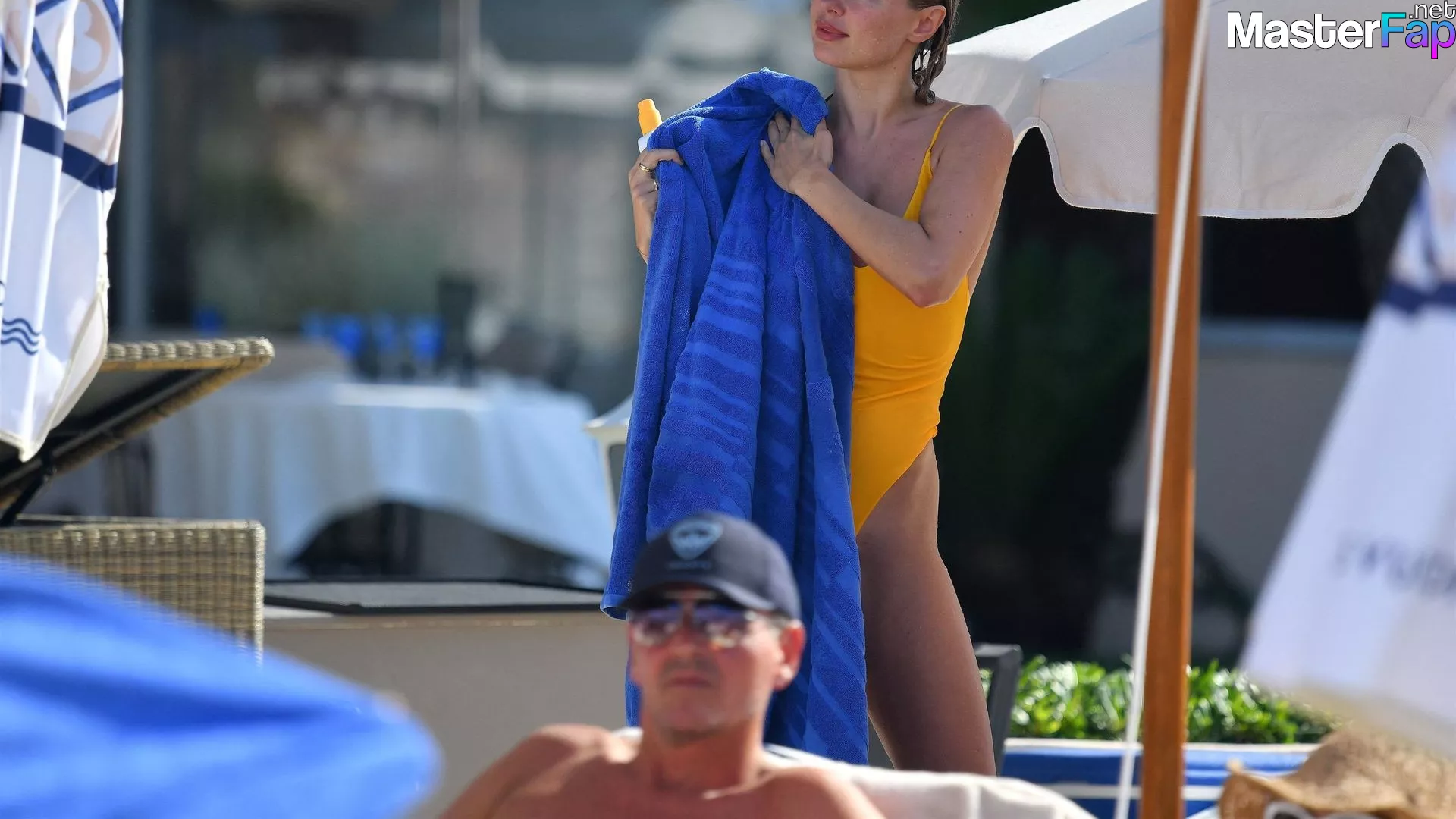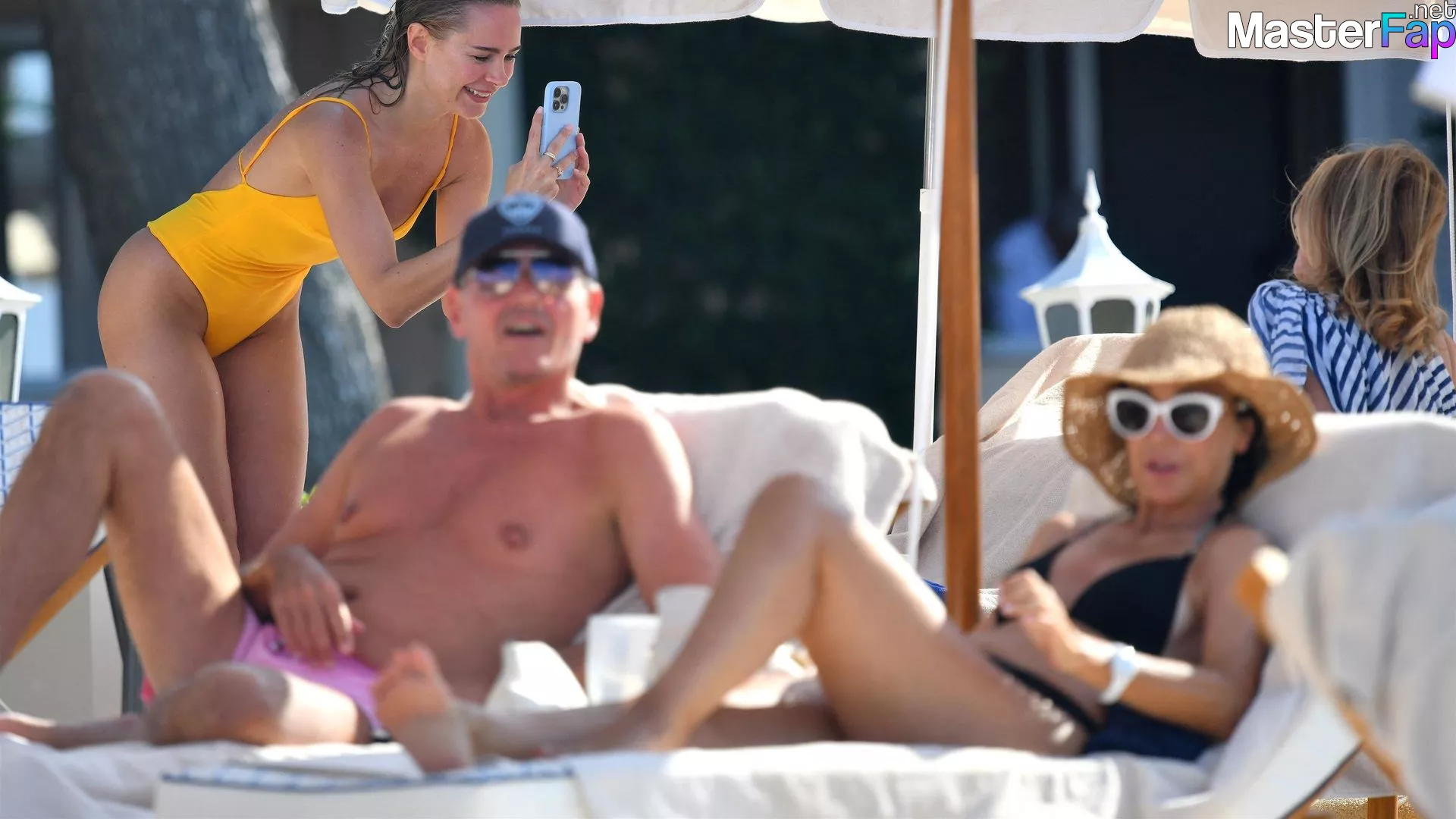 Kimberley Garner, who stars in "Made in Chelsea," is very stunning as she takes a shower on the beach with her mother at the Cheval Blanc Hotel in Saint-Tropez, France, on July 29, 2023. She is wearing an orange bikini.