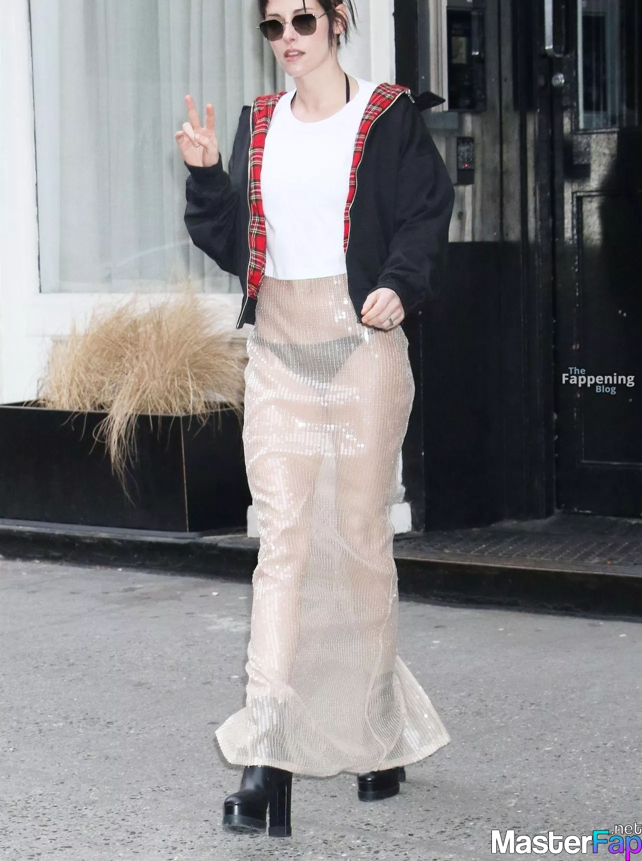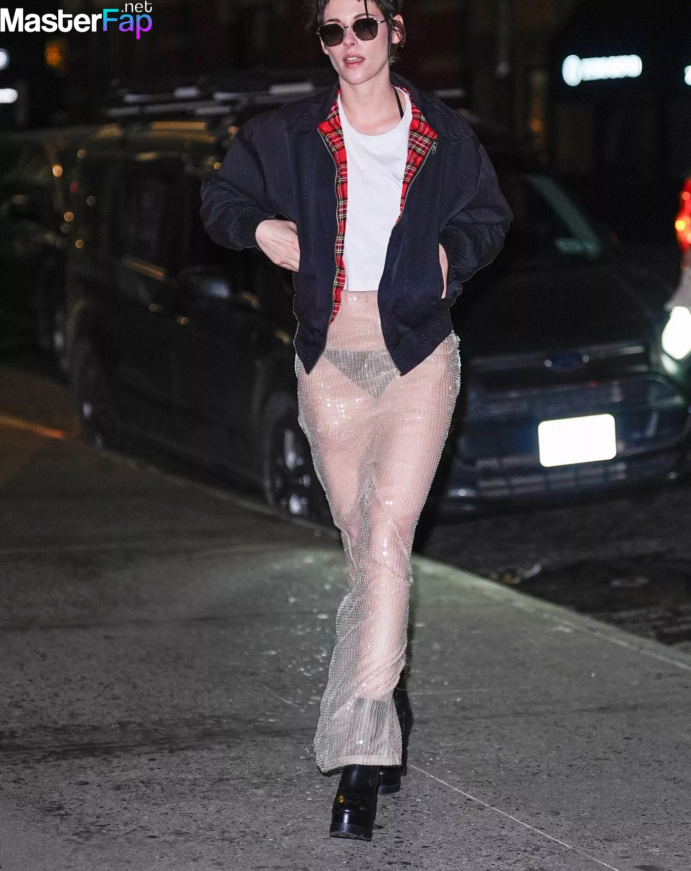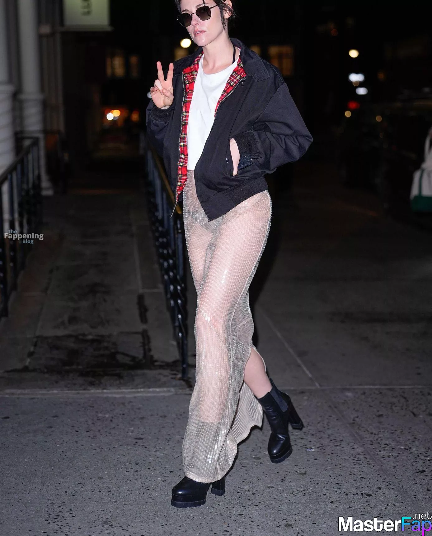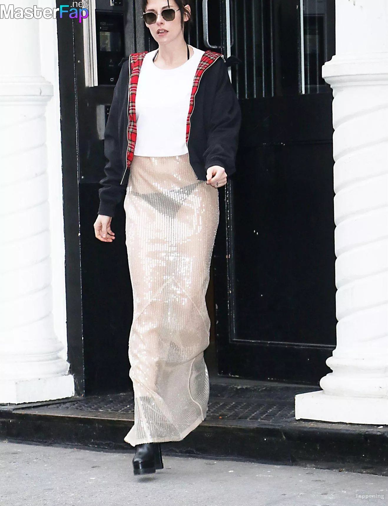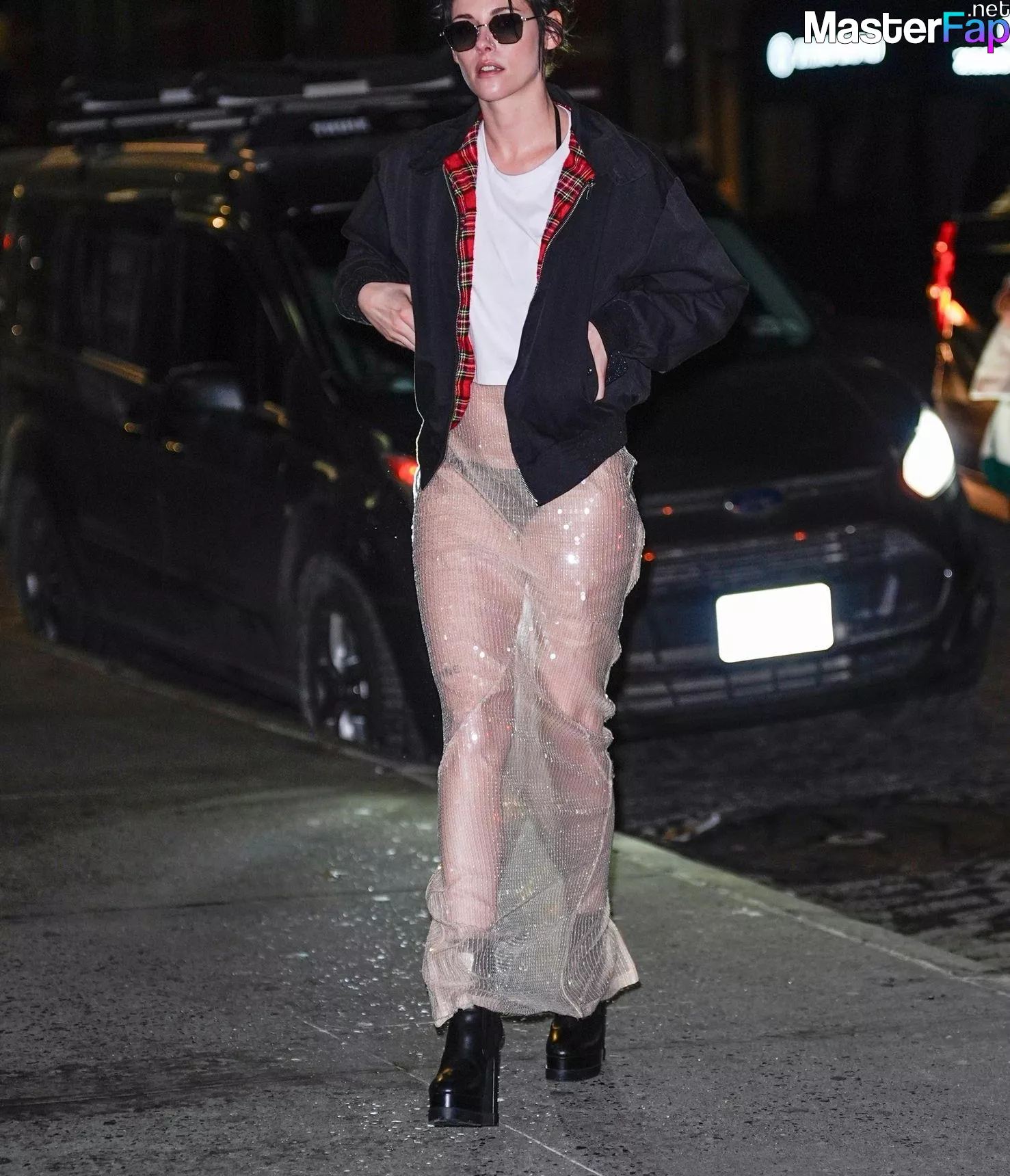 The Fappening Star Kristen Stewart steps out in a revealing outfit in New York City. The American actress wore a black jacket, white crop top, sheer skirt, and black platform heels.