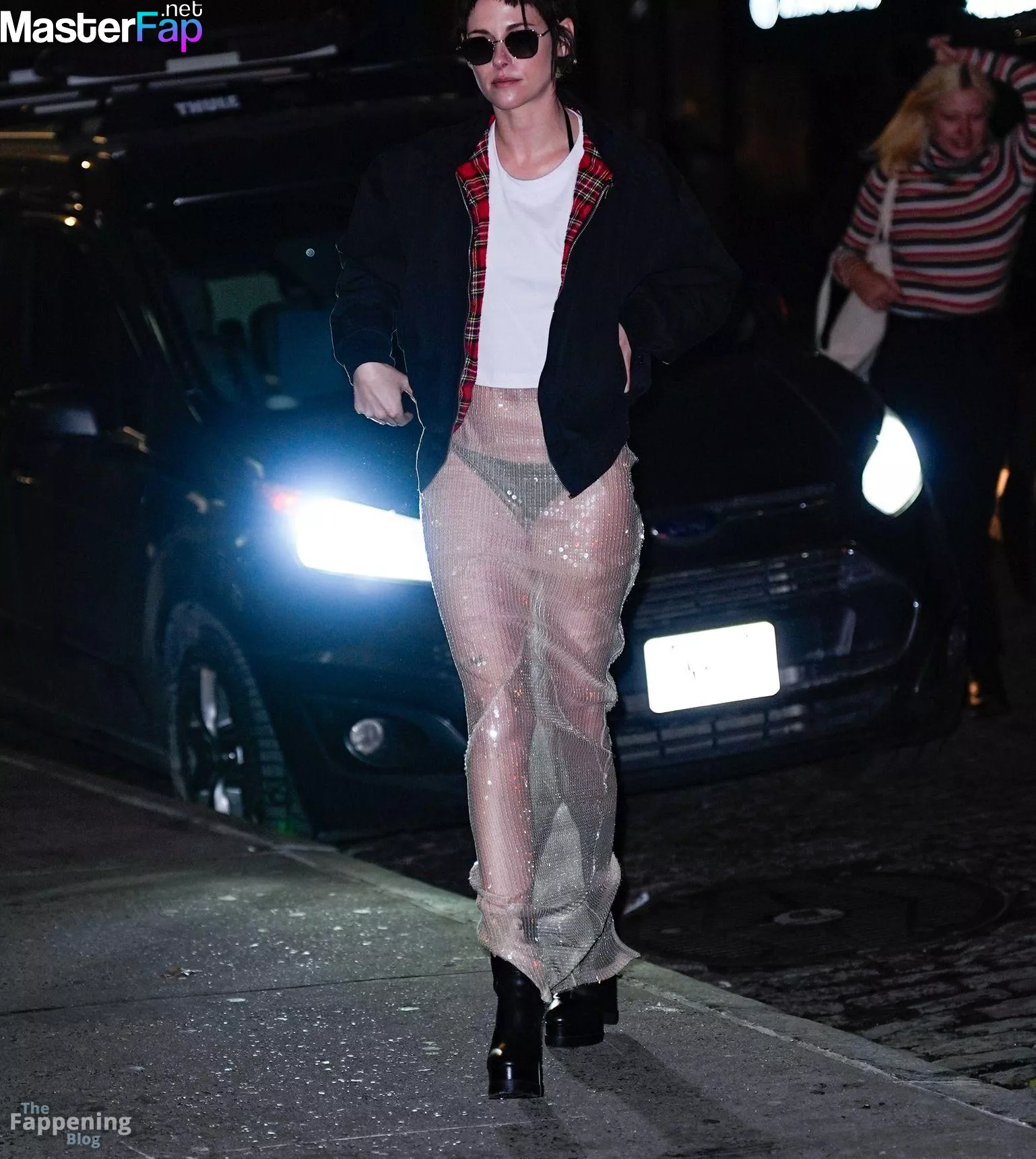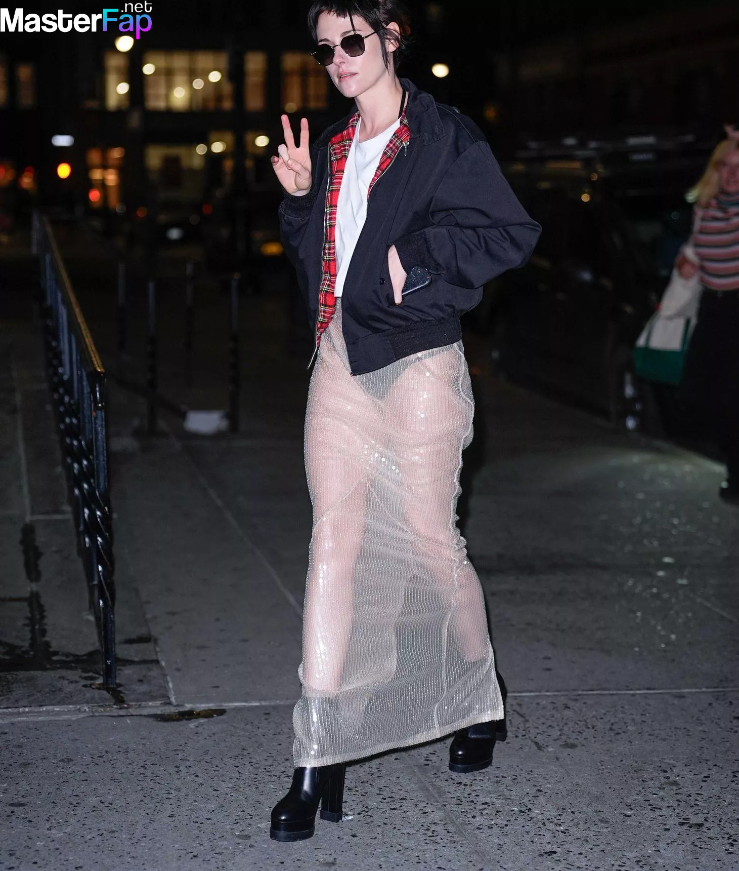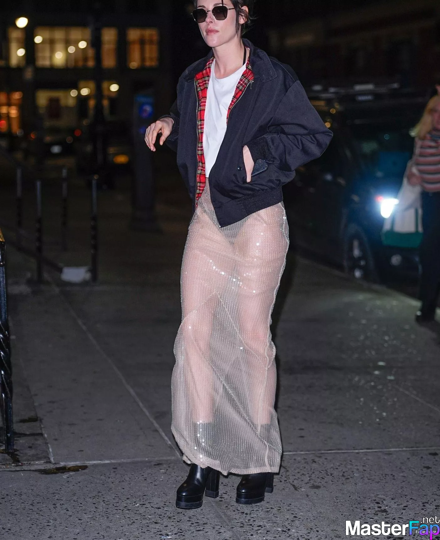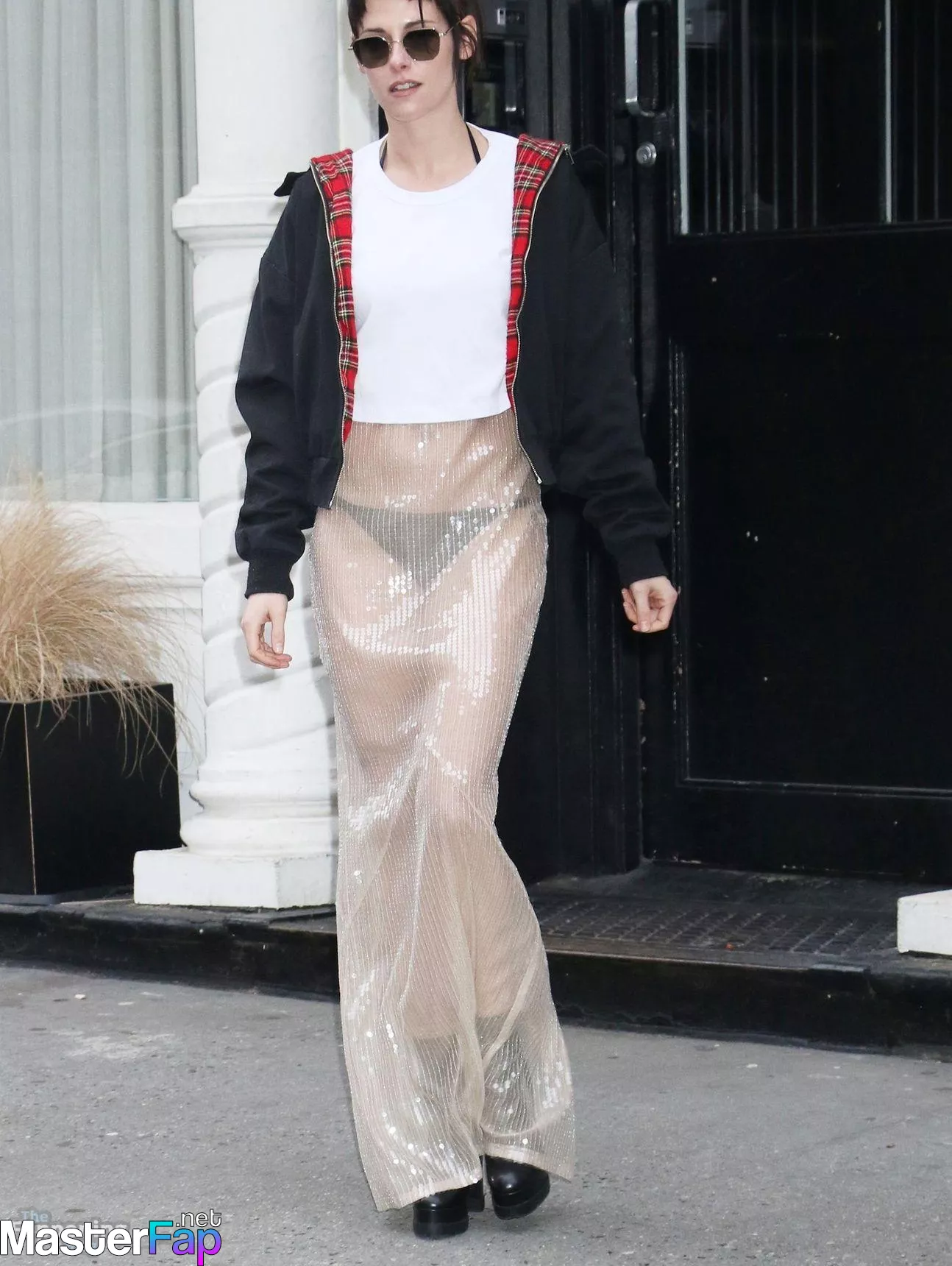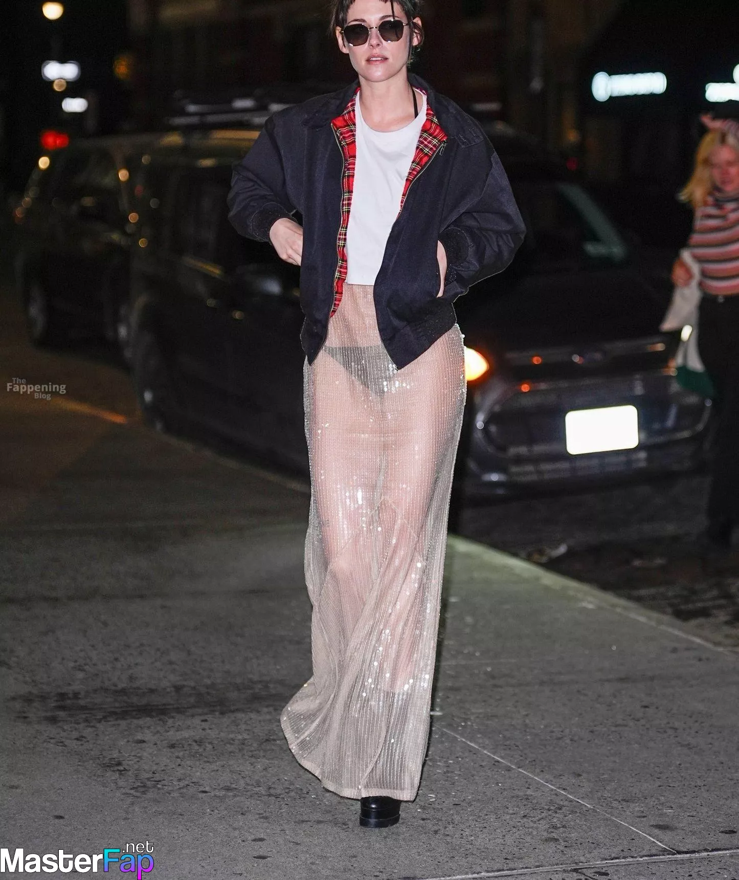 The Fappening Star Kristen Stewart steps out in a revealing outfit in New York City. The American actress wore a black jacket, white crop top, sheer skirt, and black platform heels.