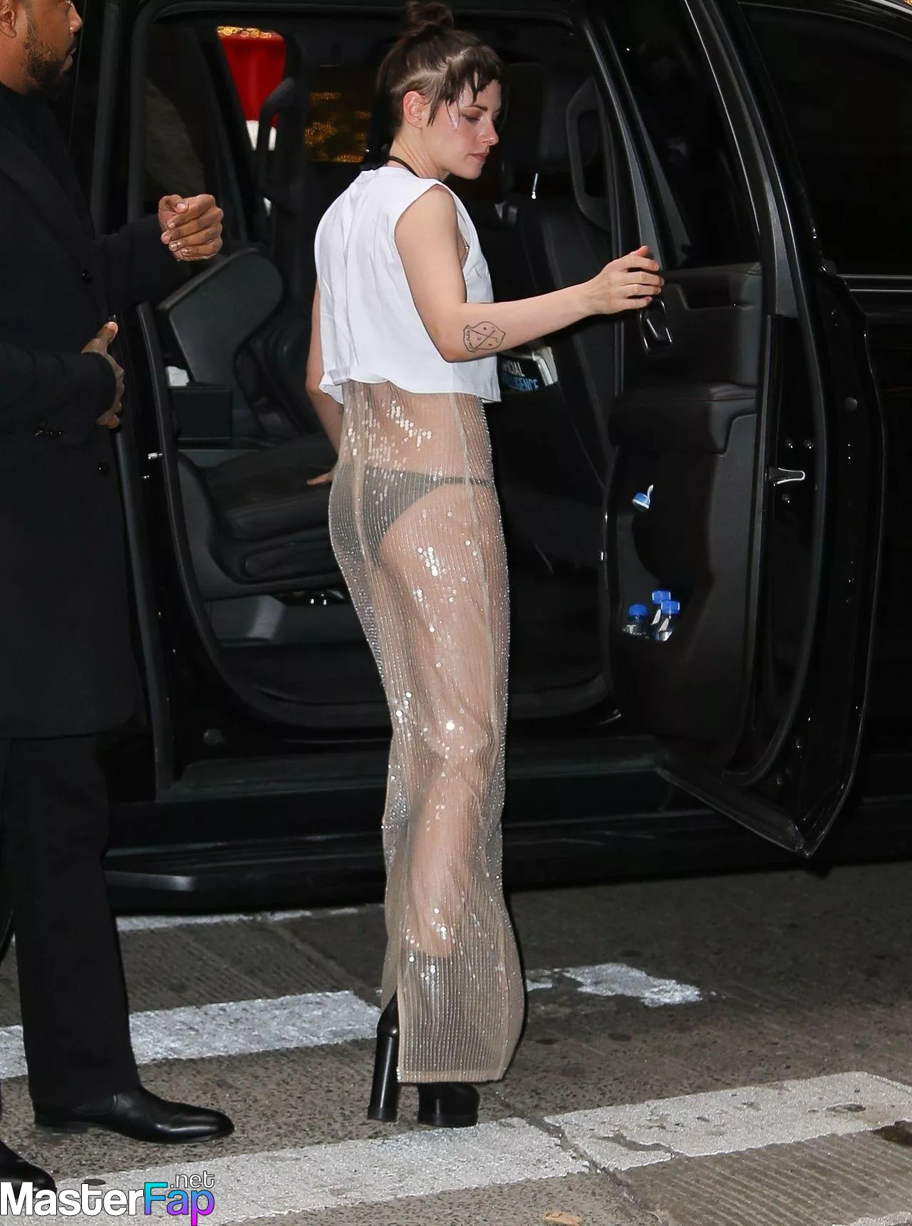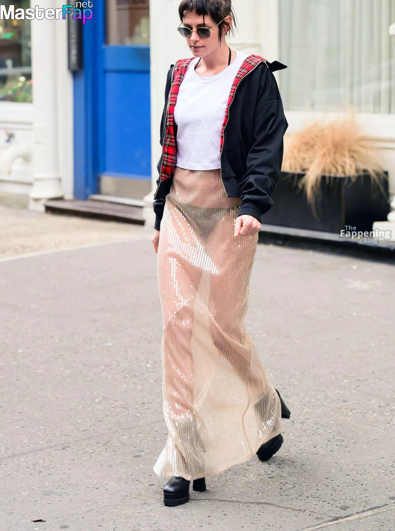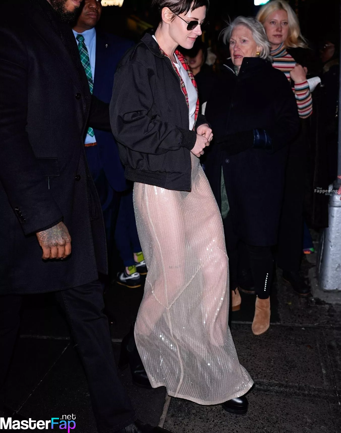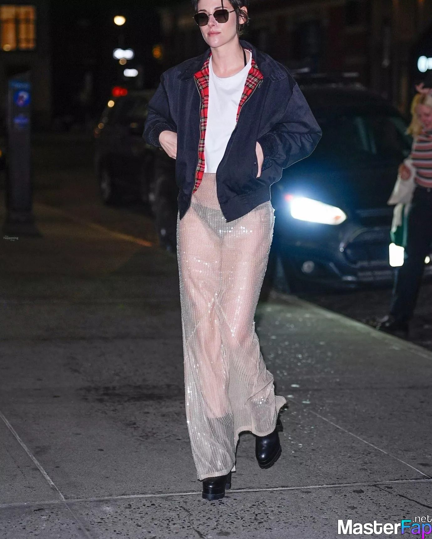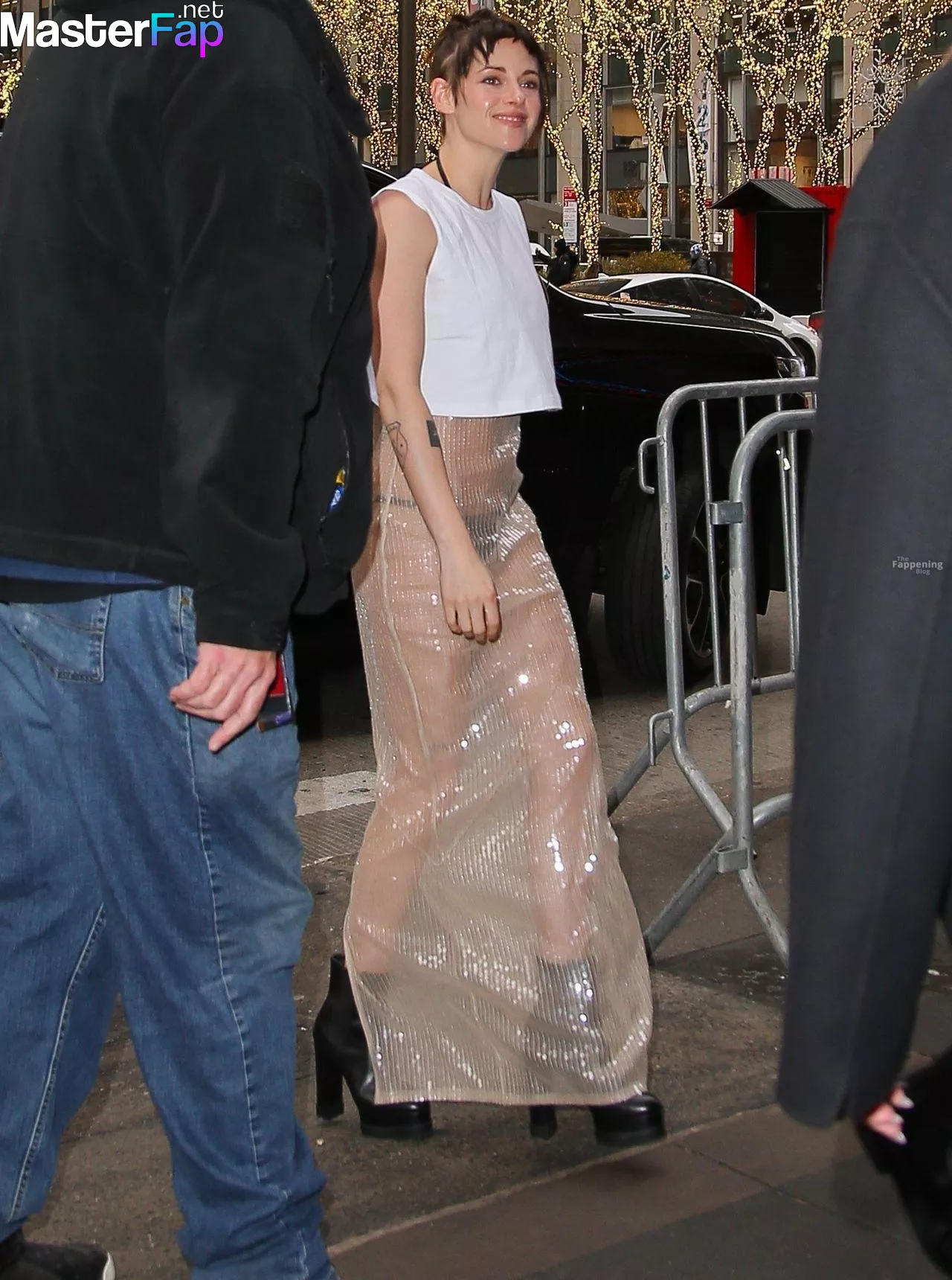 The Fappening Star Kristen Stewart steps out in a revealing outfit in New York City. The American actress wore a black jacket, white crop top, sheer skirt, and black platform heels.