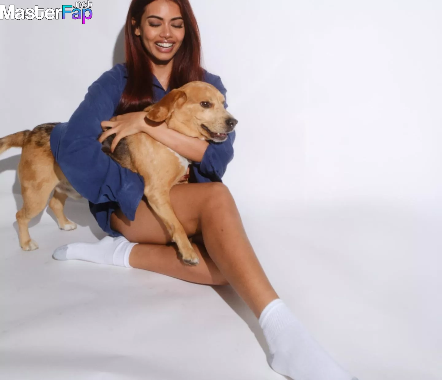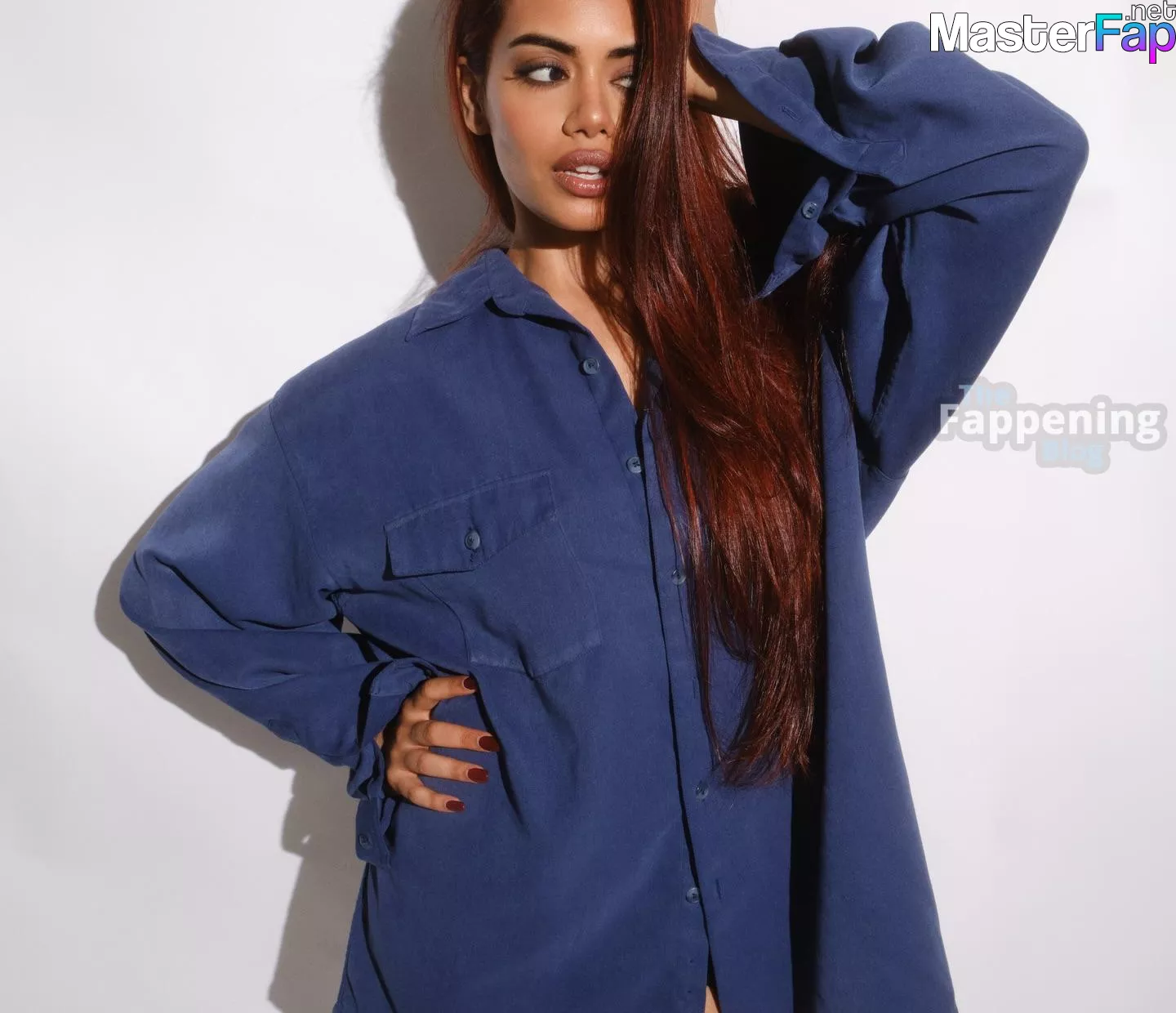 You’ve got to see Megan Suri’s new studio photos and videos. The actress looks absolutely effortless in an oversized blue denim shirt and white socks, lounging on the floor with her vibrant red hair cascading down.