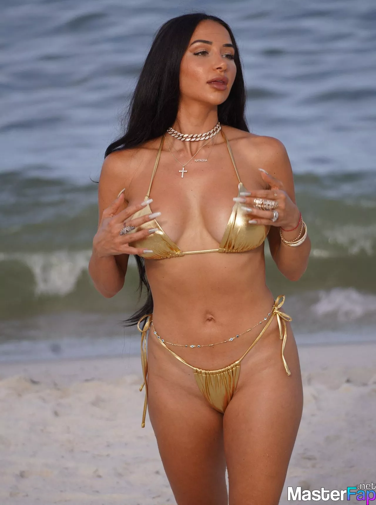 On July 16, 2023, life coach and motivational speaker Natasha Graziano was spotted wearing a gold bikini while relaxing on the beach.