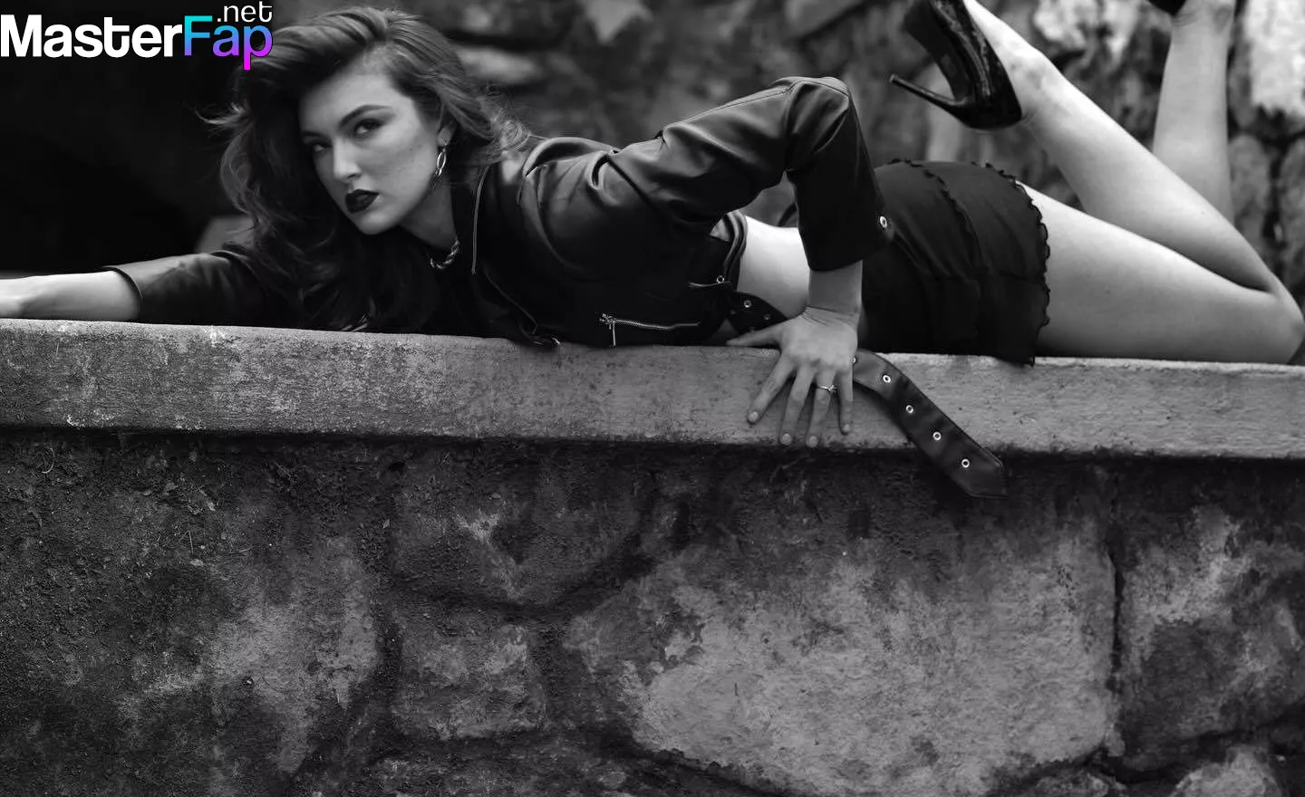 Rachel Pizzolato poses in a leather jacket and mini skirt, showing off her stunning curves, on-point cleavage, and killer legs in a photoshoot by Coveney Inc.