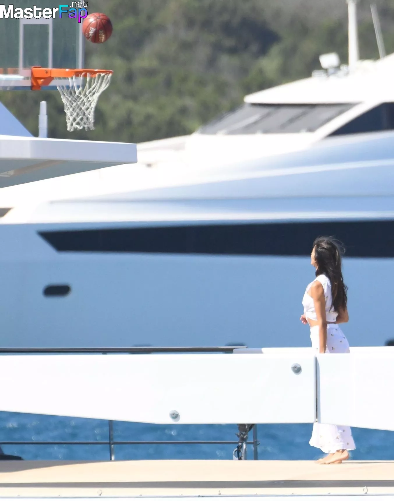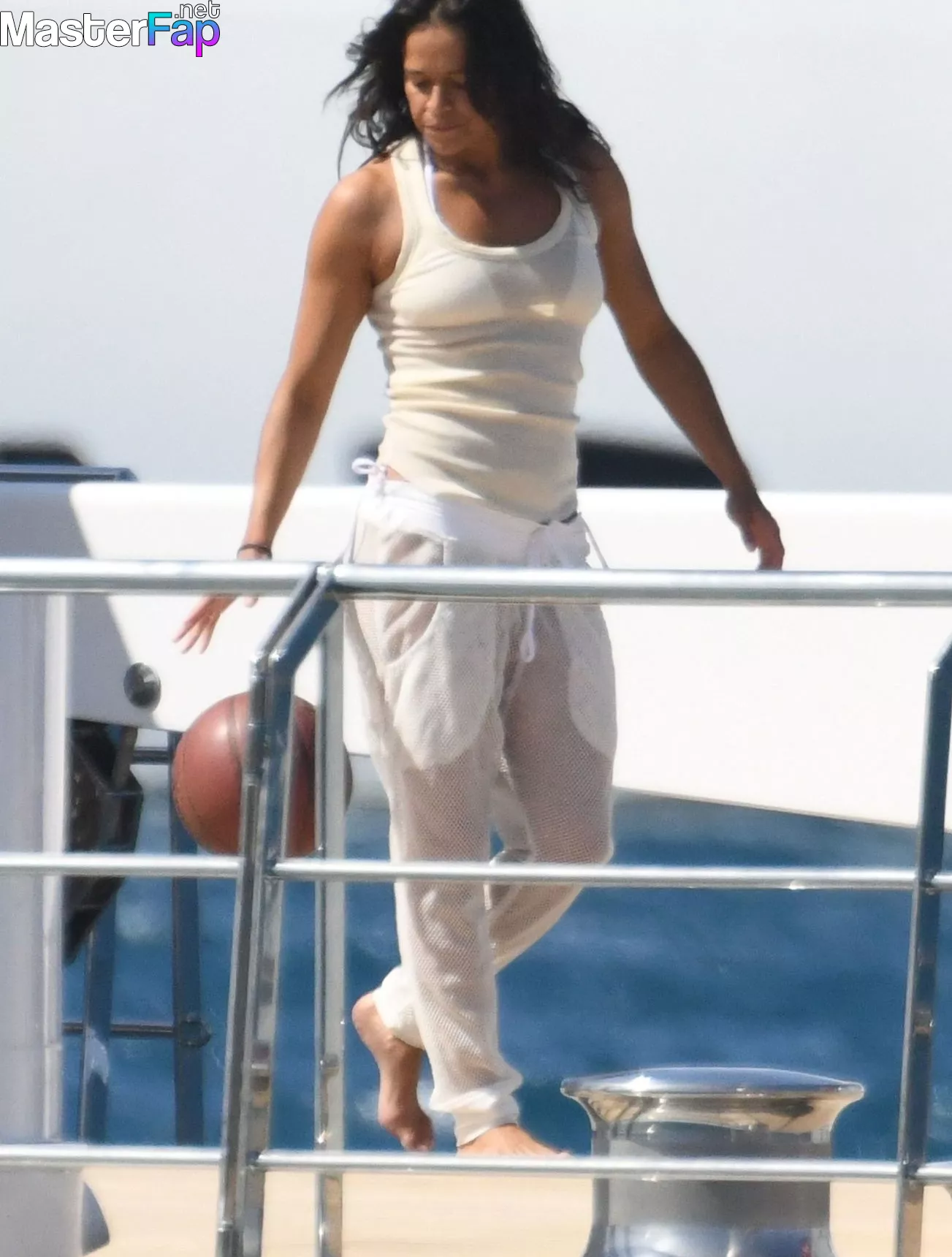 The American actress Michelle Rodriguez, who turned 45 earlier this month, continues to defy her age by showing off her basketball abilities while out on her beautiful boat. This photo was taken on July 26, 2023.Along with the Mexican actress Eiza González and the Saudi film producer Mohammed Al Turki, the star of "The Fast and the Furious" took advantage of the lovely sunlight in Sardinia to get in a few hoops games while on vacation there.