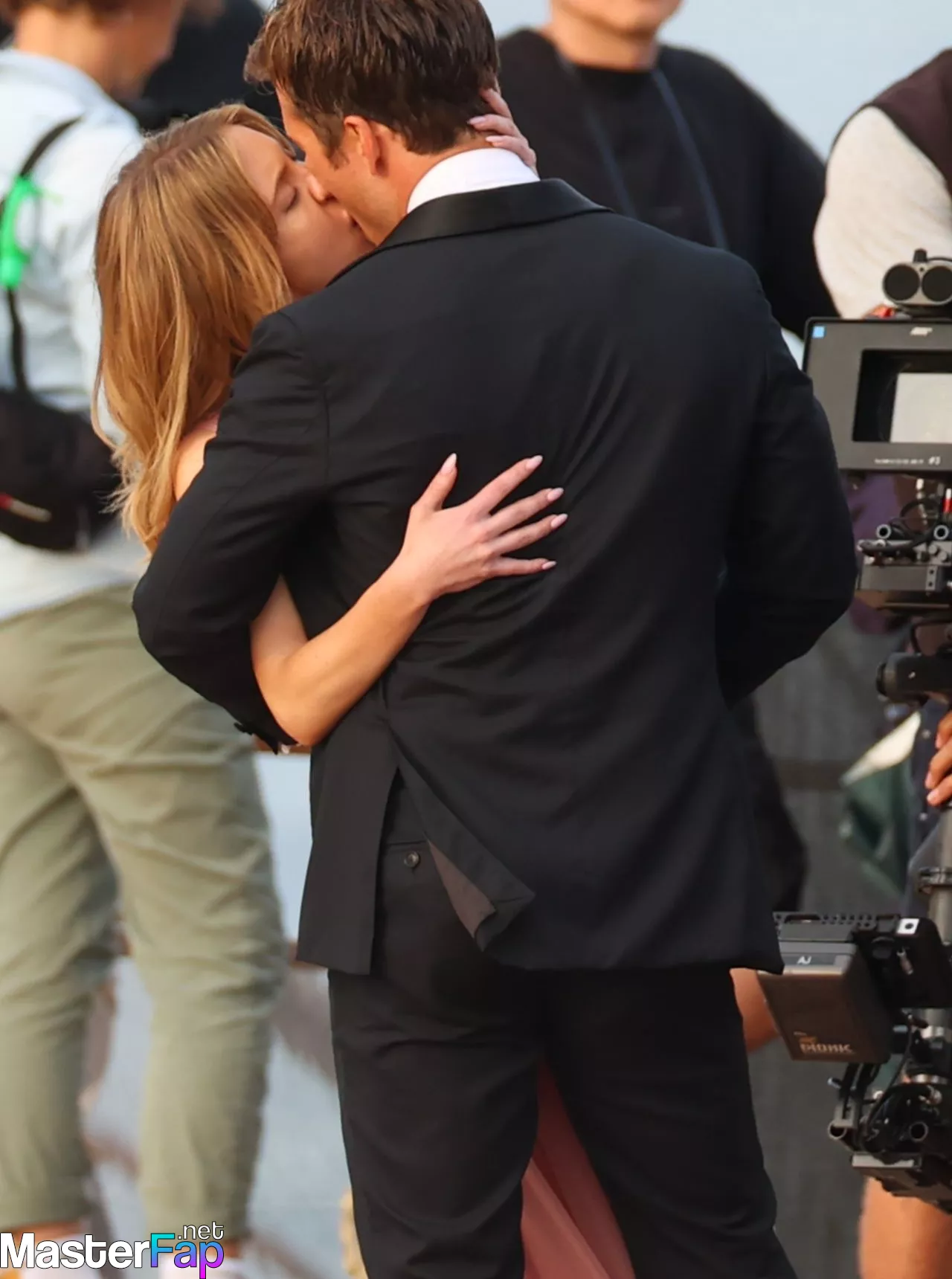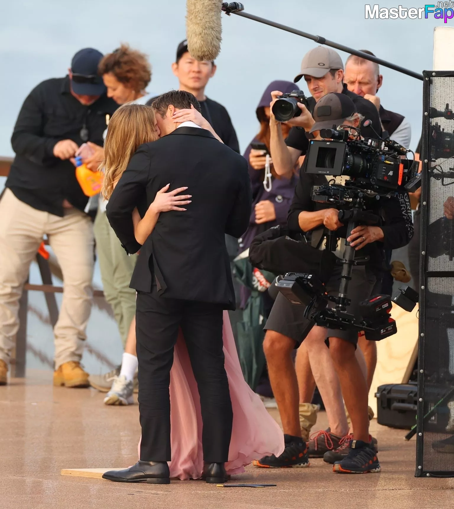 During the shooting of scenes for their upcoming movie, Sydney, 03/27/2023, co-stars Sydney Sweeney and Glen Powell can be seen locking lips in front of the Opera House.