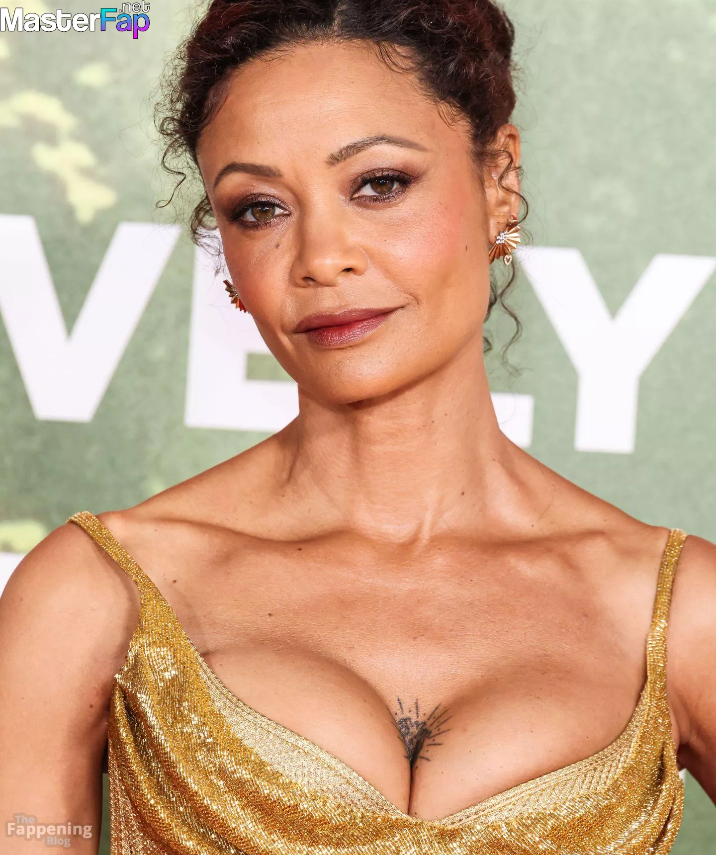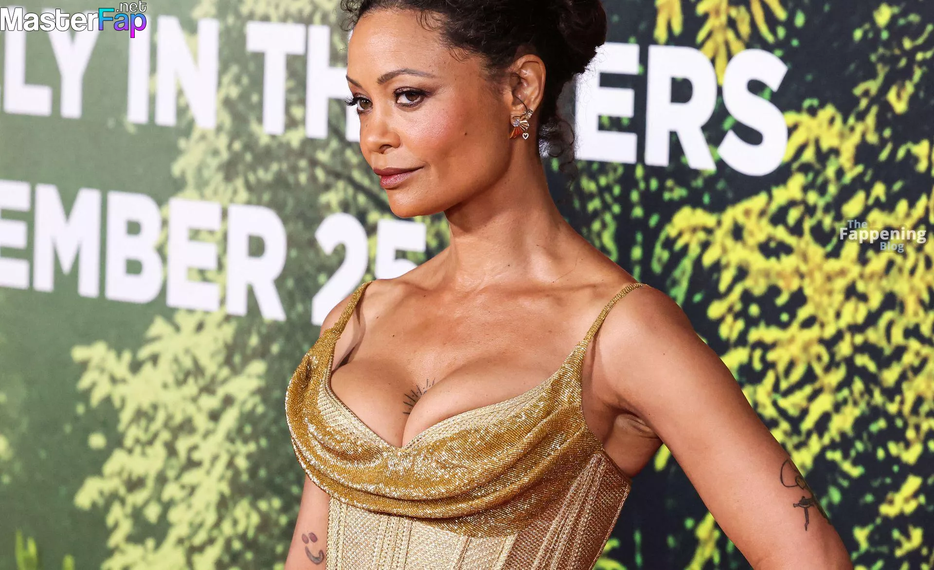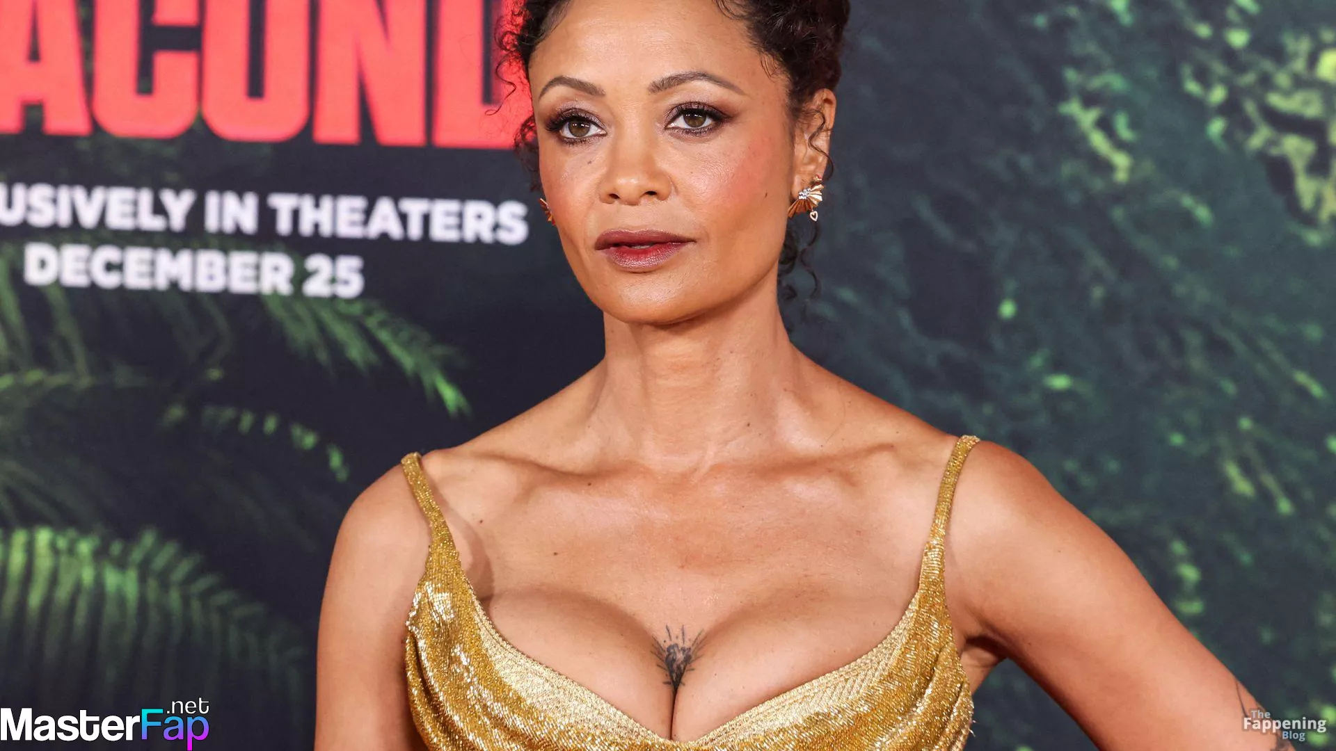 Thandie Newton (53) stuns in a golden dress at the “Anaconda” premiere at the United Theater on Broadway in Los Angeles. Check out her stunning red carpet photos below.