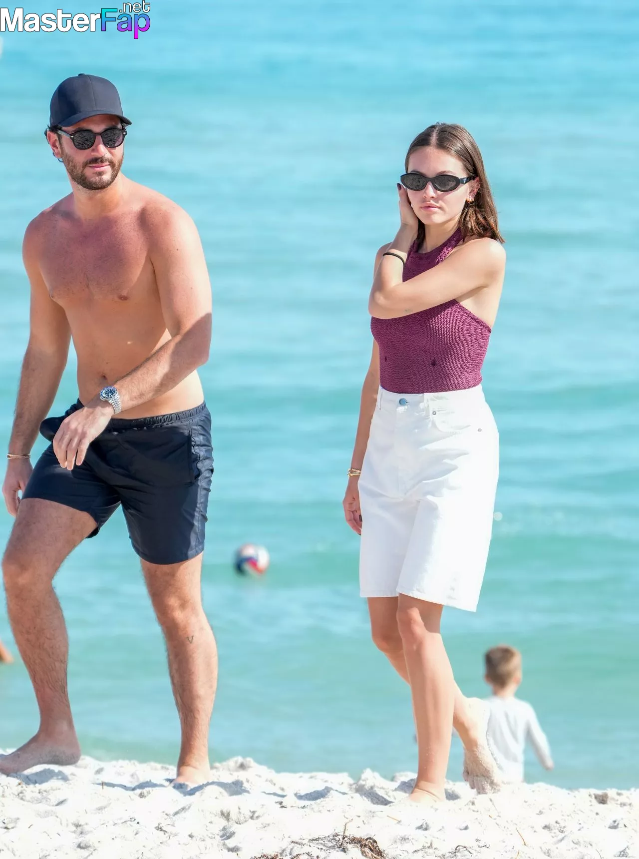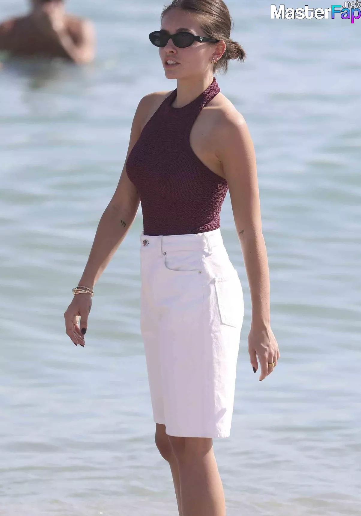 On the 27th of December in the year 2023, French model Thylane Blondeau is seen spending a day at the beach with her pals while wearing a maroon blouse without sleeves, dark brown slacks, and black frame sunglasses.