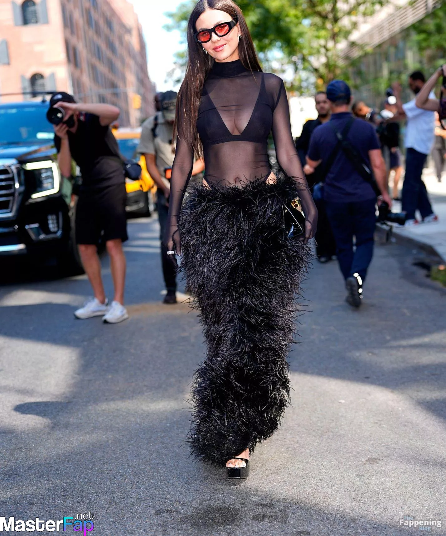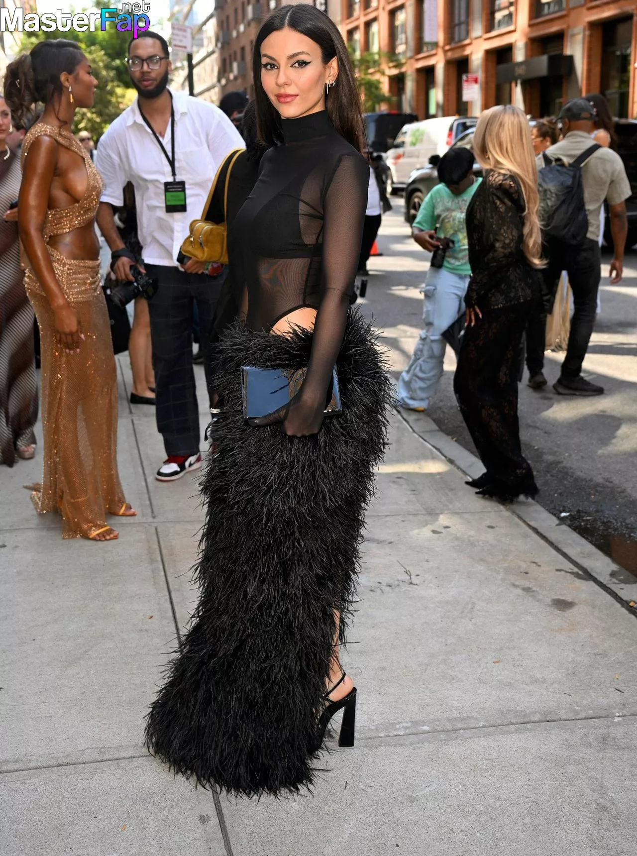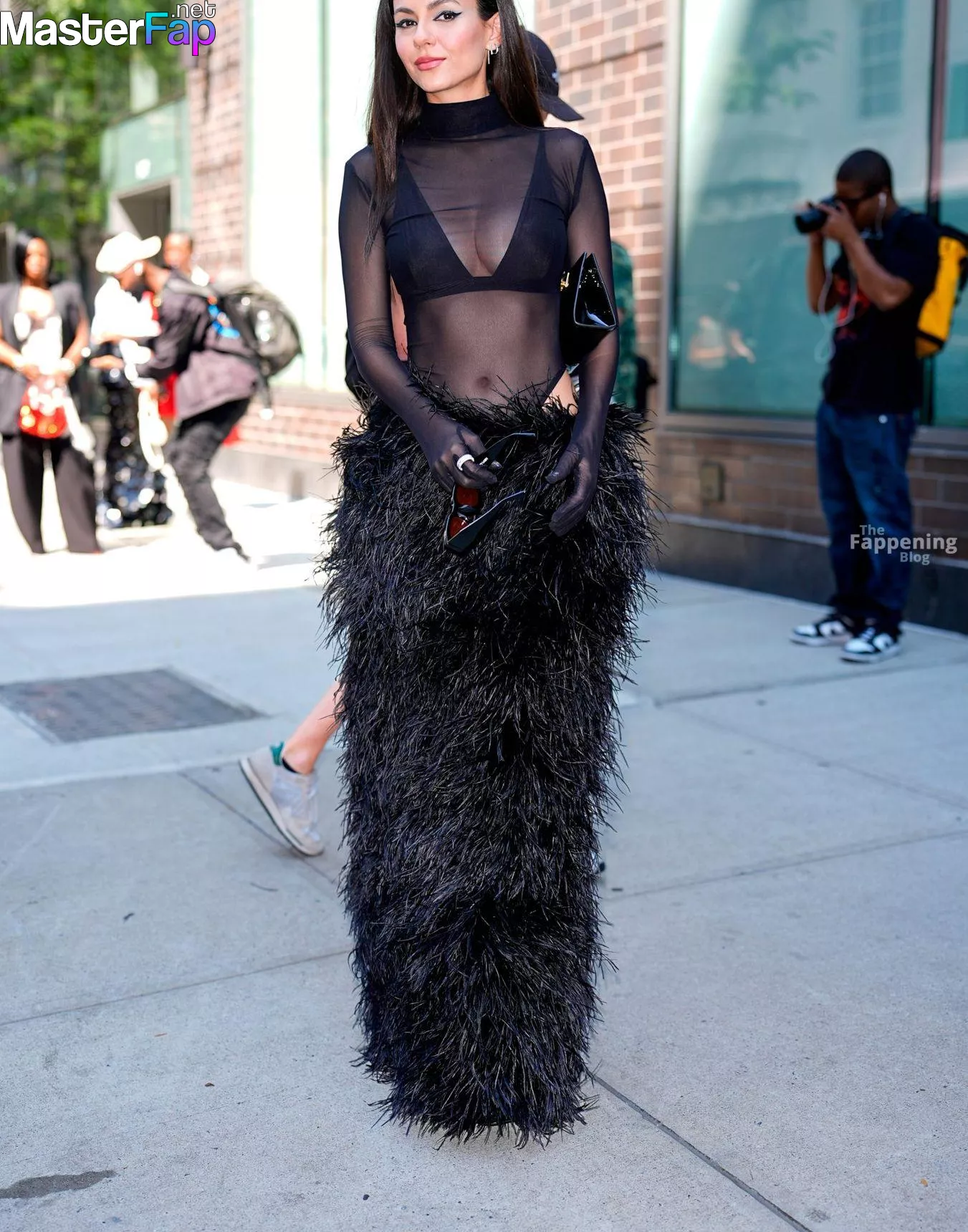 Victoria Justice was at Bronx and Banco’s NYFW show, rockin’ a sheer black mesh top, black bra, and a furry black maxi skirt. She topped off the bold high-fashion look with sunglasses and a black purse, spotted outside the show durin’ New York Fashion Week.