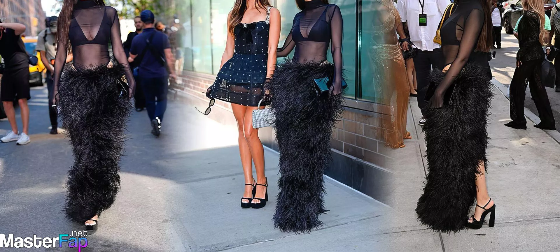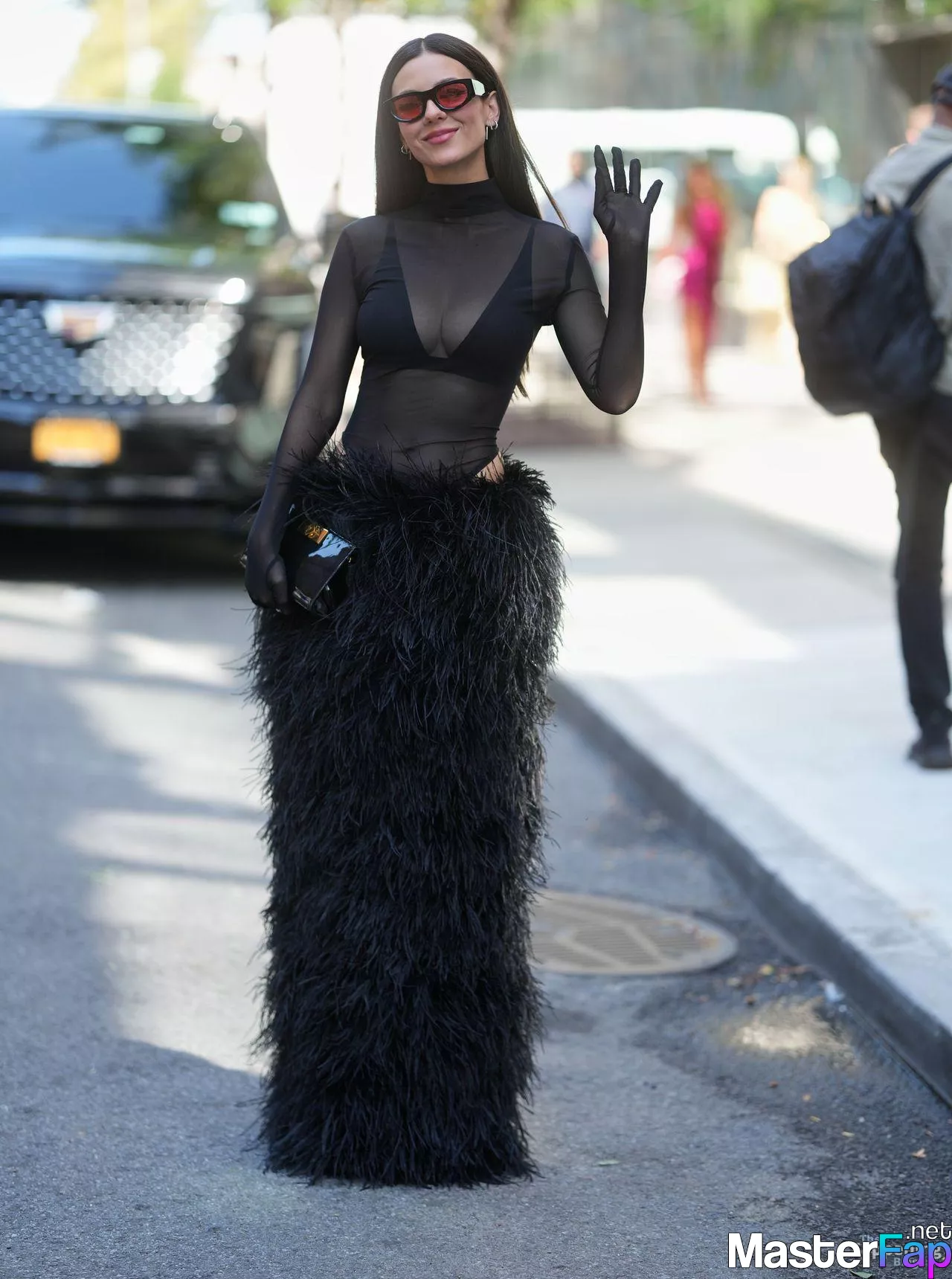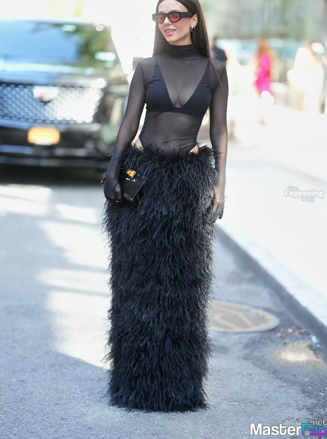 Victoria Justice was at Bronx and Banco’s NYFW show, rockin’ a sheer black mesh top, black bra, and a furry black maxi skirt. She topped off the bold high-fashion look with sunglasses and a black purse, spotted outside the show durin’ New York Fashion Week.